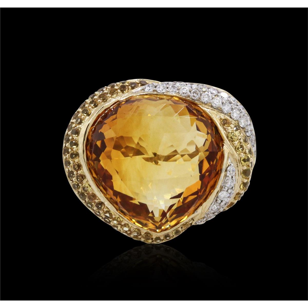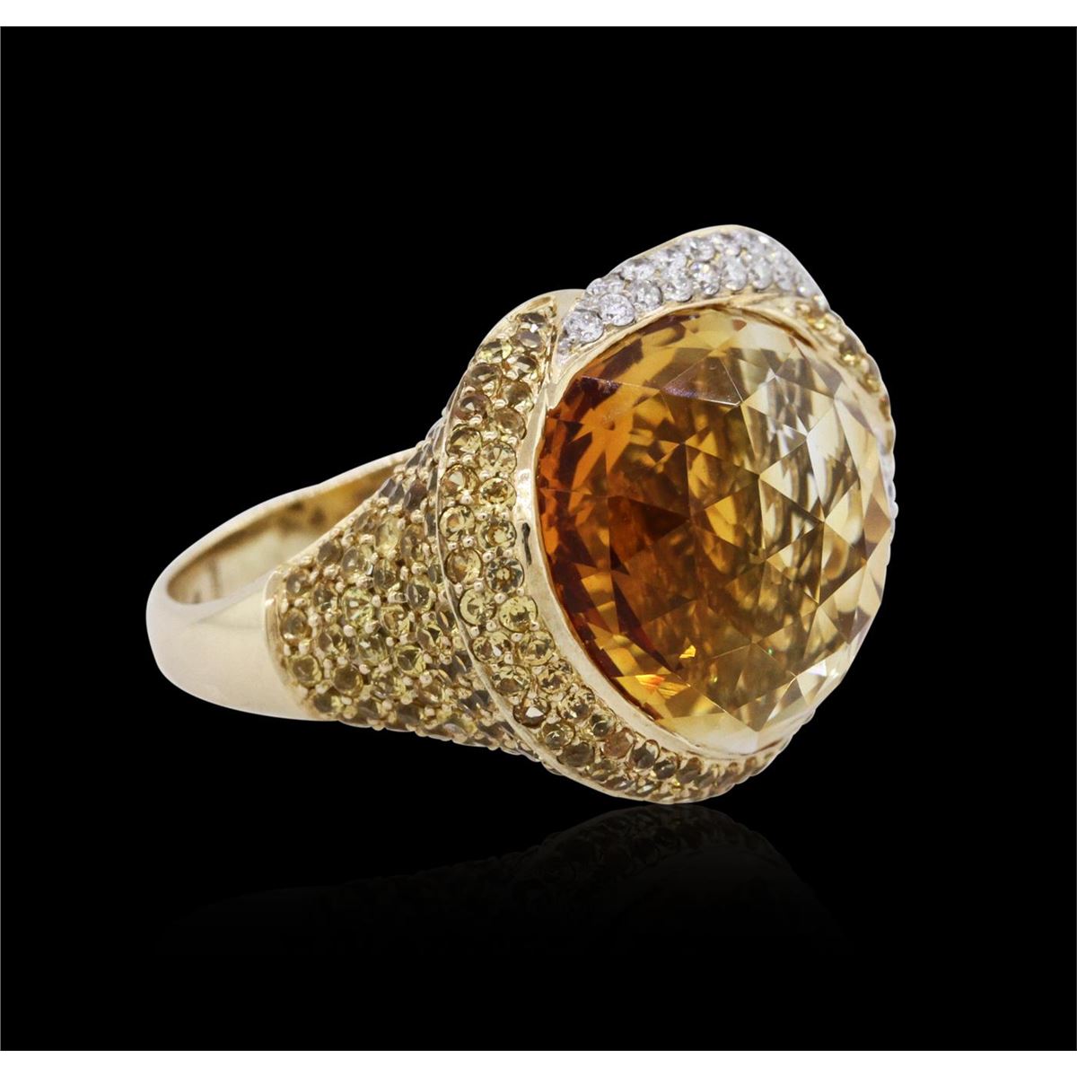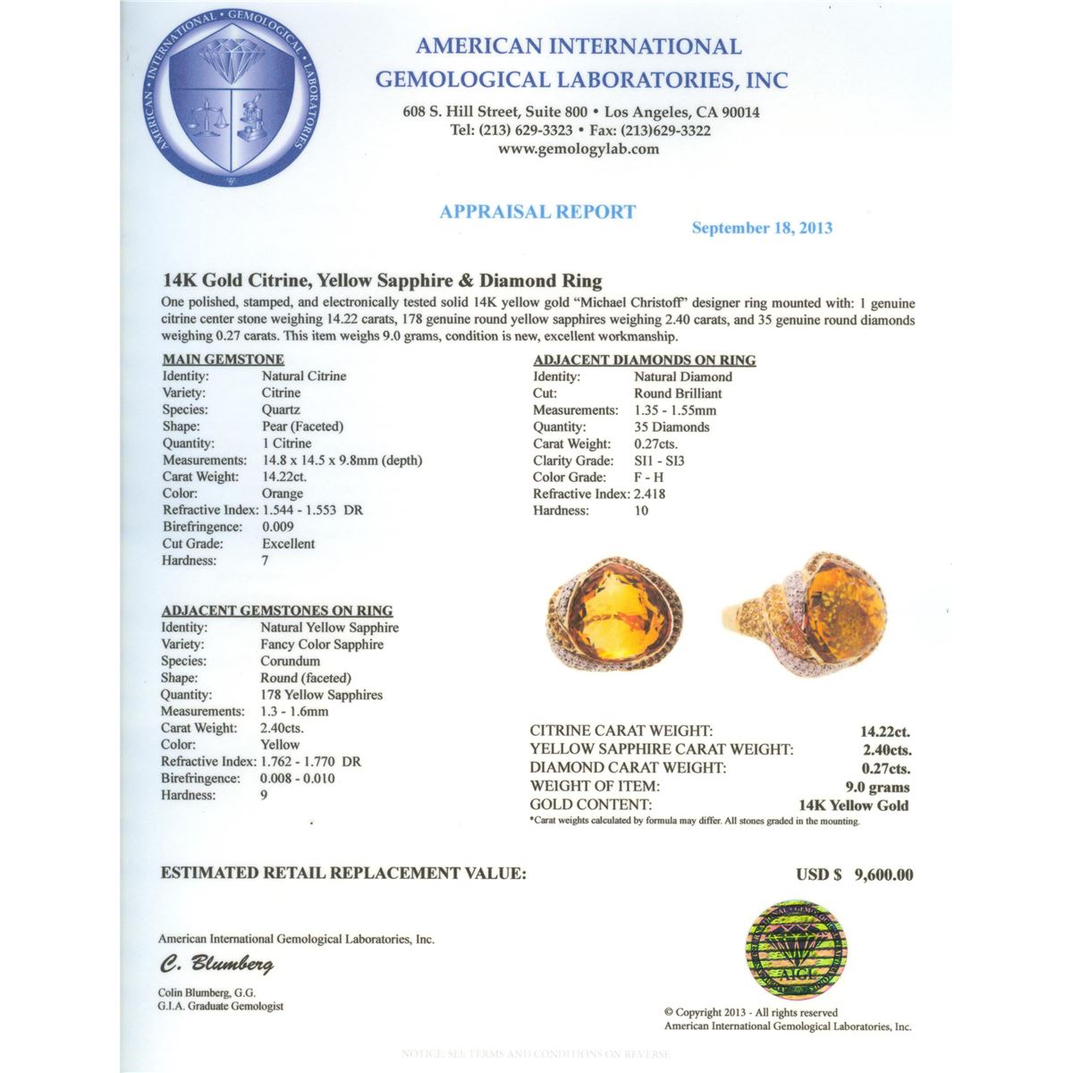 One polished, stamped, and electronically tested solid 14KT yellow gold Michael Christoff designer ring mounted with: 1 genuine citrine center stone weighing 14.22ct, 178 genuine round yellow sapphires weighing 2.40ct, and 35 genuine round diamonds weighing 0.27ct. This item weighs 9.00 grams, condition is new, excellent workmanship. AIGL Appraised at $9,600.00.