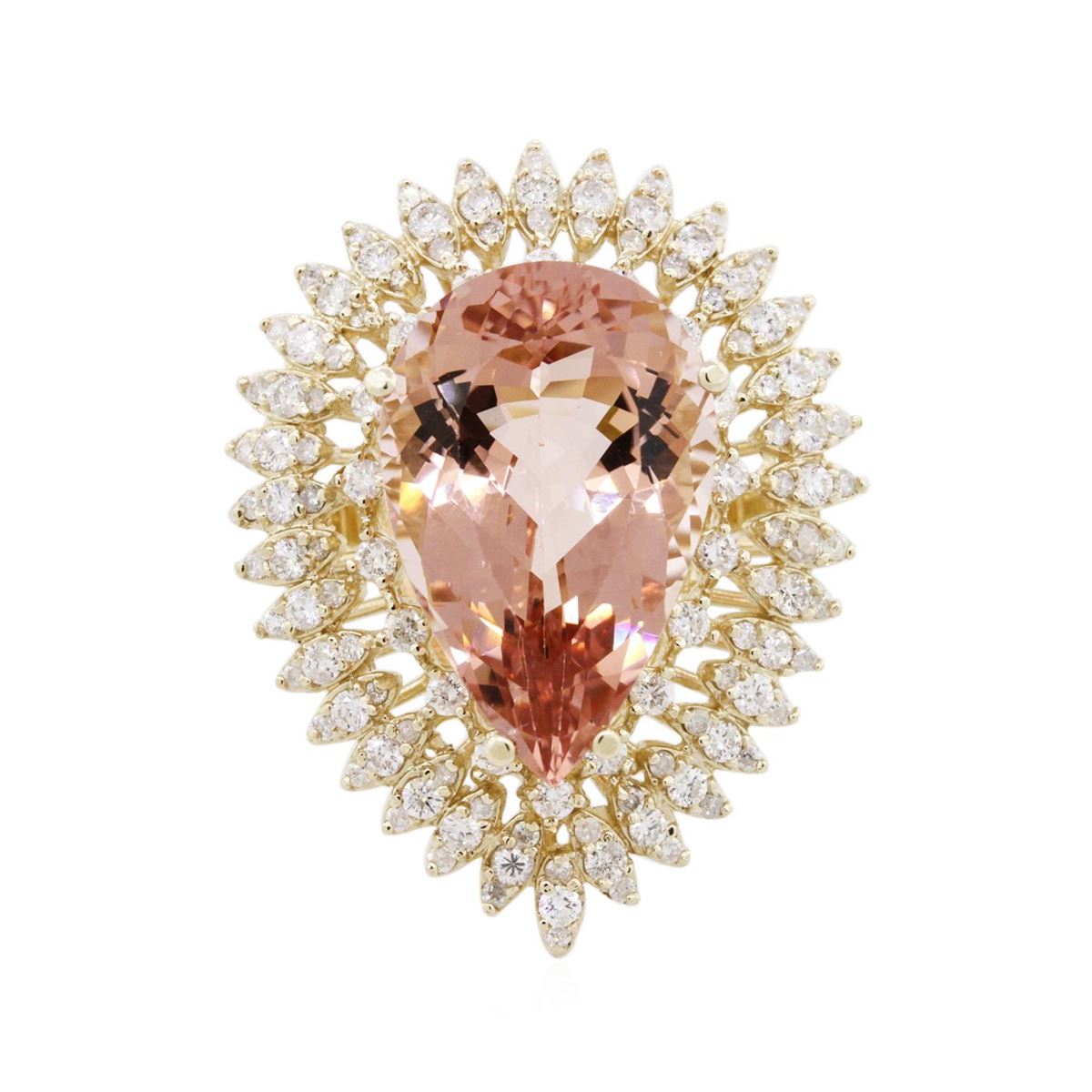 One electronically tested 14KT yellow gold ladies cast morganite & diamond ring with a bright finish. The featured morganite is set within a tiered diamond bezel, supported by a ribbed under gallery, completed by a three and one half millimeter wide band. Identified with markings of "K14". Condition is new, good workmanship. Containing: One prong set pear brilliant cut natural morganite, measuring 21.20 x 13.65 x 8.70mm, 4% bulge factor, approximate weight of 14.24ct., clarity is eye clean, type I, light, brownish, reddish orange color, (GIA rO 3/1), cut is good. Transmitting light with no distortion, transparent. Colored Stone Grading Report attached. Graded in the setting. One Hundred Twenty prong set round brilliant cut diamonds, measuring 1.80 - 1.00 x 0.84mm (depth est.) stated. Total Weight of 120 Stones = 1.00ct. Graded in the setting. Clarity: SI-2 to I-2. Color: G - H. Total Weight of Colored Stones 14.24ct. Total Weight of Diamonds 1.00ct. Total Weight of Ring 13.88 grams. AIG Appraised at $12,990.00.