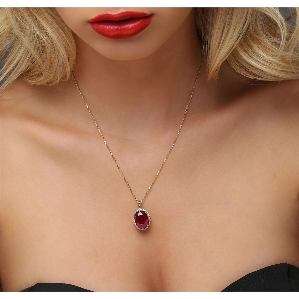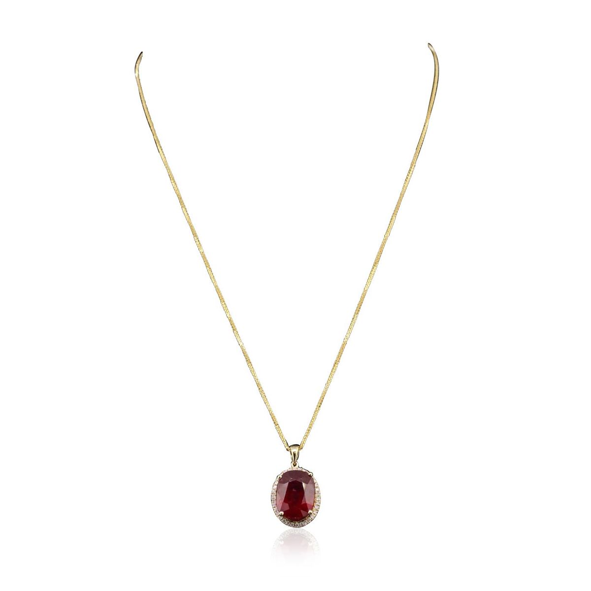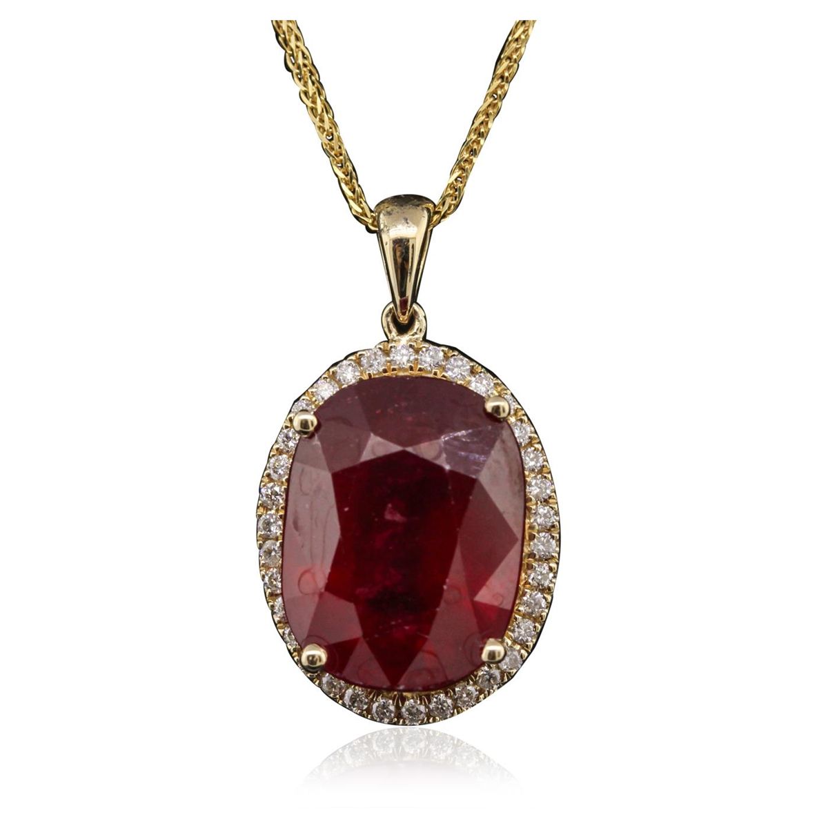 One electronically tested 14KT yellow gold ladies cast & assembled ruby and diamond pendant with chain. Condition is new, good workmanship. The pendant features a ruby set within a diamond bezel, completed by a yellow gold bail. The pendant is supported by an eighteen inch length 14KT yellow gold designer style chain, terminating in a lobster claw clasp. Bright polish finish. Identified with markings of "14K". Containing: One prong set rectangular cushion mixed cut natural ruby, measuring 14.90 x 11.40 x 7.80mm, 15%. bulge factor, approximate weight of 14.42ct., clarity is heavily included, type II, dark, very slightly brownish, slightly purplish red color, (GIA slpR 7/3), cut is good. Transmitting light somewhat diffusely, transparent to translucent. Naturally occurring internal & external characteristics are present. Indications of laboratory high temperature heat treatment, with glass & flux additives. Graded in the setting. Ruby has a low tolerance to rhodium plating, repolishing the surface, & ultrasonic cleaning. Thirty-Four prong set round brilliant cut diamonds, measuring 1.20 - 1.10 x 0.69mm (depth est.) approximate. Total Weight of 34 Stones = 0.28ct. Graded in the setting. Clarity: SI-2 to I-2. Color: G - I. Total Weight of Colored Stones 14.42ct. Total Weight of Diamonds 0.28ct. Total Weight of Pendant With Chain 6.72 grams. AIG Appraised at $4,510.00.