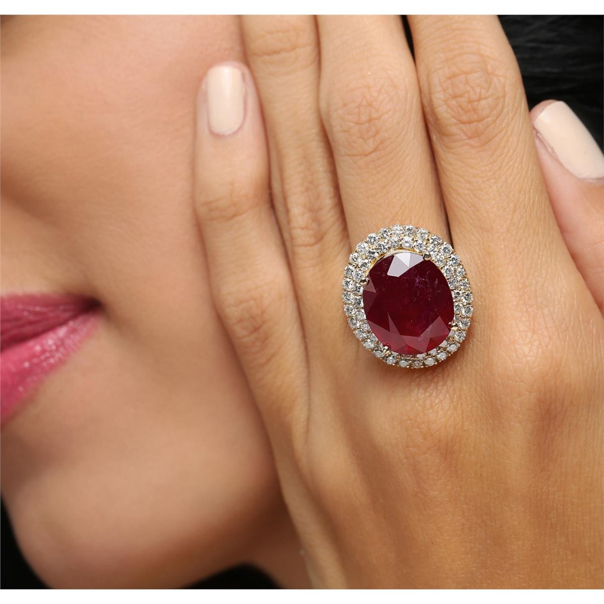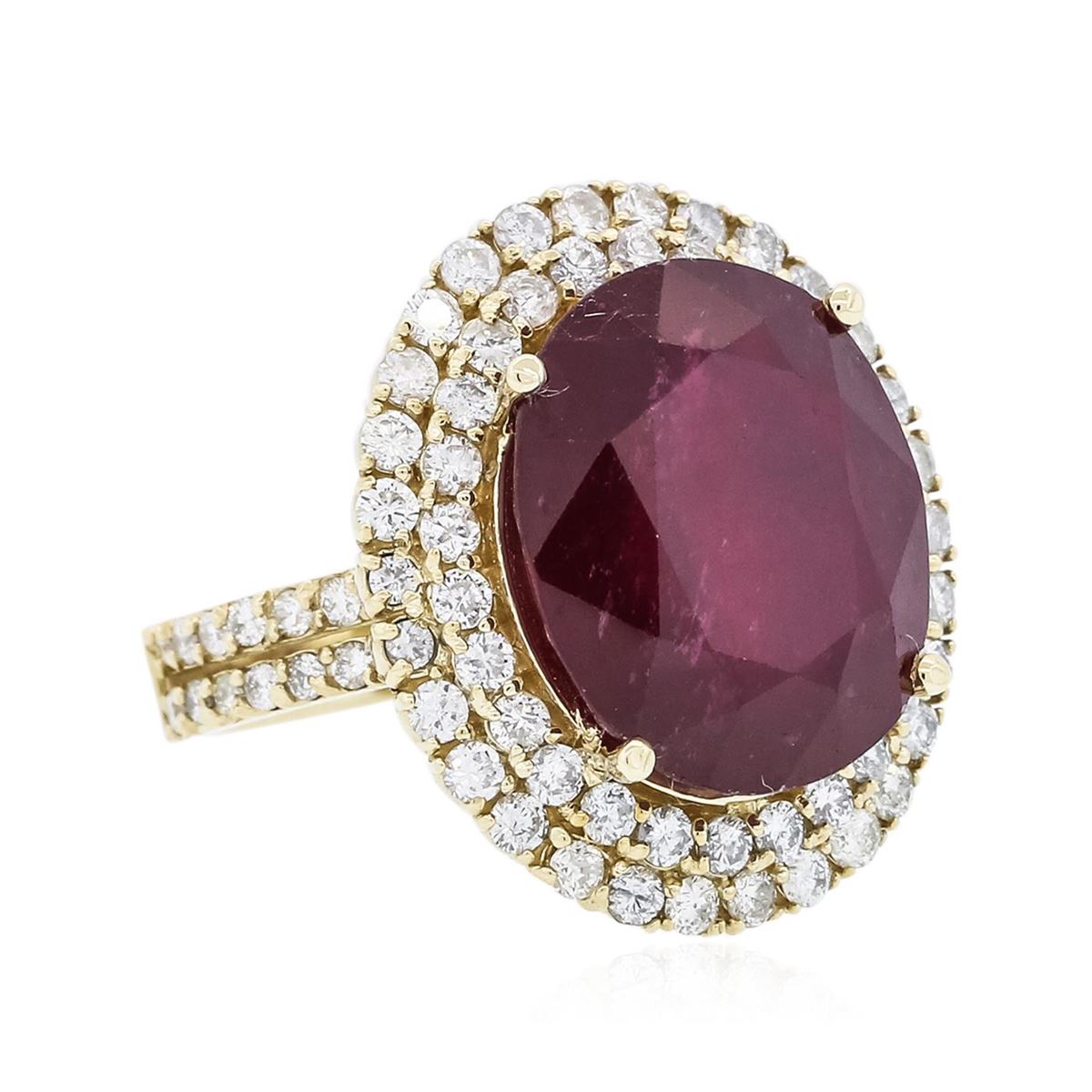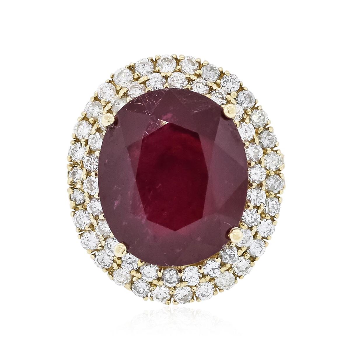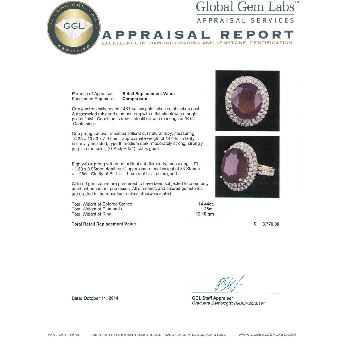 One electronically tested 14KT yellow gold ladies combination cast & assembled ruby and diamond ring with a flat shank with a bright polish finish. Identified with markings of "K14". Condition is new. Containing: One prong set oval modified brilliant cut natural ruby, measuring 16.38 x 13.83 x 7.91mm, approximate weight of 14.44ct., clarity is heavily included, type II, medium dark, moderately strong, strongly purplish red color, (GIA stpR 6/4), cut is good. Eighty-Four prong set round brilliant cut diamonds, measuring 1.70 - 1.50 x 0.96mm (depth est.) approximate total weight of 84 Stones = 1.25ct. Clarity: SI-1 to I-1. Color: I - J, Cut is Good. Colored gemstones are presumed to have been subjected to commonly used enhancement processes. All diamonds and colored gemstones are graded in the mounting, unless otherwise stated. Total Weight of Colored Stones 14.44ct. Total Weight of Diamonds 1.25ct. Total Weight of Ring 12.10 grams. GGL Appraised at $8,770.00.