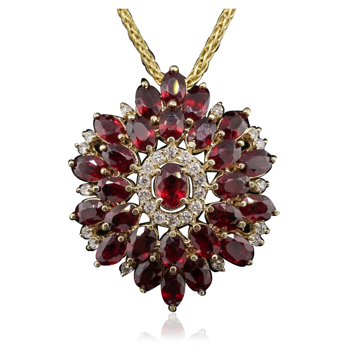 One electronically tested 14KT yellow gold Ladies combination cast & assembled pendant & chain 17.0" long, medium fancy cable link with a lobster claw clasp with a bright polish finish. Condition is new. Identified with markings of "14K". Containing: One prong set oval modified brilliant cut natural ruby, measuring 7.00 x 5.00 x 3.25mm, approximate. Total Weight of 0.94ct., clarity is heavily included, type II, medium dark, moderately strong, slightly purplish red color, (GIA slpR 6/4), cut is good. Twenty-six prong set oval modified brilliant cut natural rubies, measuring 6.00 x 4.00 x 2.60mm, approximate. Total Weight of 13.52ct., clarity is heavily included, type II, medium dark, moderately strong, slightly purplish red color, (GIA slpR 6/4), cut is good. Colored gemstones are presumed to have been subjected to commonly used color/clarity enhancement processes. Twenty-Eight prong set round brilliant cut diamonds, measuring 1.90 - 1.90 x 1.14mm (depth est.) approximate. Total Weight of 28 Stones = 0.70ct. Clarity: SI-2. Color: H - I, Cut is Good. Total Weight of Colored Stones 14.46ct. Total Weight of Diamonds 0.70ct. Total Weight of Pendant & Chain 20.70 grams. GGL Appraised at $11,850.00.