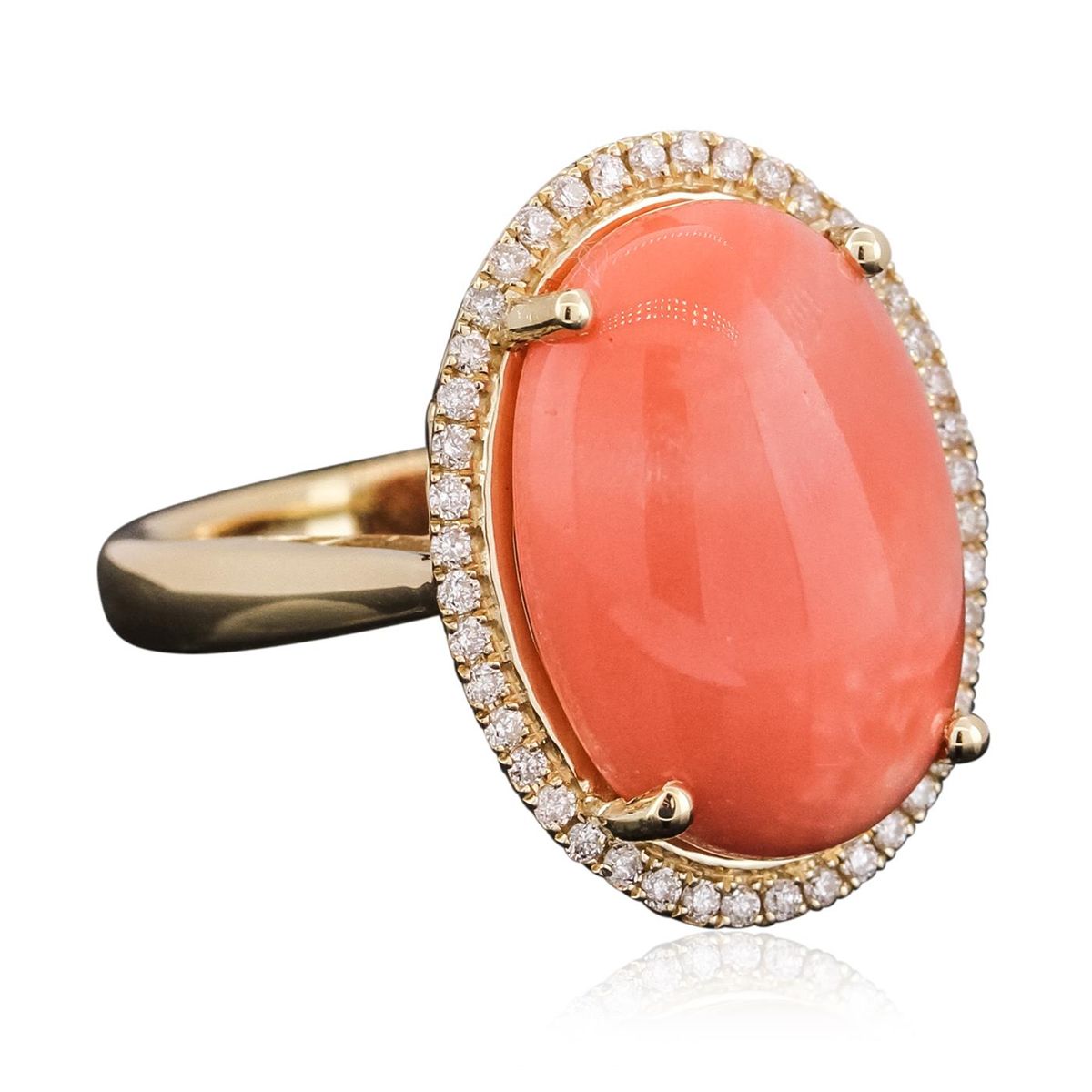 One electronically tested 14KT yellow gold ladies combination cast & assembled ring with a bright polish finish. Identified with markings of "14K". Condition is new. Containing: One prong set oval cabochon cut natural pink coral, measuring 18.13 x 13.12 x 8.53mm, approximate weight of 14.52ct., clarity is heavily included, medium light, moderately strong, pink color, (GIA Pk 4/4), cut is good. Forty-Three prong set round brilliant cut diamonds, measuring 1.10 - 1.10 x 0.66mm (depth est.) approximate total weight of 43 Stones = 0.21ct. Clarity: I-1 to I-2. Color: K - L, Cut is Good. Colored gemstones are presumed to have been subjected to commonly used enhancement processes. All diamonds and colored gemstones are graded in the mounting, unless otherwise stated. Total Weight of Colored Stones 14.52ct. Total Weight of Diamonds 0.21ct. Total Weight of Ring 8.20 grams. GGL Appraised at $8,225.00.