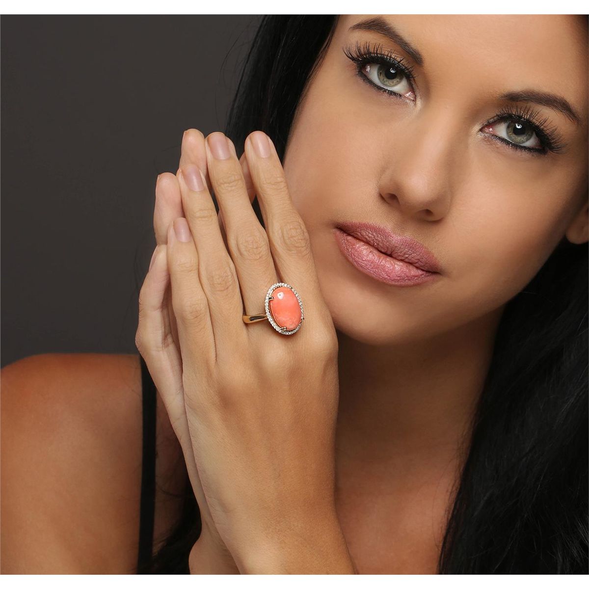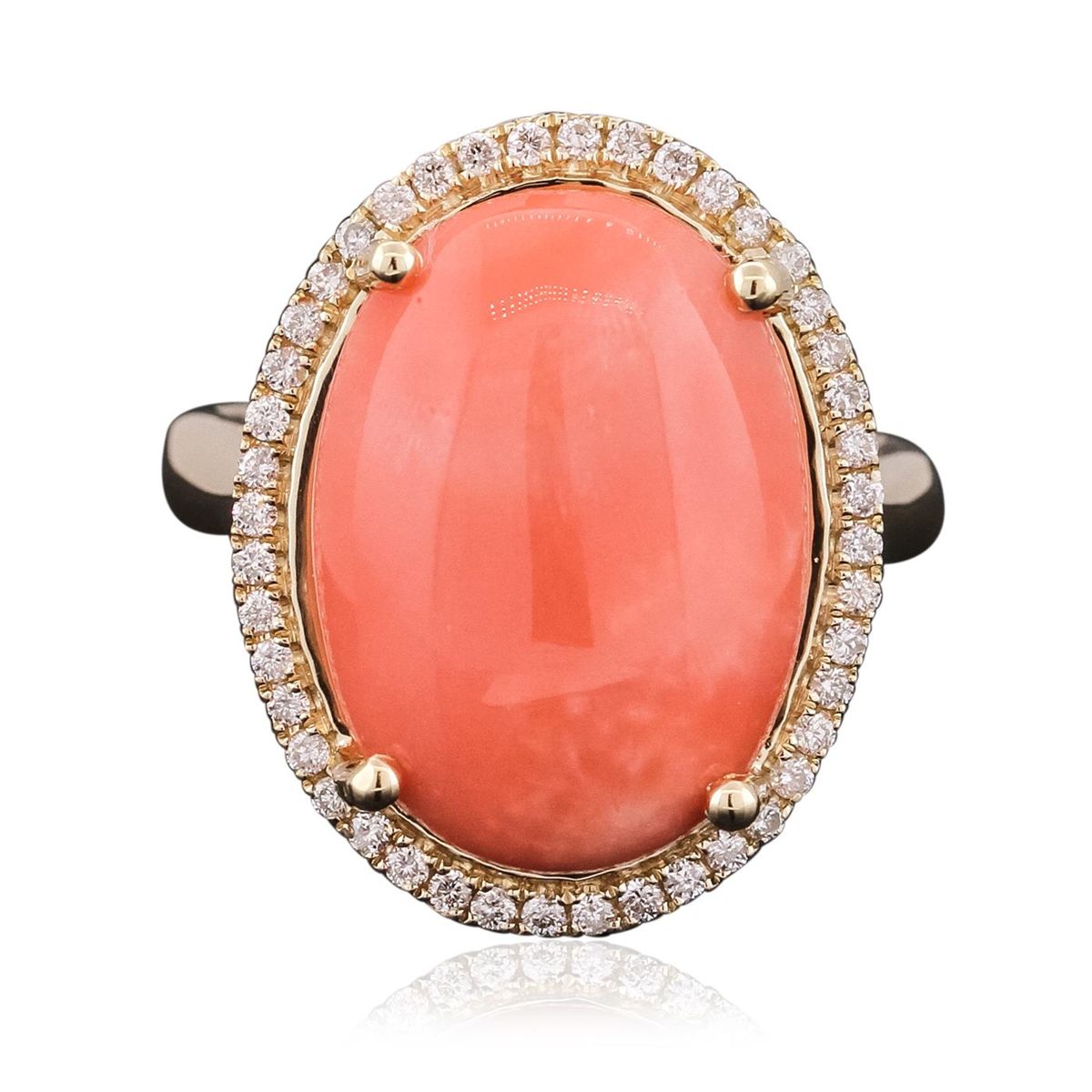 One electronically tested 14KT yellow gold ladies combination cast & assembled ring with a bright polish finish. Identified with markings of "14K". Condition is new. Containing: One prong set oval cabochon cut natural pink coral, measuring 18.13 x 13.12 x 8.53mm, approximate weight of 14.52ct., clarity is heavily included, medium light, moderately strong, pink color, (GIA Pk 4/4), cut is good. Forty-Three prong set round brilliant cut diamonds, measuring 1.10 - 1.10 x 0.66mm (depth est.) approximate total weight of 43 Stones = 0.21ct. Clarity: I-1 to I-2. Color: K - L, Cut is Good. Colored gemstones are presumed to have been subjected to commonly used enhancement processes. All diamonds and colored gemstones are graded in the mounting, unless otherwise stated. Total Weight of Colored Stones 14.52ct. Total Weight of Diamonds 0.21ct. Total Weight of Ring 8.20 grams. GGL Appraised at $8,225.00.