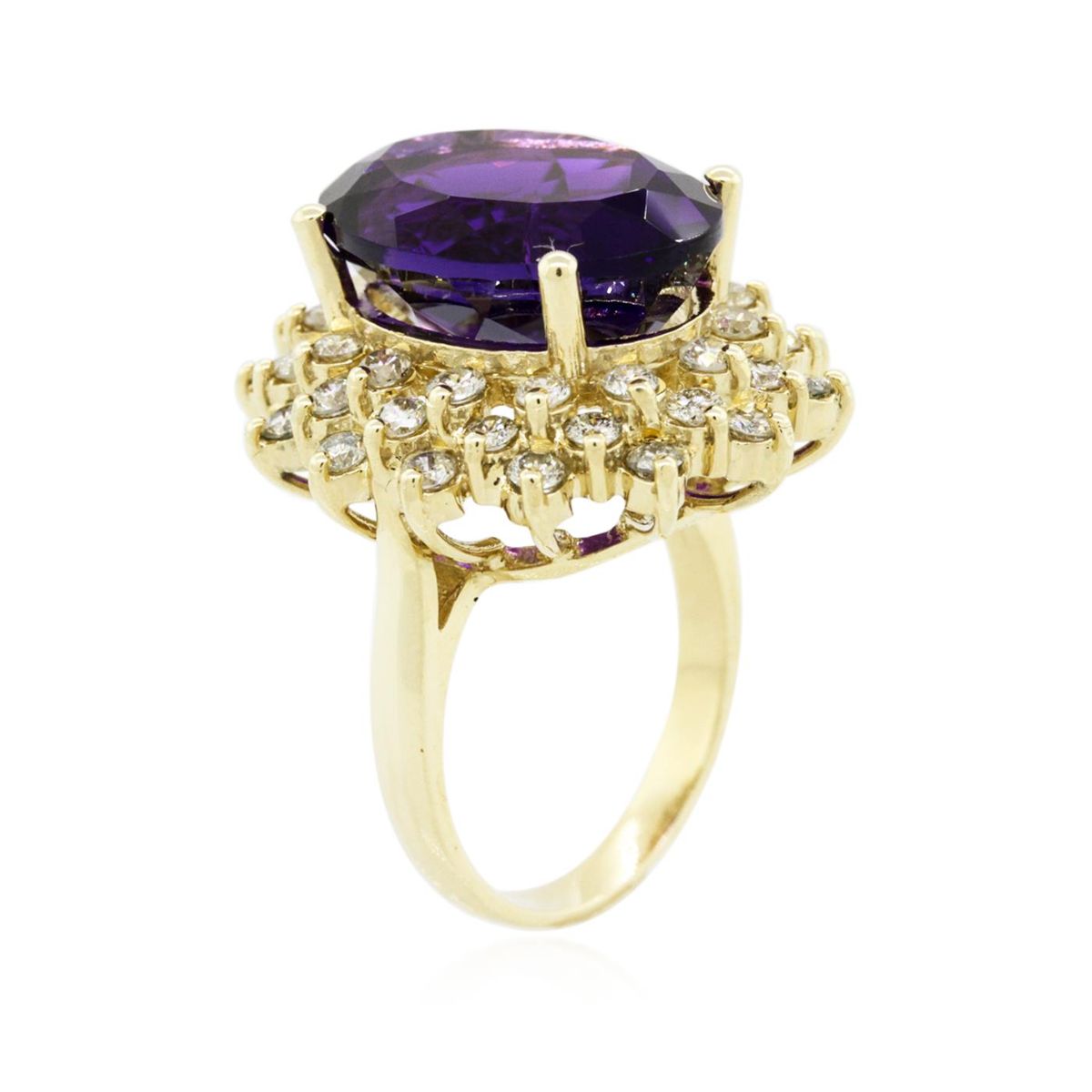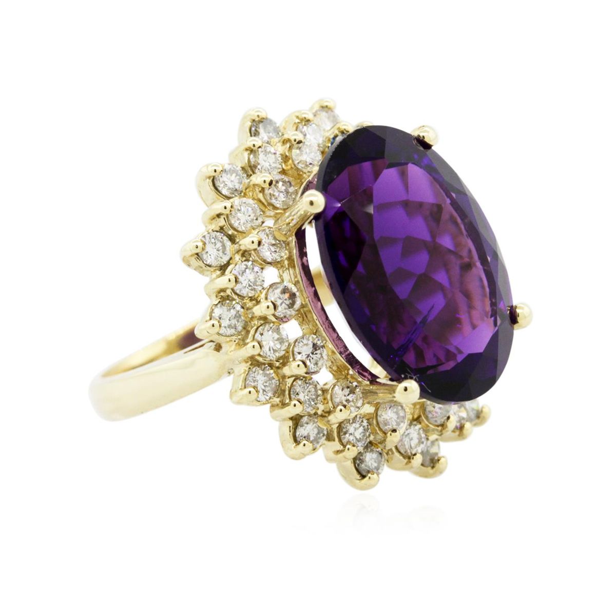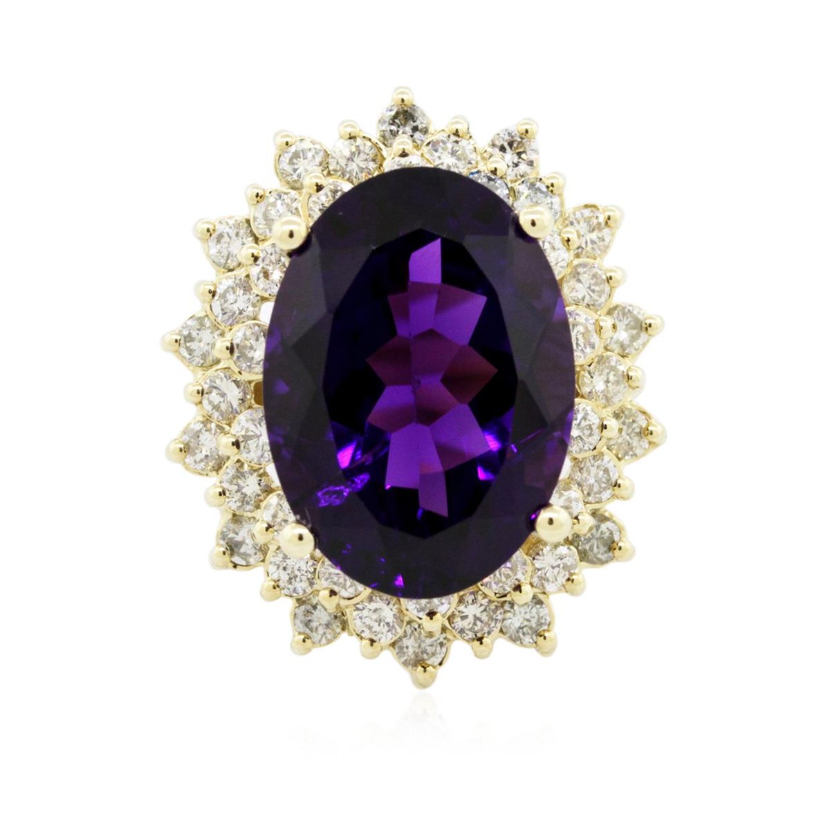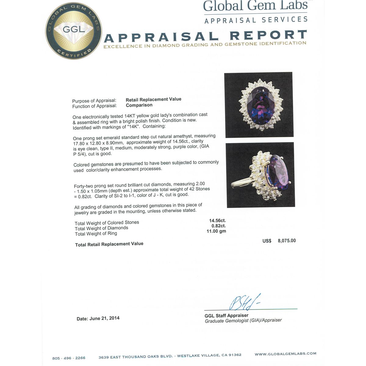 One electronically tested 14KT yellow gold Ladies combination cast & assembled ring with a bright polish finish. Condition is new. Identified with markings of "14K". Containing: One prong set emerald standard step cut natural amethyst, measuring 17.80 x 12.80 x 8.90mm, approximate weight of 14.56ct., clarity is eye clean, type II, medium, moderately strong, purple color, (GIA P 5/4), cut is good. Colored gemstones are presumed to have been subjected to commonly used color/clarity enhancement processes. Forty-Two prong set round brilliant cut diamonds, measuring 2.00 - 1.50 x 1.05mm (depth est.) approximate. Total Weight of 42 Stones = 0.82ct. Clarity: SI-2 to I-1. Color: J - K, Cut is Good. All grading of diamonds and colored gemstones in this piece of jewelry are graded in the mounting, unless otherwise stated. Total Weight of Colored Stones 14.56ct. Total Weight of Diamonds 0.82ct. Total Weight of Ring 11.00 grams. GGL Appraised at $8,075.00.
