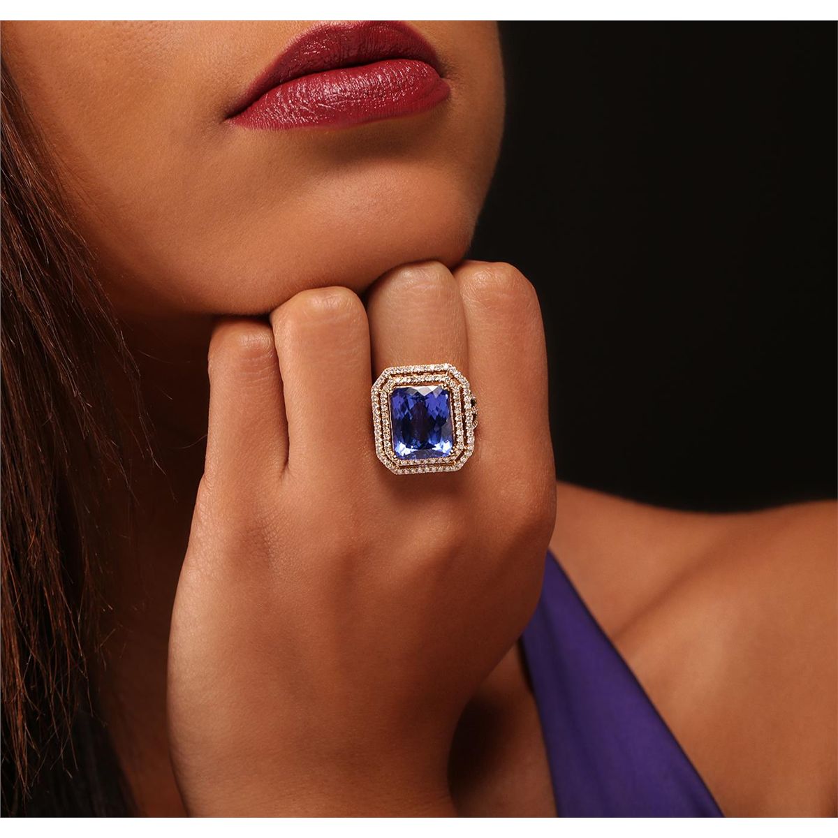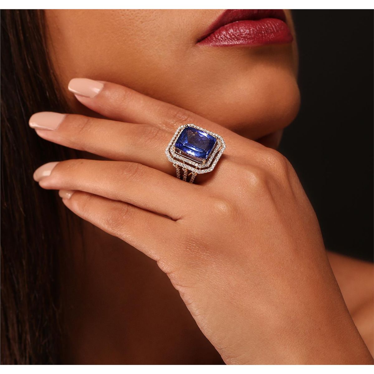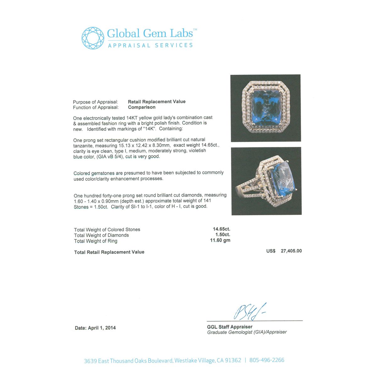 One electronically tested 14KT yellow gold Ladies combination cast & assembled fashion ring with a bright polish finish. Condition is new. Identified with markings of "14K". Containing: One prong set rectangular cushion modified brilliant cut natural tanzanite, measuring 15.13 x 12.42 x 8.30mm, exact weight 14.65ct., clarity is eye clean, type I, medium, moderately strong, violetish blue color, (GIA vB 5/4), cut is very good. GIA Report: #2151951970.Colored gemstones are presumed to have been subjected to commonly used color/clarity enhancement processes. One Hundred Forty-One prong set round brilliant cut diamonds, measuring 1.60 - 1.40 x 0.90mm (depth est.) approximate. Total Weight of 141 Stones = 1.50ct. Clarity: SI-1 to I-1. Color: H - I, Cut is Good. Total Weight of Colored Stones 14.65ct. Total Weight of Diamonds 1.50ct. Total Weight of Ring 11.60 grams. GGL Appraised at $27,405.00.
