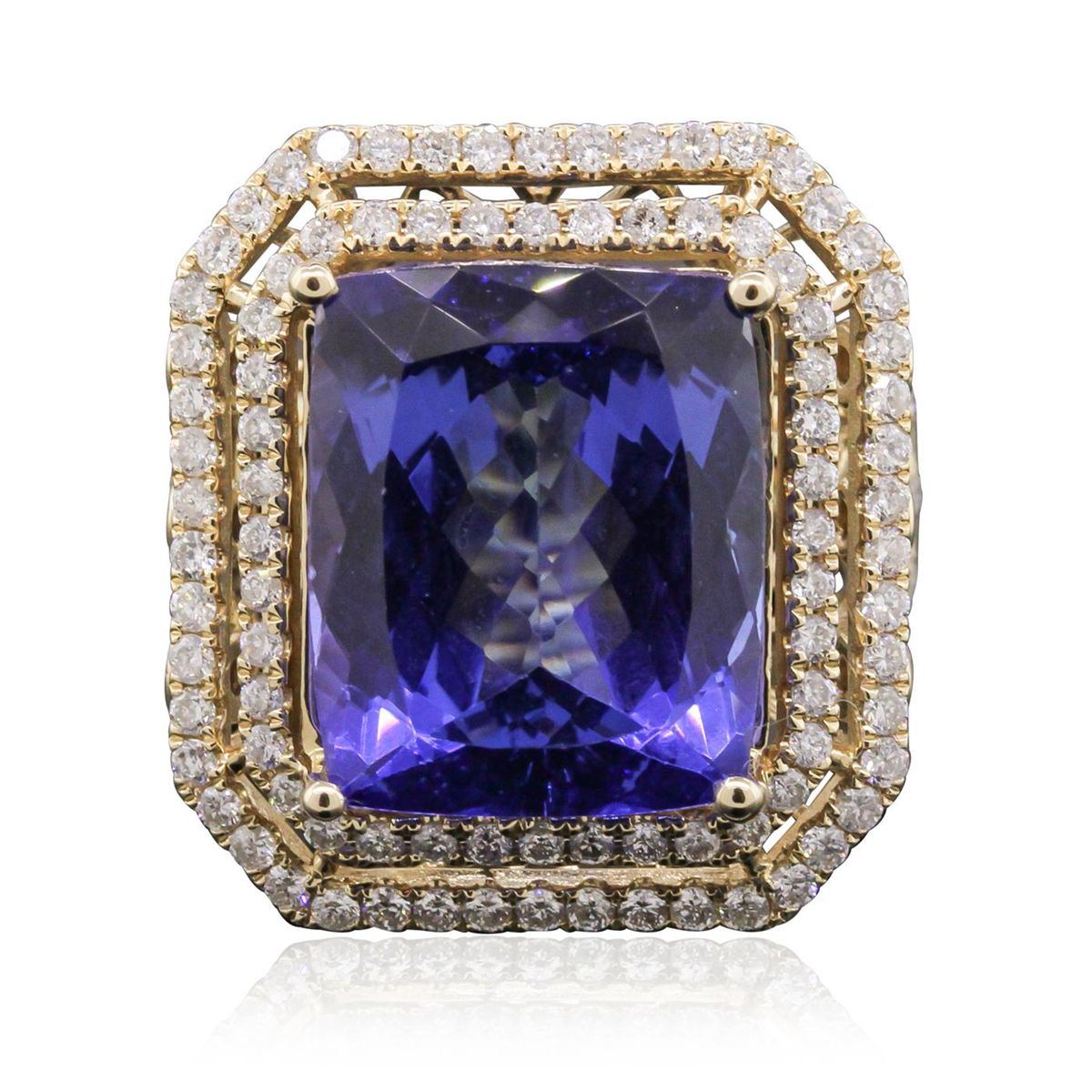 One electronically tested 14KT yellow gold Ladies combination cast & assembled fashion ring with a bright polish finish. Condition is new. Identified with markings of "14K". Containing: One prong set rectangular cushion modified brilliant cut natural tanzanite, measuring 15.13 x 12.42 x 8.30mm, exact weight 14.65ct., clarity is eye clean, type I, medium, moderately strong, violetish blue color, (GIA vB 5/4), cut is very good. GIA Report: #2151951970.Colored gemstones are presumed to have been subjected to commonly used color/clarity enhancement processes. One Hundred Forty-One prong set round brilliant cut diamonds, measuring 1.60 - 1.40 x 0.90mm (depth est.) approximate. Total Weight of 141 Stones = 1.50ct. Clarity: SI-1 to I-1. Color: H - I, Cut is Good. Total Weight of Colored Stones 14.65ct. Total Weight of Diamonds 1.50ct. Total Weight of Ring 11.60 grams. GGL Appraised at $27,405.00.