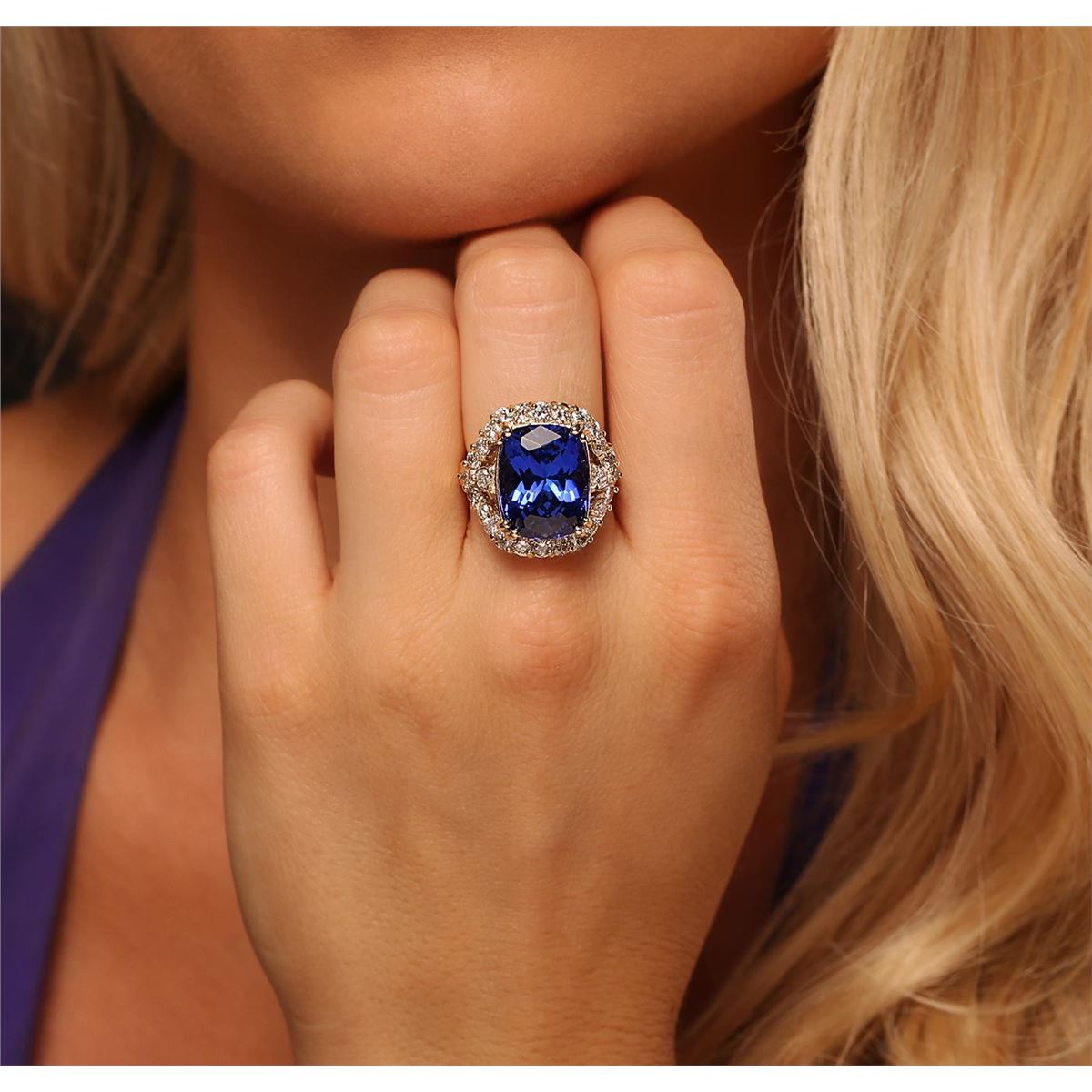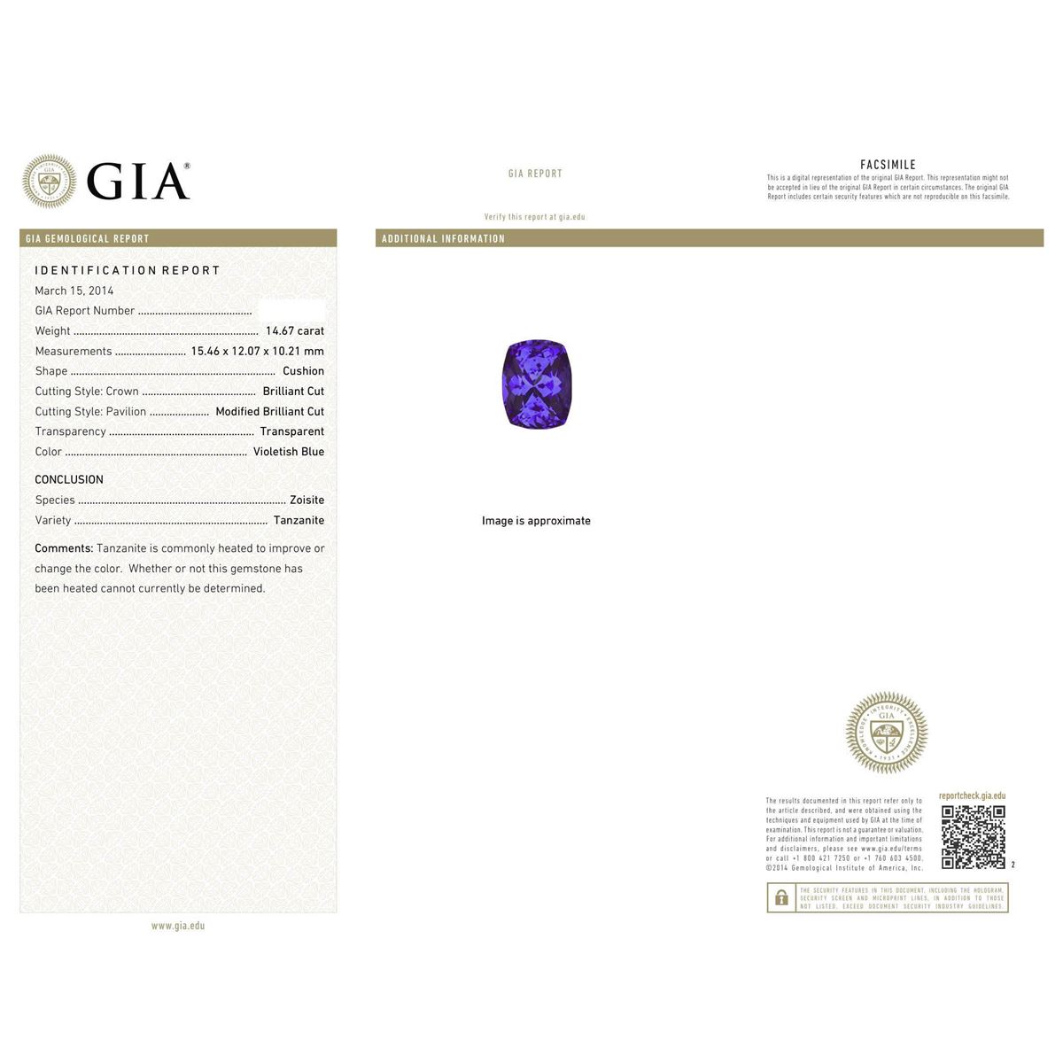 One electronically tested 14KT yellow gold ladies cast tanzanite and diamond ring with a bright polish finish. Condition is new, good workmanship. The featured tanzanite is framed by mirroring ribbons of diamonds, supported by diamond set shoulders and completed by a three millimeter wide band. Identified with markings of "K14". Containing: One prong set rectangular cushion modified brilliant cut natural tanzanite, measuring 15.46 x 12.07 x 10.21mm, approximate weight of 14.67ct., clarity is eye clean, type I, medium dark, moderately strong, violetish blue color, (GIA vB 6/4), cut is good. Transmitting light with no distortion, transparent. GIA Gemological Report attached. Graded loose prior to setting in the GIA Laboratory, Report #2151951651.Tanzanite is a very rare gemstone that is only found in the country of Tanzania. Originally discovered in 1967. Tiffany & Company, named the stone Tanzanite. It is found in the Usumburu Mountains that border the Umba Valley of northern Tanzania. Tanzanite occurs in gray, brown, violet, blue, reddish-purple, & green. The gem is interesting because of its exceptional pleochroism. Rotated in different directions a tanzanite will exhibit multiple changes of color. Tanzanite has a low tolerance to ultrasonic cleaning, and should not be cleaned using this method. Twenty-Six prong set round brilliant cut diamonds, measuring 2.50 - 2.50 x 1.50mm (depth est.) approximate. Total Weight of 26 Stones = 1.58ct. Graded in the setting. Clarity: SI-2 to I-1. Color: I - K. Total Weight of Colored Stones 14.67ct. Total Weight of Diamonds 1.58ct. Total Weight of Ring 11.20 grams. AIG Appraised at $46,400.00.