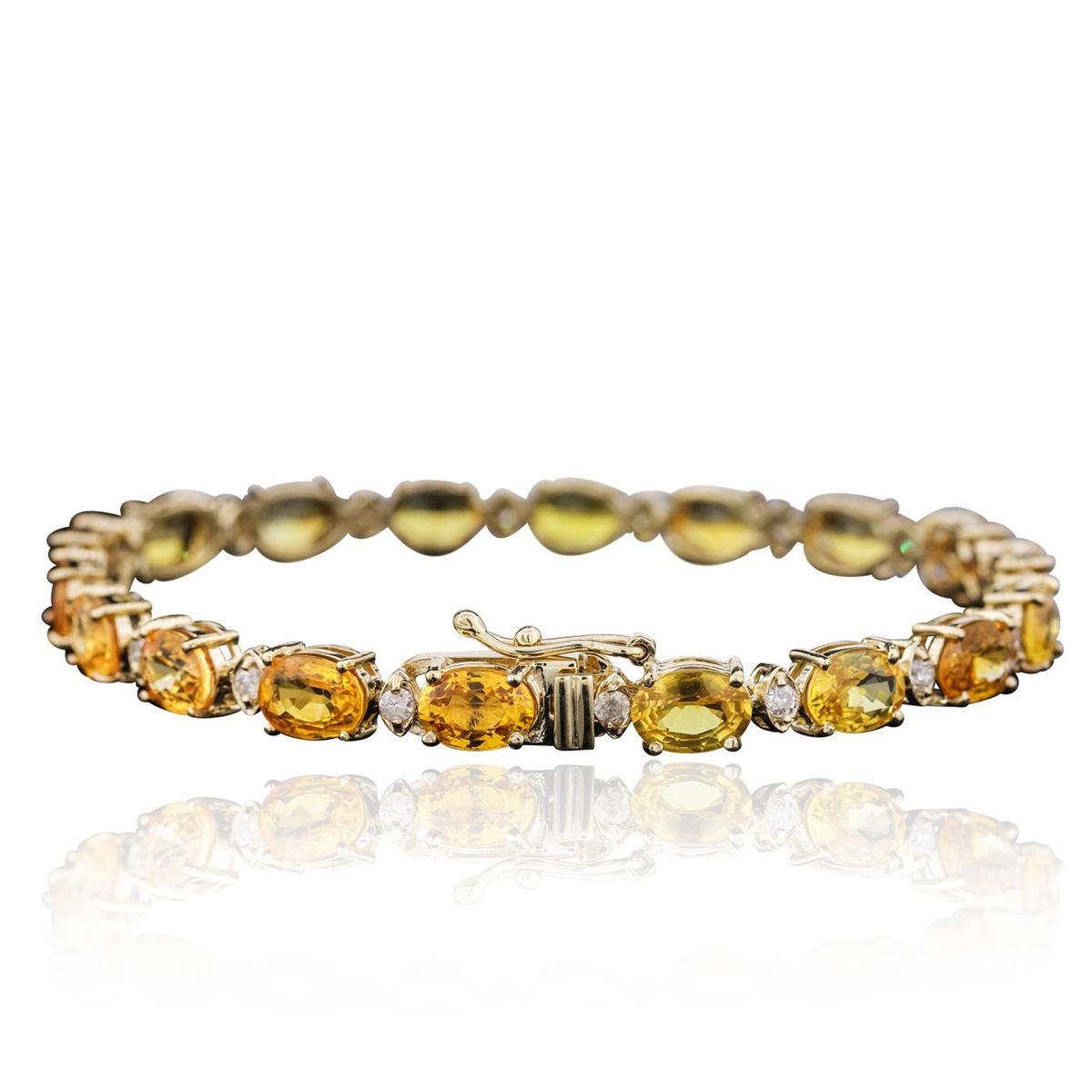 One electronically tested 14KT yellow gold ladies cast & assembled yellow sapphire and diamond bracelet with a bright polish finish. Seven and one-quarter inch length bracelet features a flexible yellow sapphire and diamond ribbon, terminating in a concealed clasp with safety. Condition is new, good workmanship. Containing: Eighteen prong set oval mixed cut natural yellow sapphires, measuring 7.00 x 5.00 x 2.70mm, 6% bulge factor, approximate total weight of 14.76ct., clarity is slightly included, type II, medium dark, slightly brownish, orangy yellow color, (GIA oY 6/2), cut is good. Transmitting light with a minimum of distortion, transparent. Naturally occurring internal & external characteristics are present. Measurements & the color grade are an average for the group. Graded in the setting. Eighteen prong set round brilliant cut diamonds, measuring 2.20 - 2.10 x 1.29mm (depth est.) approximate total weight of 18 Stones = 0.75ct. Graded in the setting. Clarity: SI-2 to I-2. Color: G - I. Total Weight of Colored Stones 14.76ct. Total Weight of Diamonds 0.75ct. Total Weight of Bracelet 11.96 grams. AIG Appraised at $13,545.00.