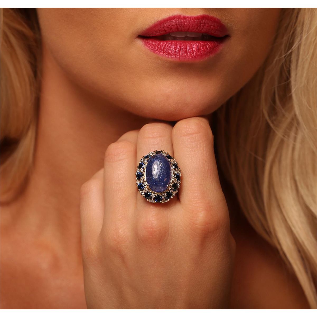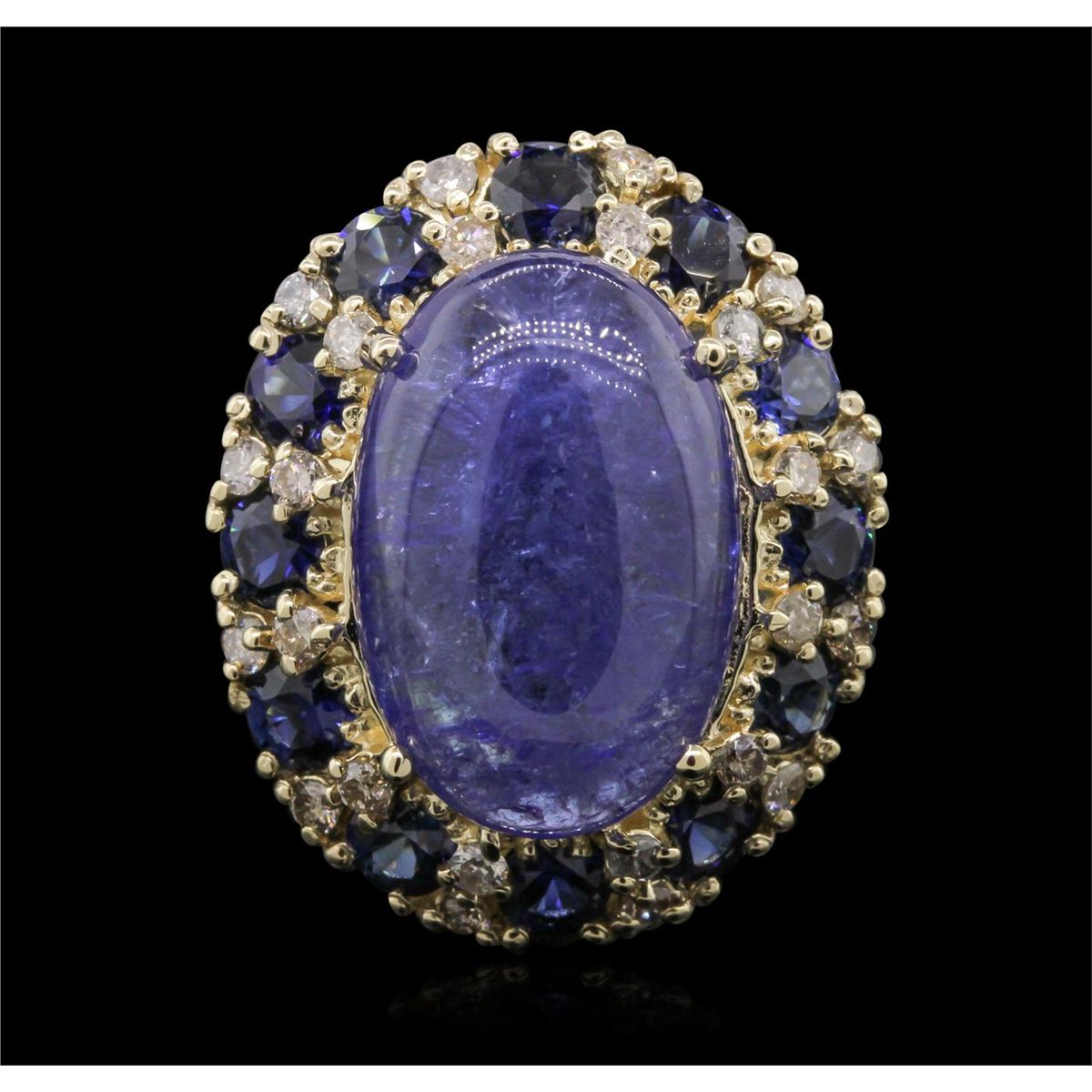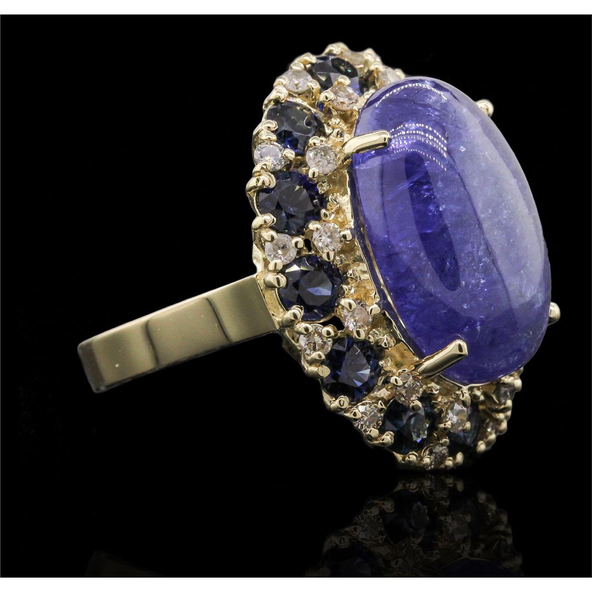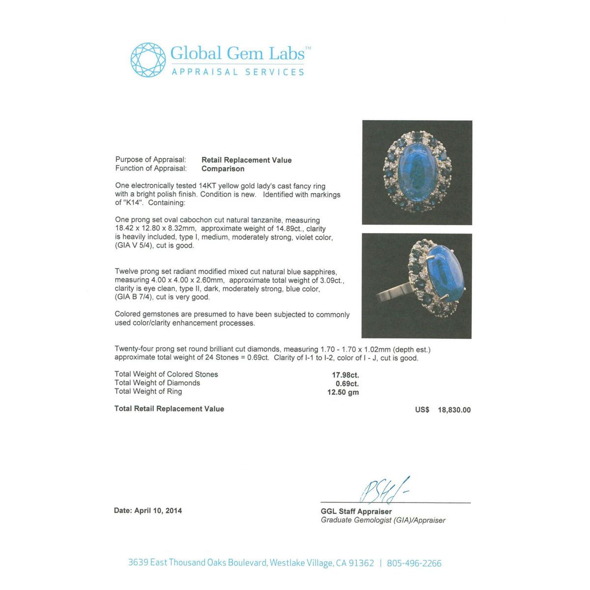 One electronically tested 14KT yellow gold Ladies cast fancy ring with a bright polish finish. Condition is new. Identified with markings of "14K". Containing: One prong set oval cabochon cut natural tanzanite, measuring 18.42 x 12.80 x 8.32mm, approximate weight of 14.89ct., clarity is heavily included, type I, medium, moderately strong, violet color, (GIA V 5/4), cut is good. Twelve prong set radiant modified mixed cut natural blue sapphires, measuring 4.00 x 4.00 x 2.60mm, approximate. Total Weight of 3.09ct., clarity is eye clean, type II, dark, moderately strong, blue color, (GIA B 7/4), cut is very good. Colored gemstones are presumed to have been subjected to commonly used color/clarity enhancement processes. Twenty-Four prong set round brilliant cut diamonds, measuring 1.70 - 1.70 x 1.02mm (depth est.) approximate. Total Weight of 24 Stones = 0.69ct. Clarity: I-1 to I-2. Color: I - J, Cut is Good. Total Weight of Colored Stones 17.98ct. Total Weight of Diamonds 0.69ct. Total Weight of Ring 12.50 grams. GGL Appraised at $18,830.00.