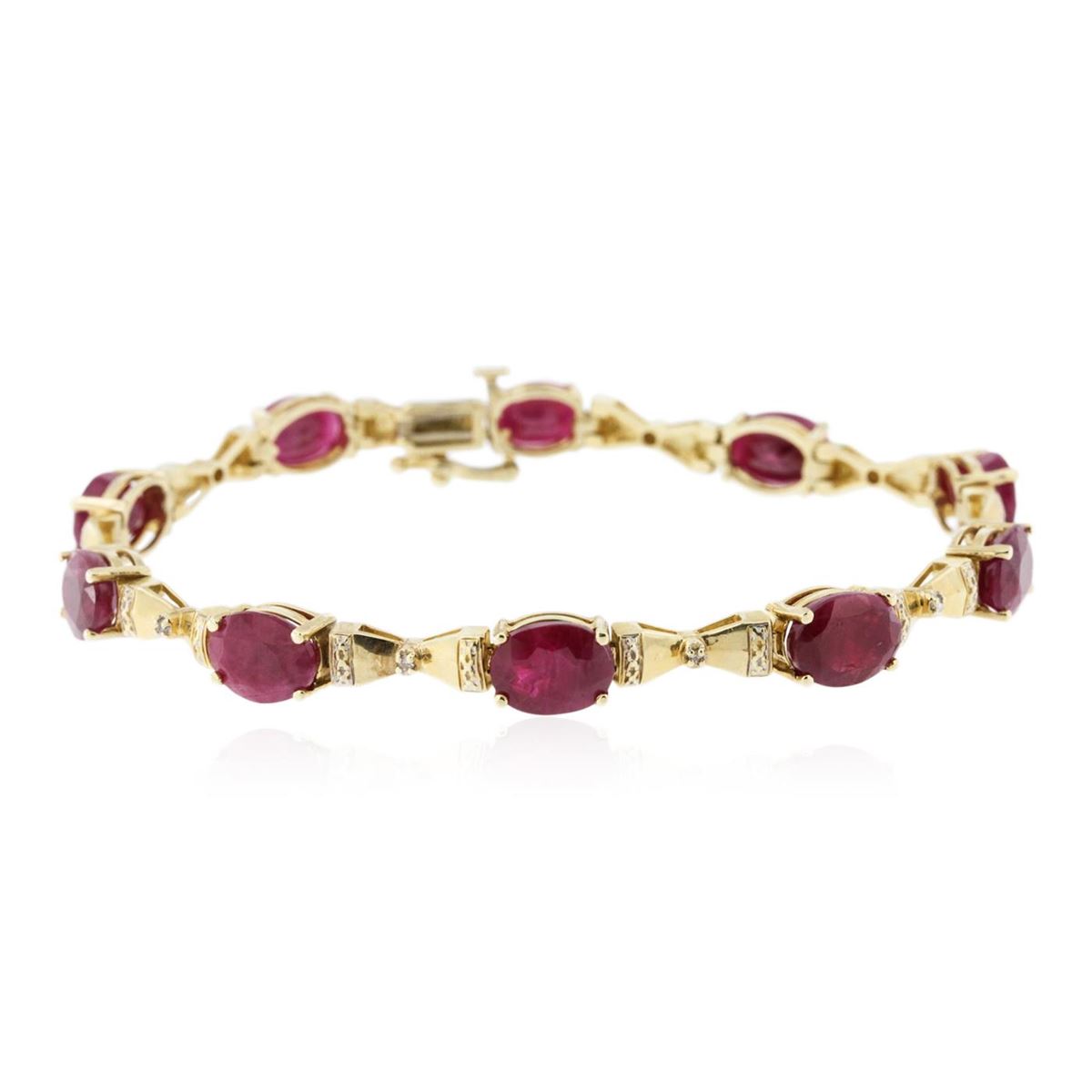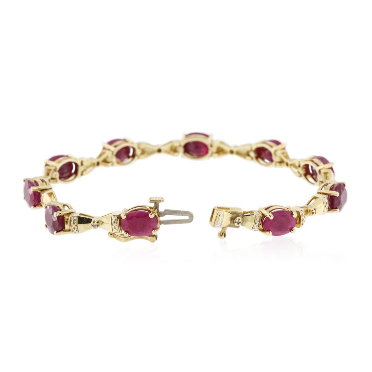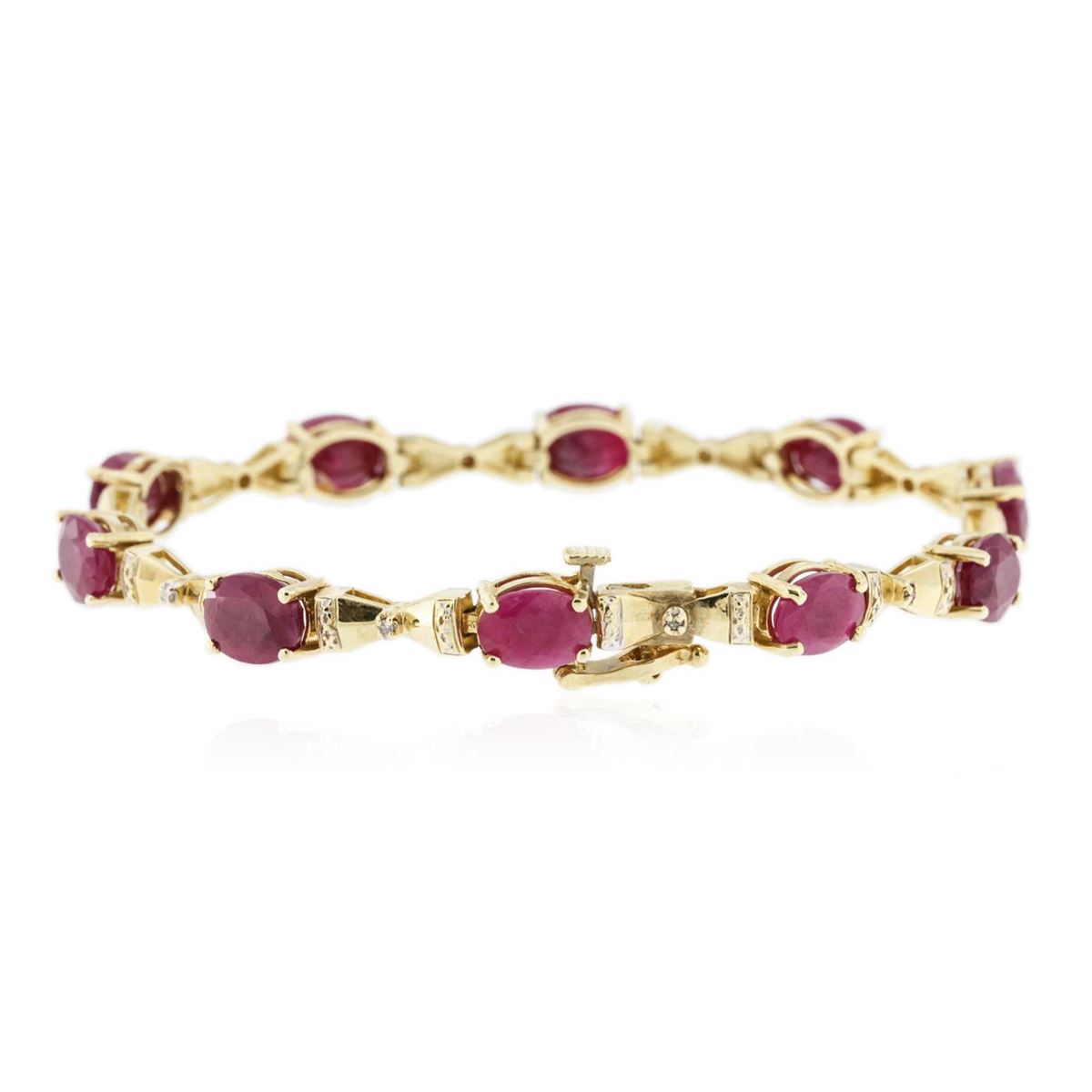 One electronically tested 14KT yellow gold ladies cast & assembled ruby bracelet with a bright polish finish. Condition is new, good workmanship. The seven inch length bracelet features a ribbon of rubies alternated with yellow gold bows, terminating in a concealed clasp with safety. Identified with markings of "14K". Containing: Ten prong set oval mixed cut natural rubies, measuring 8.00 x 6.00 x 3.90mm, approximate. Total Weight of 15.30ct., clarity is severely included, type II, medium dark, moderately strong, slightly purplish red color, (GIA slpR 6/4), cut is good. Transmitting light very diffusely, translucent to opaque. Naturally occurring internal & external characteristics are present. Indications of laboratory high temperature heat treatment, with glass & flux additives. Graded in the setting. Ruby has a low tolerance to rhodium plating, repolishing the surface, & ultrasonic cleaning. Total Weight of Colored Stones 15.30ct. Total Weight of Bracelet 13.90 grams. AIG Appraised at $4,225.00.