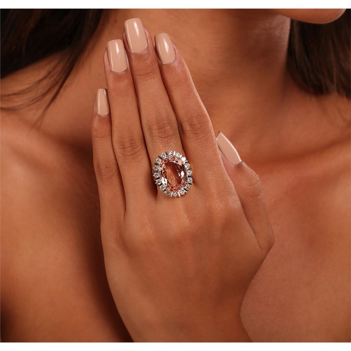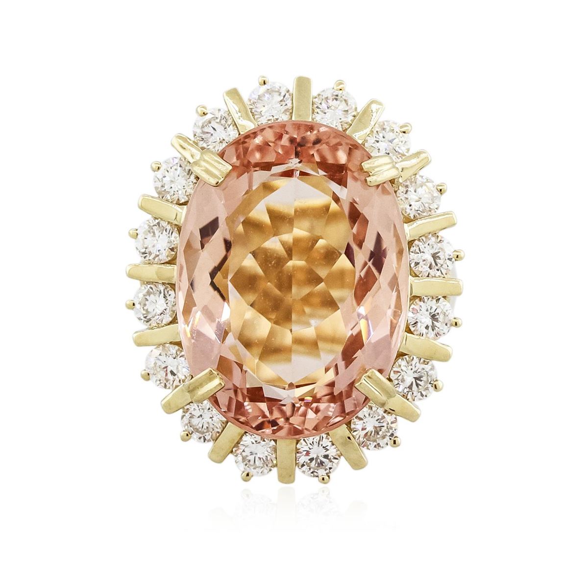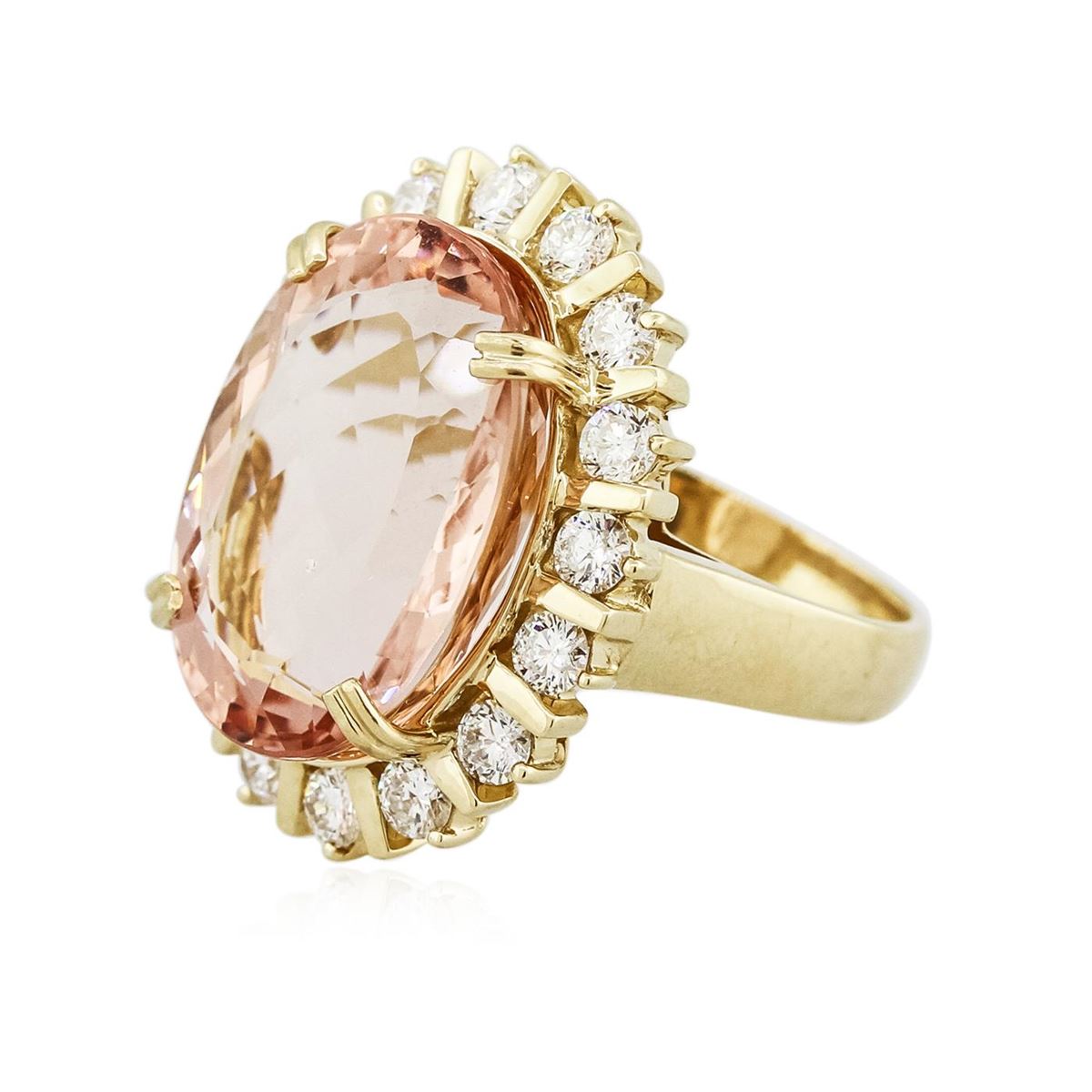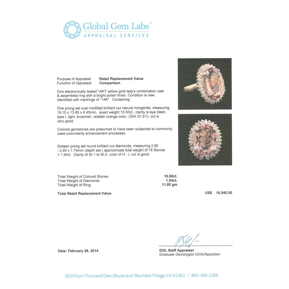 One electronically tested 14KT yellow gold Ladies combination cast & assembled ring with a bright polish finish. Condition is new. Identified with markings of "14K". Containing: One prong set oval modified brilliant cut natural morganite, measuring 19.10 x 13.85 x 8.45mm, exact weight 15.50ct., clarity is eye clean, type I, light, brownish, reddish orange color, (GIA rO 3/1), cut is very good. Colored gemstones are presumed to have been subjected to commonly used color/clarity enhancement processes. Sixteen prong set round brilliant cut diamonds, measuring 2.90 - 2.90 x 1.74mm (depth est.) approximate. Total Weight of 16 Stones = 1.54ct. Clarity: SI-1 to SI-2. Color: H - I, Cut is Good.. Total Weight of Colored Stones 15.50ct. Total Weight of Diamonds 1.54ct. Total Weight of Ring 11.80 grams. GGL Appraised at $16,540.00.