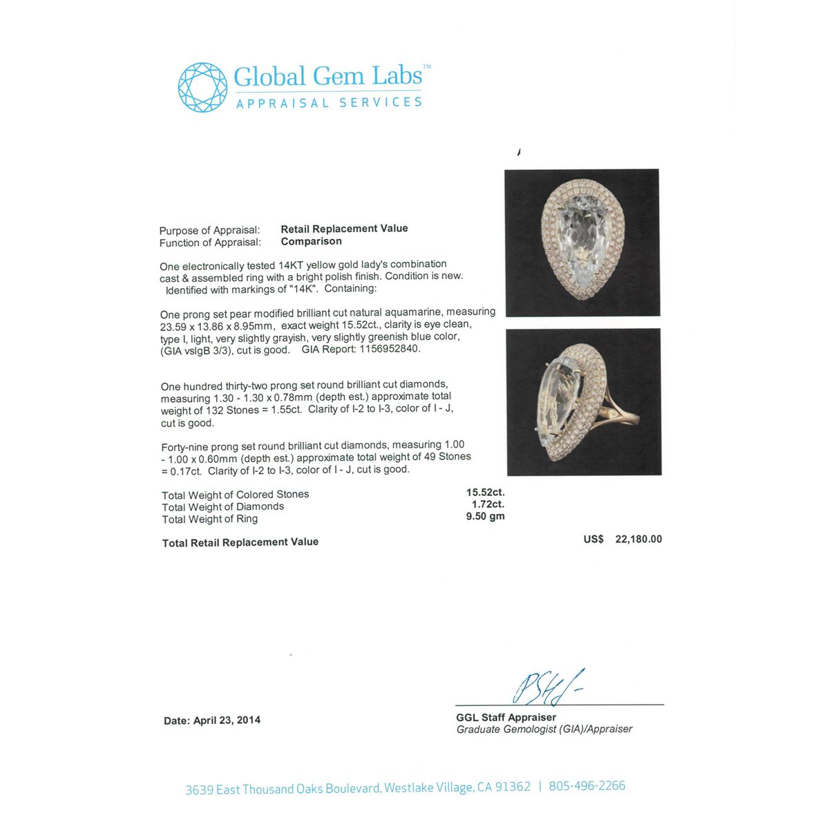 One electronically tested 14KT yellow gold Ladies combination cast & assembled ring with a bright polish finish. Condition is new. Identified with markings of "14K". Containing: One prong set pear modified brilliant cut natural aquamarine, measuring 23.59 x 13.86 x 8.95mm, exact weight 15.52ct., clarity is eye clean, type I, light, very slightly grayish, very slightly greenish blue color, (GIA vslgB 3/3), cut is good. GIA Report: 1156952840.One Hundred Thirty-Two prong set round brilliant cut diamonds, measuring 1.30 - 1.30 x 0.78mm (depth est.) approximate. Total Weight of 132 Stones = 1.55ct. Clarity: I-2 to I-3. Color: I - J, Cut is Good. Forty-Nine prong set round brilliant cut diamonds, measuring 1.00 - 1.00 x 0.60mm (depth est.) approximate. Total Weight of 49 Stones = 0.17ct. Clarity: I-2 to I-3. Color: I - J, Cut is Good. Total Weight of Colored Stones 15.52ct. Total Weight of Diamonds 1.72ct. Total Weight of Ring 9.50 grams. GGL Appraised at $22,180.00.