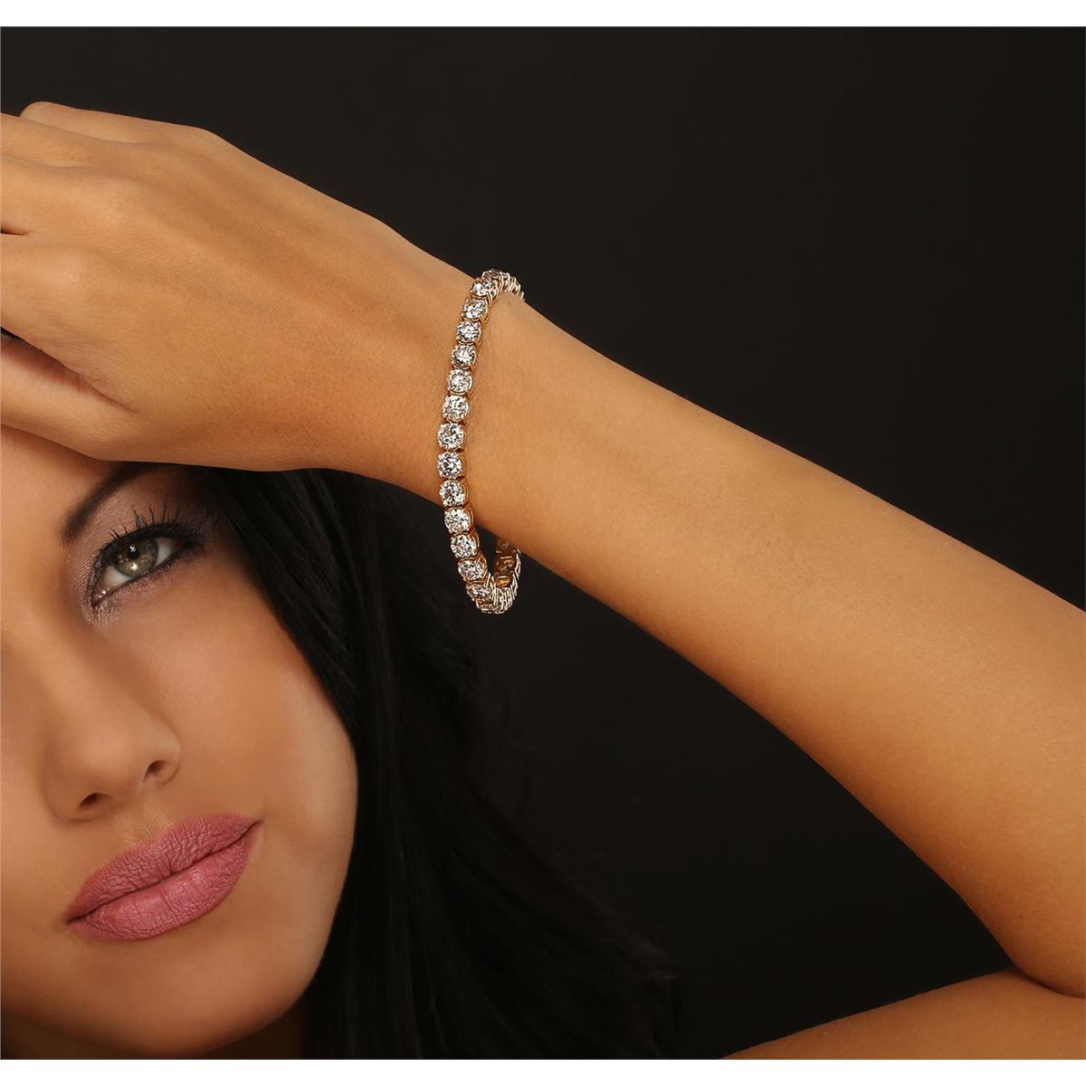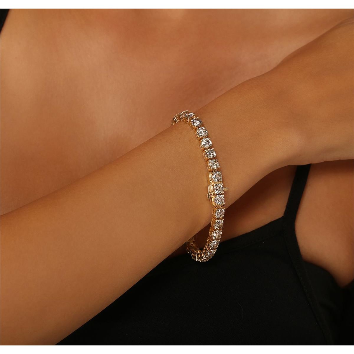 One electronically tested 14KT yellow gold ladies cast & assembled diamond tennis bracelet with a bright polish finish. Condition is new, good workmanship. Seven inch length bracelet composed of a flexible ribbon of diamonds, terminating in a concealed clasp with safety. Identified with markings of "14K". Tennis bracelets & necklaces got their unusual name from an incident involving the U.S. professional tennis player Chris Evert during a tennis match in the 1980's. Evert had been wearing an expensive diamond bracelet, an inline string of individually-set diamonds. Previously these bracelets were known as eternity bracelets. When the clasp snapped during play, she asked the officials to stop the tennis match until the bracelet could be found. Since that day, bracelets and necklaces featuring an inline string of diamonds have been called tennis bracelets and tennis necklaces. Containing: Thirty prong set round brilliant cut diamonds, measuring 5.20 - 5.15 x 3.15mm (depth est.) approximate. Total Weight of 30 Stones = 15.54ct. Color grade is an average for the group. Graded in the setting. Clarity: SI-1 to I-1. Total Weight of Diamonds 15.54ct. Total Weight of Tennis Bracelet 24.24 grams. AIG Appraised at $64,120.00.