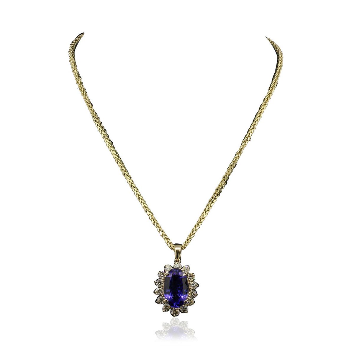 One electronically tested 14KT yellow gold Ladies combination cast & die struck pendant & chain 17.5" long, medium fancy cable link with a lobster claw clasp with a bright polish finish. Condition is new. Identified with markings of "14K". Containing: One prong set oval modified brilliant cut natural tanzanite, measuring 21.10 x 12.87 x 7.52mm, exact weight 15.89ct., clarity is eye clean, type I, medium, moderately strong, violet color, (GIA V 5/4), cut is very good. GIA Report: 6157953455.Fourteen prong set round brilliant cut diamonds, measuring 4.20 - 4.20 x 2.52mm (depth est.) approximate. Total Weight of 14 Stones = 3.80ct. Clarity: SI-1 to SI-2, Cut is Very Good. GIA Report: 6157953455. Total Weight of Colored Stones 15.89ct. Total Weight of Diamonds 3.80ct. Total Weight of Pendant & Chain 16.70 grams. GGL Appraised at $33,695.00.