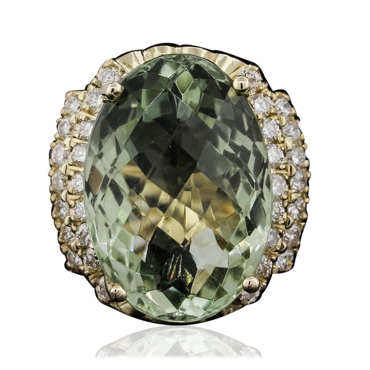 One electronically tested 14KT yellow gold ladies cast green quartz and diamond ring with a bright polish finish. The featured green quartz is set within mirroring diamond set tiers supported by tapering shoulders, completed by a two and one half millimeter wide band. Identified with markings of "14K". Condition is new, good workmanship. Containing: One prong set oval mixed cut natural green quartz, measuring 19.90 x 14.00 x 10.30mm, approximate weight of 16.00ct., clarity is eye clean, medium light, slightly grayish, slightly yellowish green color, (GIA slyG 4/2), cut is good. Transmitting light with no distortion, transparent. Colored Stone Grading Report attached. Graded in the setting. Thirty-Two prong set round brilliant cut diamonds, measuring 1.80 - 1.75 x 1.07mm (depth est.) approximate total weight of 32 Stones = 0.75ct. Graded in the setting. Clarity: VS-2 to SI-2. Color: F - H. Total Weight of Colored Stones 16.00ct. Total Weight of Diamonds 0.75ct. Total Weight of Ring 10.93 grams. AIG Appraised at $4,765.00.