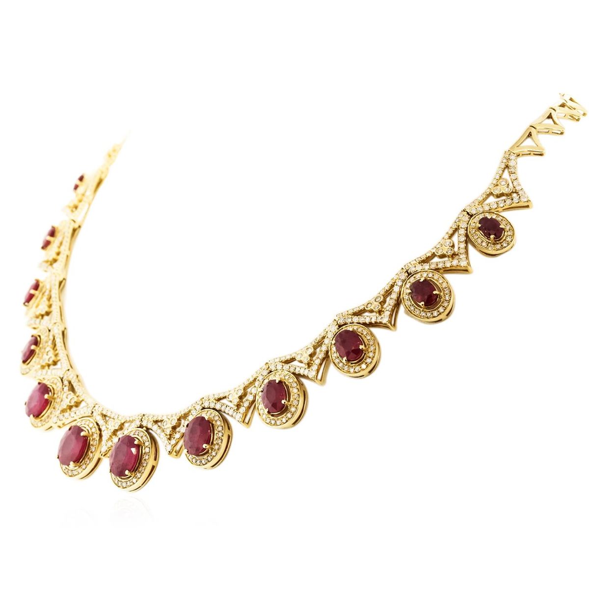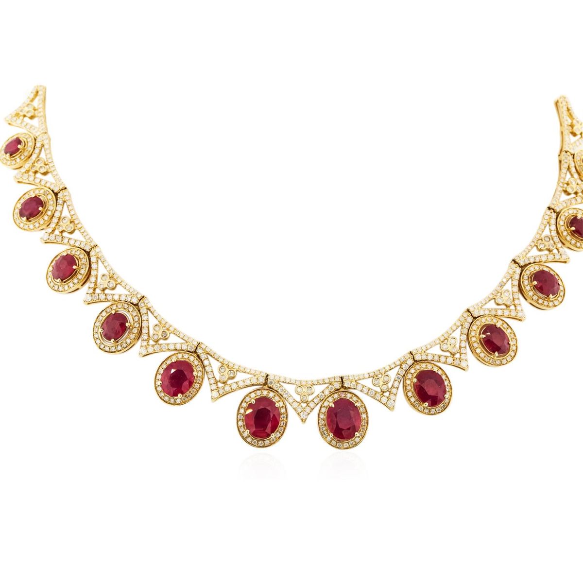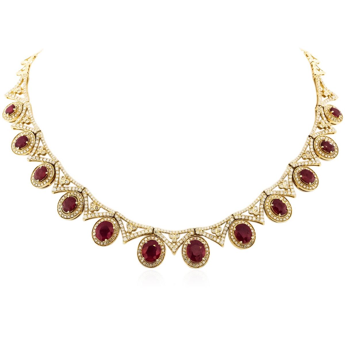 One electronically tested 14KT yellow gold ladies cast & assembled ruby and diamond necklace. Sixteen and one-half inch wearable length necklace features a ruby and diamond set fringe supported by matching white gold links, terminating in a concealed clasp with twin safeties. Bright polish finish. Trademark is Orianne. Identified with markings of "14K". Condition is new, good workmanship. Containing: Twelve prong set oval mixed cut natural rubies approximate total weight of 16.12ct., clarity is heavily included, type II, medium dark, very slightly brownish, slightly purplish red color, (GIA slpR 6/3), cut is good. Transmitting light somewhat diffusely, transparent to translucent. Naturally occurring internal & external characteristics are present. Indications of laboratory high temperature heat treatment, with glass & flux additives. The color grade is an average for the group. Graded in the setting. Ruby has a low tolerance to rhodium plating, repolishing the surface, & ultrasonic cleaning. Six Hundred Fifty-One prong and bezel set round brilliant cut diamonds, measuring 1.60 - 1.20 x 0.84mm (depth est.) approximate total weight of 651 Stones = 7.03ct. Graded in the setting. Clarity: I-1 to I-2. Color: H - J. Total Weight of Colored Stones 16.12ct. Total Weight of Diamonds 7.03ct. Total Weight of Necklace 51.32 grams. AIG Appraised at $29,535.00.