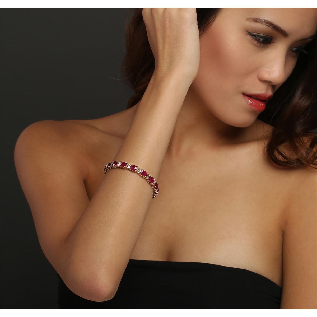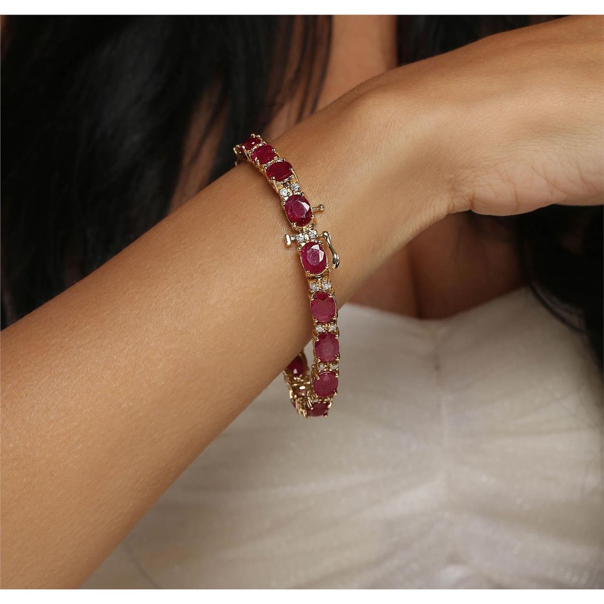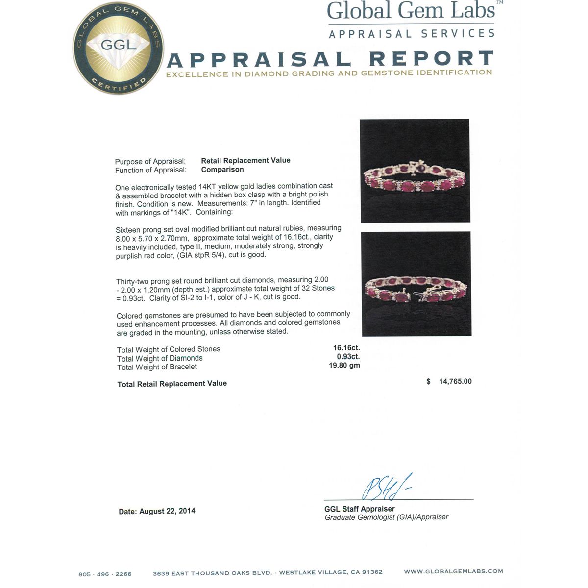 14KT Yellow Gold 16.16ctw Ruby and Diamond Bracelet. One electronically tested 14KT yellow gold ladies combination cast & assembled bracelet with a hidden box clasp with a bright polish finish. Measurements: 7" in length. Identified with markings of "14K". Condition is new. Containing: Sixteen prong set oval modified brilliant cut natural rubies, measuring 8.00 x 5.70 x 2.70mm, approximate total weight of 16.16ct., clarity is heavily included, type II, medium, moderately strong, strongly purplish red color, (GIA stpR 5/4), cut is good. Thirty-Two prong set round brilliant cut diamonds, measuring 2.00 - 2.00 x 1.20mm (depth est.) approximate total weight of 32 Stones = 0.93ct. Clarity: SI-2 to I-1. Color: J - K, Cut is Good. Colored gemstones are presumed to have been subjected to commonly used enhancement processes. All diamonds and colored gemstones are graded in the mounting, unless otherwise stated. Total Weight of Colored Stones 16.16ct. Total Weight of Diamonds 0.93ct. Total Weight of Bracelet 19.80 grams. GGL Appraised at $14,765.00.