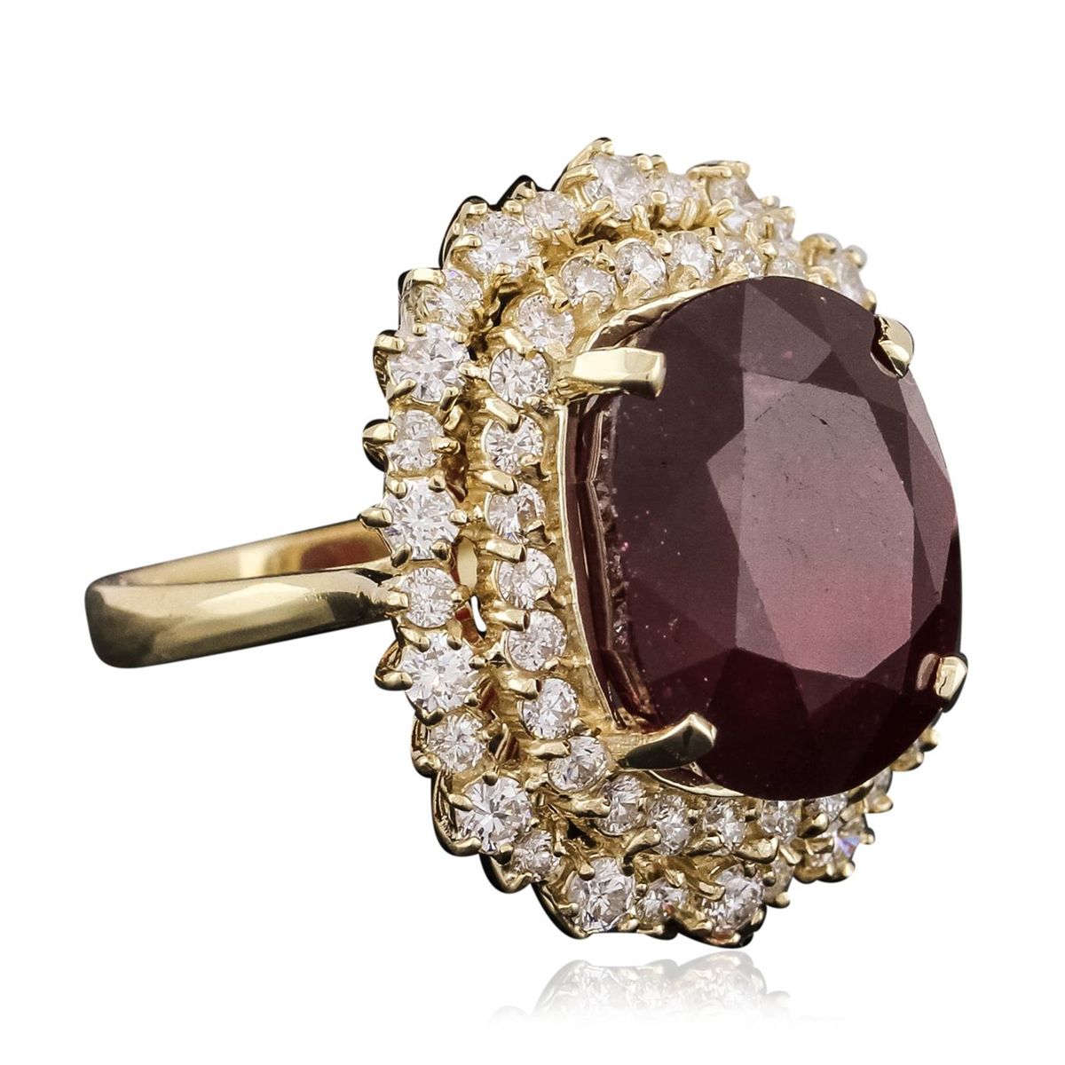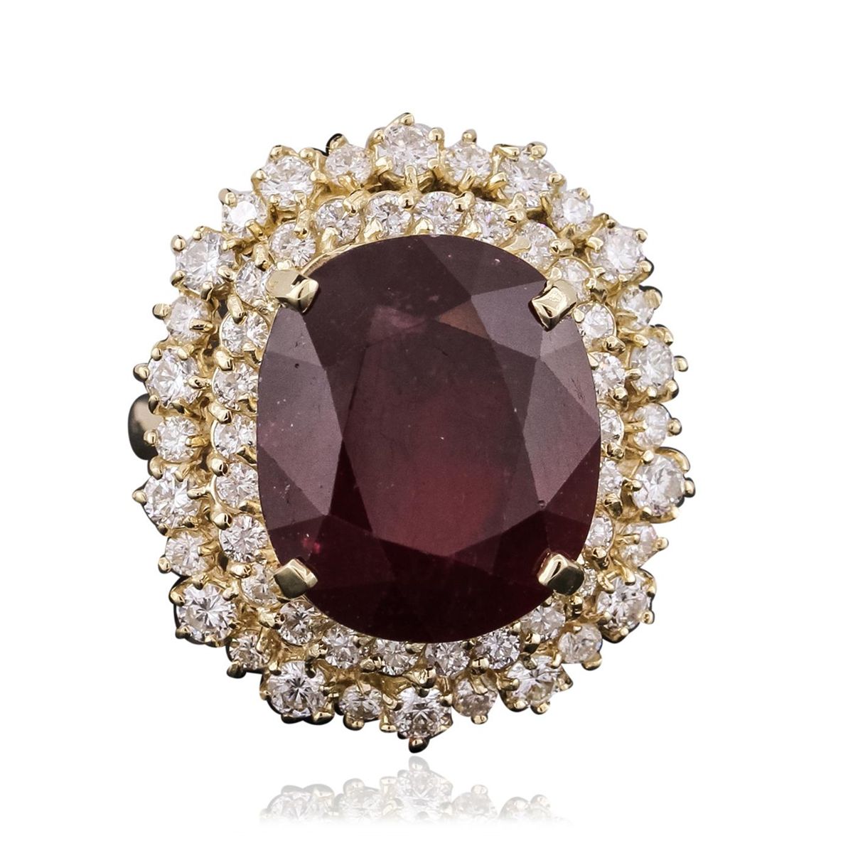 One electronically tested 14KT yellow gold ladies combination cast & assembled ring with a bright polish finish. Identified with markings of "K14". Condition is new. Containing: One prong set oval modified brilliant cut natural ruby, measuring 15.55 x 13.28 x 9.84mm, approximate weight of 16.36ct., clarity is heavily included, type II, medium dark, moderately strong, strongly purplish red color, (GIA stpR 6/4), cut is good. Fifty-Five prong set round brilliant cut diamonds, measuring 2.30 - 1.80 x 1.23mm (depth est.) approximate total weight of 55 Stones = 1.73ct. Clarity: SI-1 to SI-2. Color: L - M, Cut is Good. Colored gemstones are presumed to have been subjected to commonly used enhancement processes. All diamonds and colored gemstones are graded in the mounting, unless otherwise stated. Total Weight of Colored Stones 16.36ct. Total Weight of Diamonds 1.73ct. Total Weight of Ring 11.30 grams. GGL Appraised at $14,305.00.