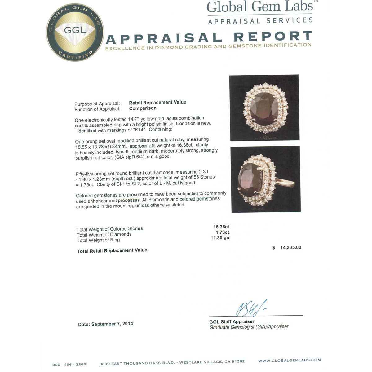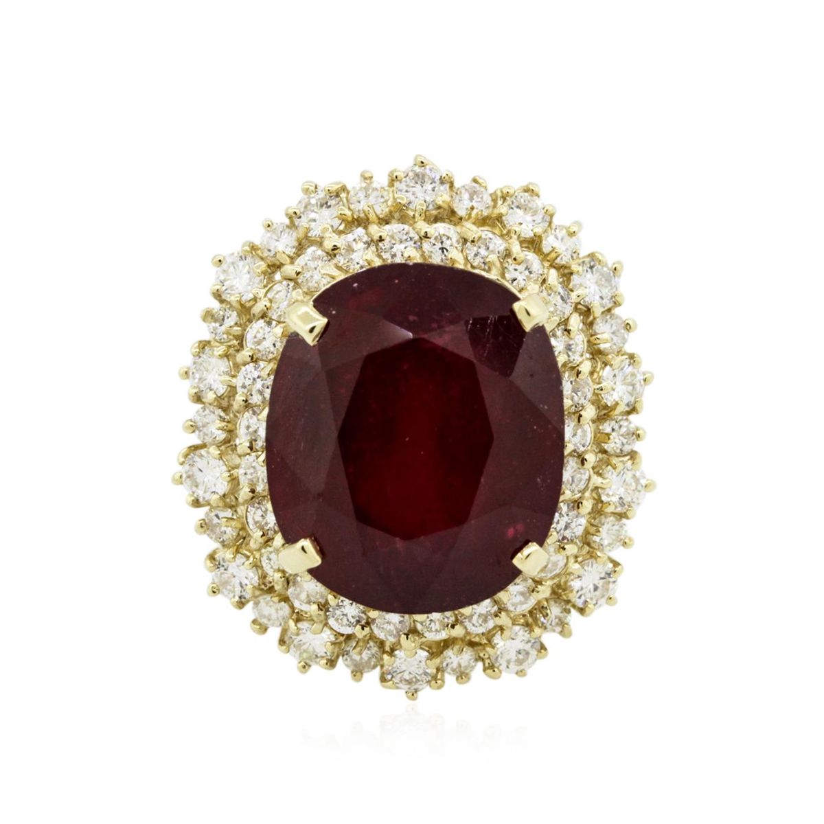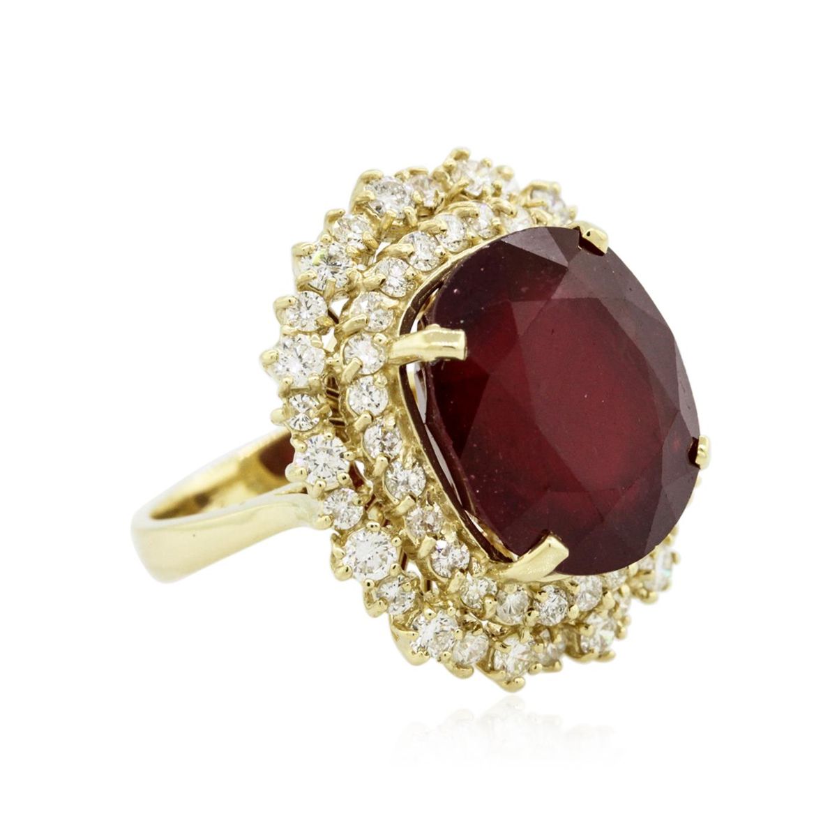 One electronically tested 14KT yellow gold ladies combination cast & assembled ring with a bright polish finish. Identified with markings of "K14". Condition is new. Containing: One prong set oval modified brilliant cut natural ruby, measuring 15.55 x 13.28 x 9.84mm, approximate weight of 16.36ct., clarity is heavily included, type II, medium dark, moderately strong, strongly purplish red color, (GIA stpR 6/4), cut is good. Fifty-Five prong set round brilliant cut diamonds, measuring 2.30 - 1.80 x 1.23mm (depth est.) approximate total weight of 55 Stones = 1.73ct. Clarity: SI-1 to SI-2. Color: L - M, Cut is Good. Colored gemstones are presumed to have been subjected to commonly used enhancement processes. All diamonds and colored gemstones are graded in the mounting, unless otherwise stated. Total Weight of Colored Stones 16.36ct. Total Weight of Diamonds 1.73ct. Total Weight of Ring 11.30 grams. GGL Appraised at $14,305.00.