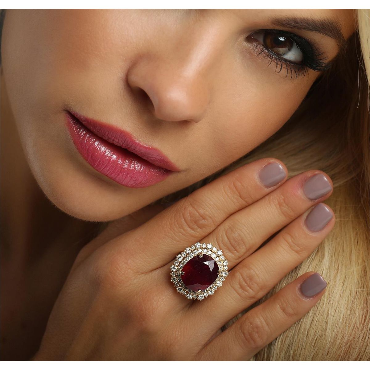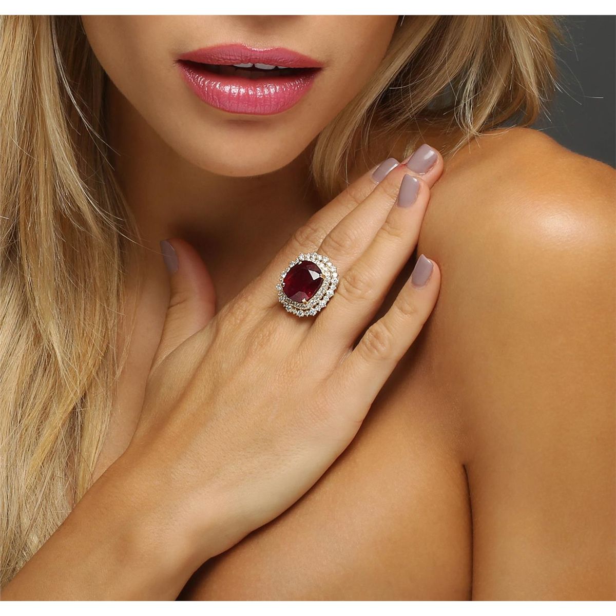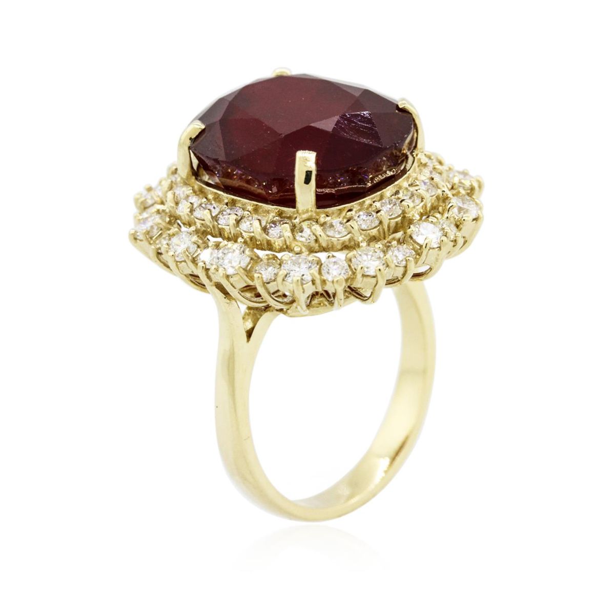 One electronically tested 14KT yellow gold ladies combination cast & assembled ring with a bright polish finish. Identified with markings of "K14". Condition is new. Containing: One prong set oval modified brilliant cut natural ruby, measuring 15.55 x 13.28 x 9.84mm, approximate weight of 16.36ct., clarity is heavily included, type II, medium dark, moderately strong, strongly purplish red color, (GIA stpR 6/4), cut is good. Fifty-Five prong set round brilliant cut diamonds, measuring 2.30 - 1.80 x 1.23mm (depth est.) approximate total weight of 55 Stones = 1.73ct. Clarity: SI-1 to SI-2. Color: L - M, Cut is Good. Colored gemstones are presumed to have been subjected to commonly used enhancement processes. All diamonds and colored gemstones are graded in the mounting, unless otherwise stated. Total Weight of Colored Stones 16.36ct. Total Weight of Diamonds 1.73ct. Total Weight of Ring 11.30 grams. GGL Appraised at $14,305.00.