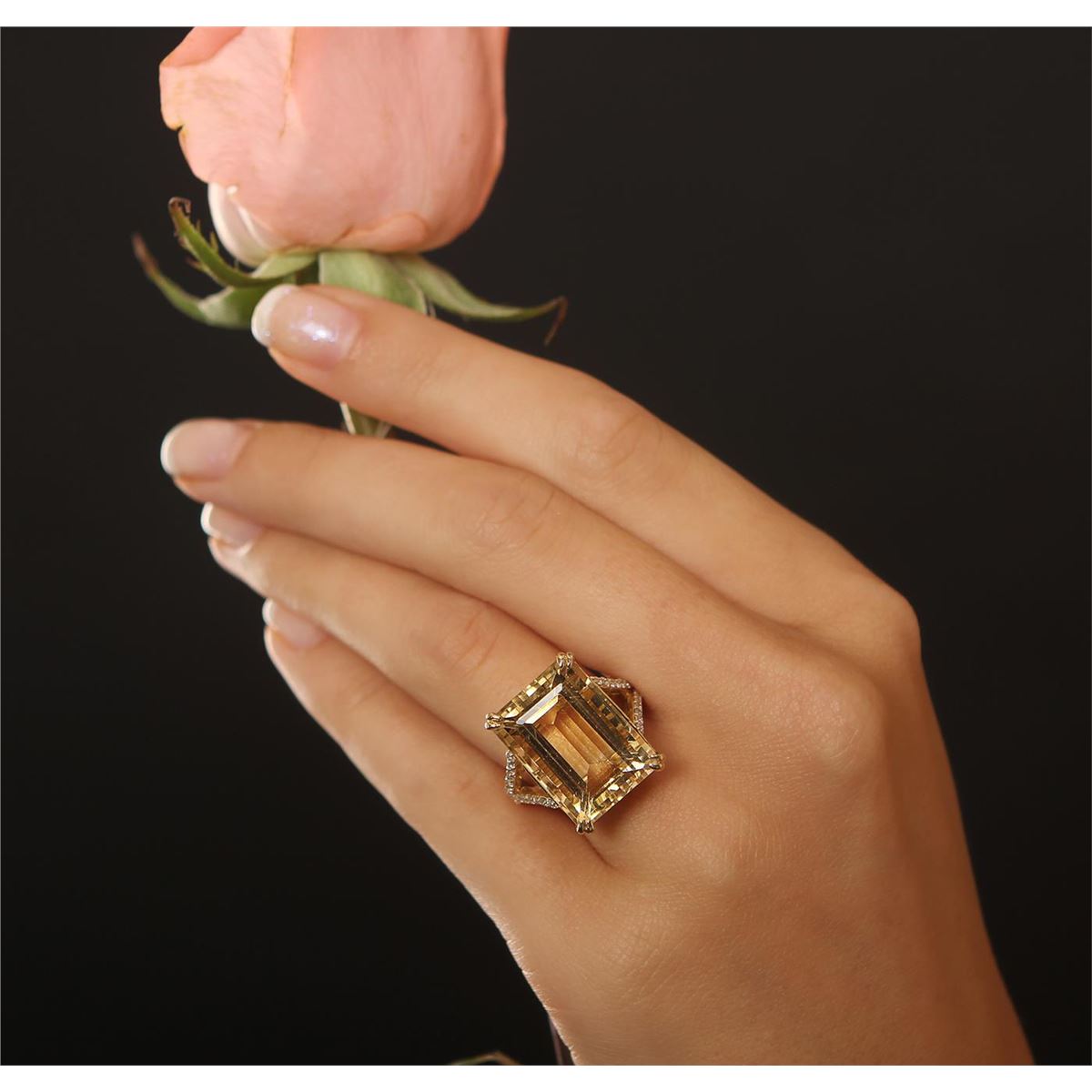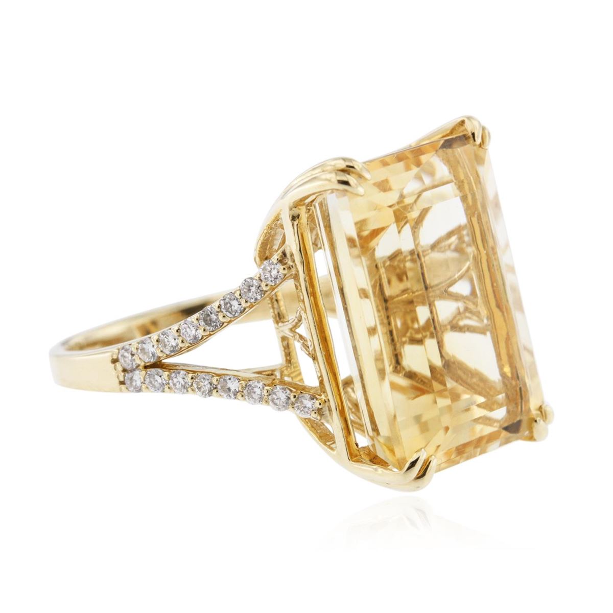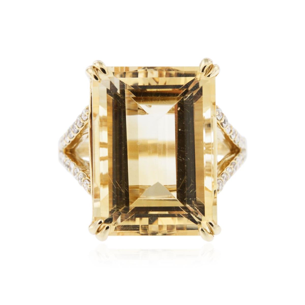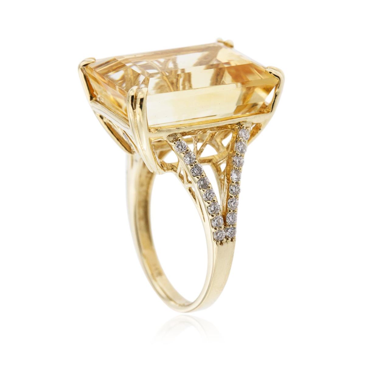 One electronically tested 14KT yellow gold ladies cast citrine and diamond ring with a bright polish finish. Condition is new, good workmanship. The featured citrine is supported by diamond set split shoulders, completed by a two millimeter wide band. Identified with markings of "14K". Containing: One prong set emerald step cut natural citrine quartz, measuring 17.50 x 13.00 x 9.00mm, 10% bulge factor, approximate weight of 16.38ct., clarity is eye clean, type I, medium light, brownish, orangey yellow color, (GIA oY 4/3), cut is good. Transmitting light with no distortion, transparent. Colored Stone Grading Report attached. Graded in the setting. Thirty-six prong set round brilliant cut diamonds, measuring 1.50 - 1.20 x 0.81mm (depth est.) approximate total weight of 36 Stones = 0.41ct. Graded in the setting. Clarity SI-1 to I-1. Color G - I. Total Weight of Colored Stones 16.38ct. Total Weight of Diamonds 0.41ct. Total Weight of Ring 8.58gm. AIG Appraised at $3,120.00.