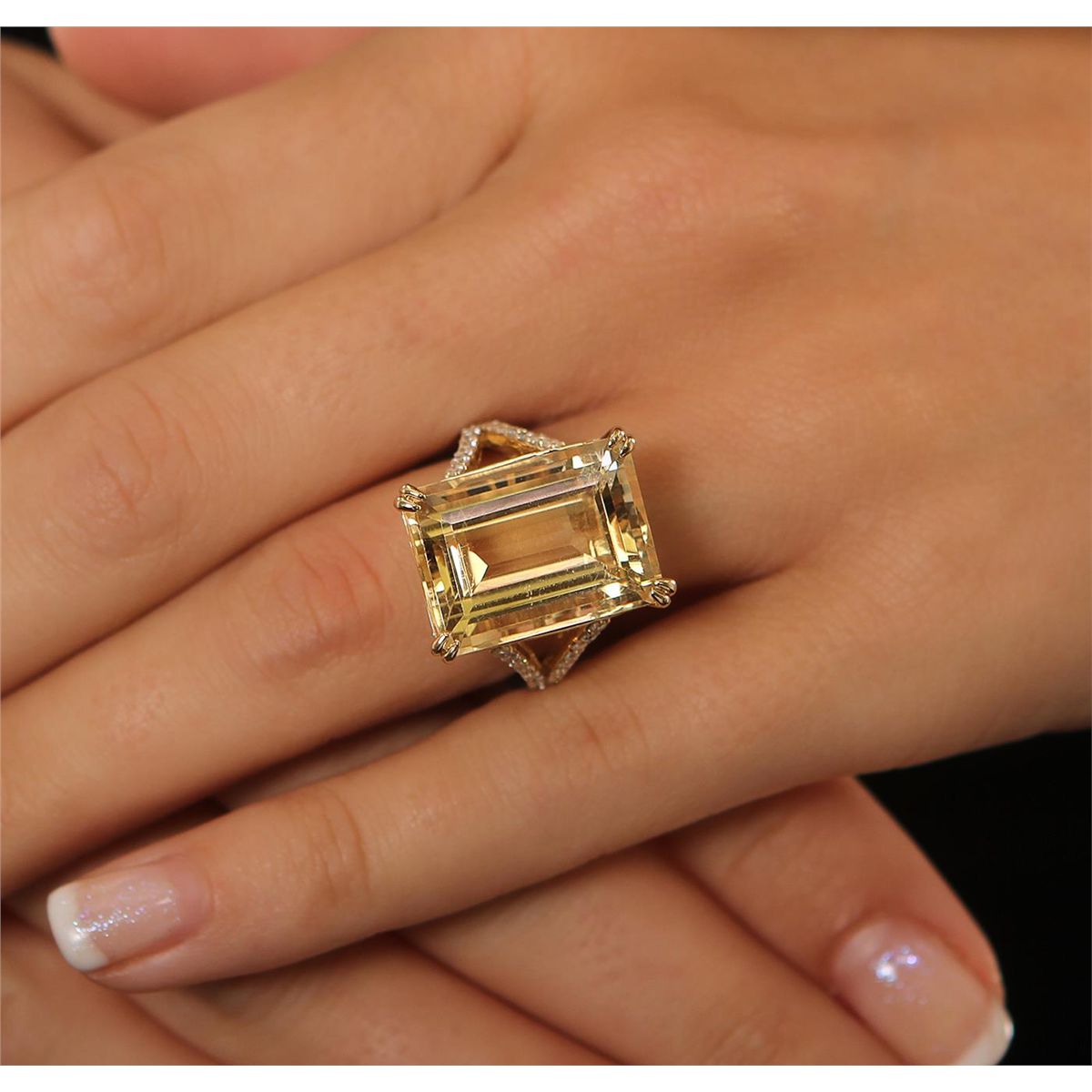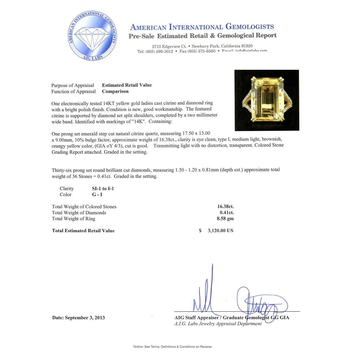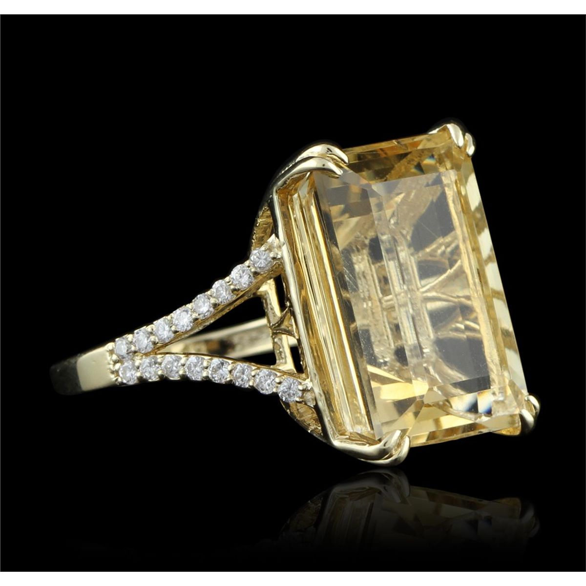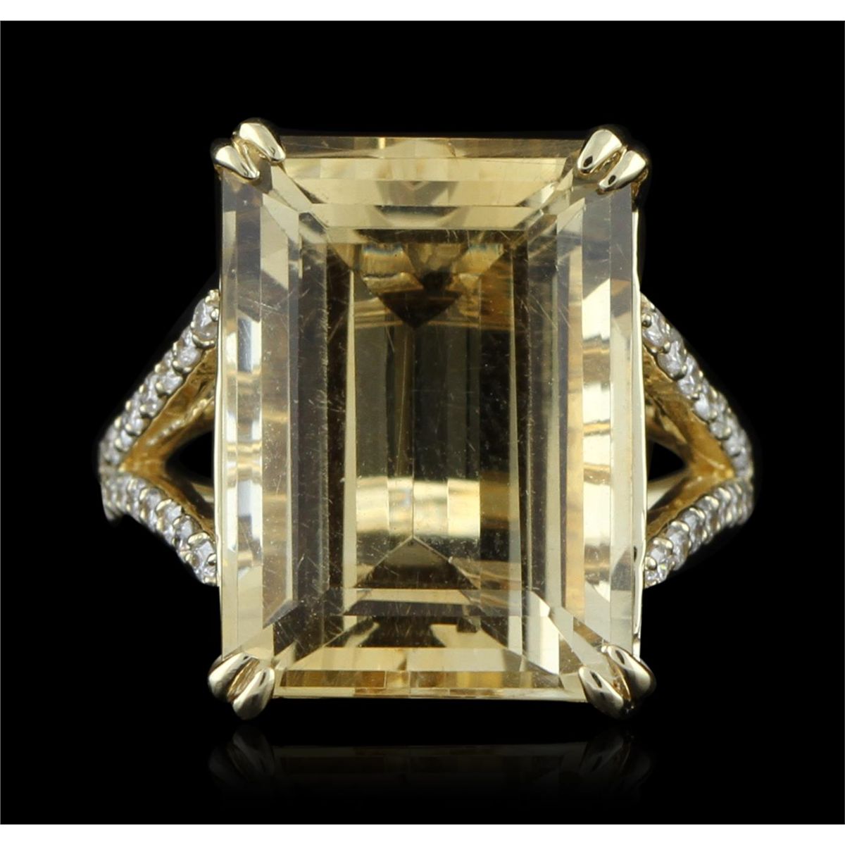 One electronically tested 14KT yellow gold ladies cast citrine and diamond ring with a bright polish finish. Condition is new, good workmanship. The featured citrine is supported by diamond set split shoulders, completed by a two millimeter wide band. Identified with markings of "14K". Containing: One prong set emerald step cut natural citrine quartz, measuring 17.50 x 13.00 x 9.00mm, 10% bulge factor, approximate weight of 16.38ct., clarity is eye clean, type I, medium light, brownish, orangey yellow color, (GIA oY 4/3), cut is good. Transmitting light with no distortion, transparent. Colored Stone Grading Report attached. Graded in the setting. Thirty-six prong set round brilliant cut diamonds, measuring 1.50 - 1.20 x 0.81mm (depth est.) approximate total weight of 36 Stones = 0.41ct. Graded in the setting. Clarity SI-1 to I-1. Color G - I. Total Weight of Colored Stones 16.38ct. Total Weight of Diamonds 0.41ct. Total Weight of Ring 8.58gm. AIG Appraised at $3,120.00.