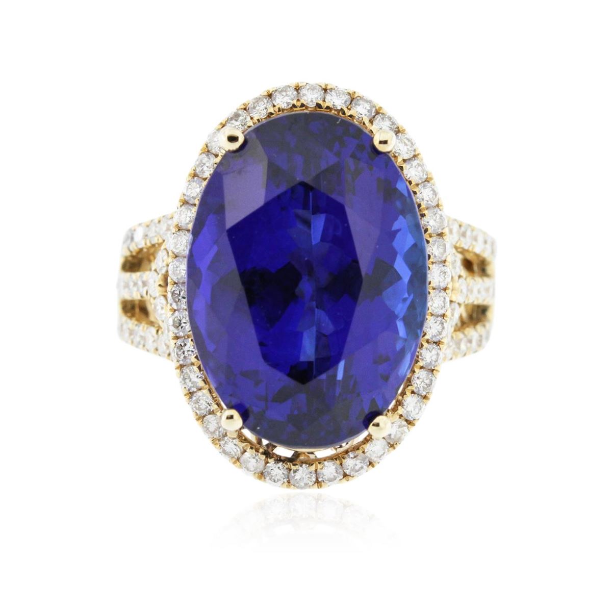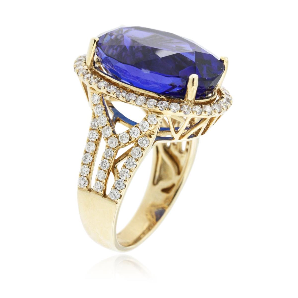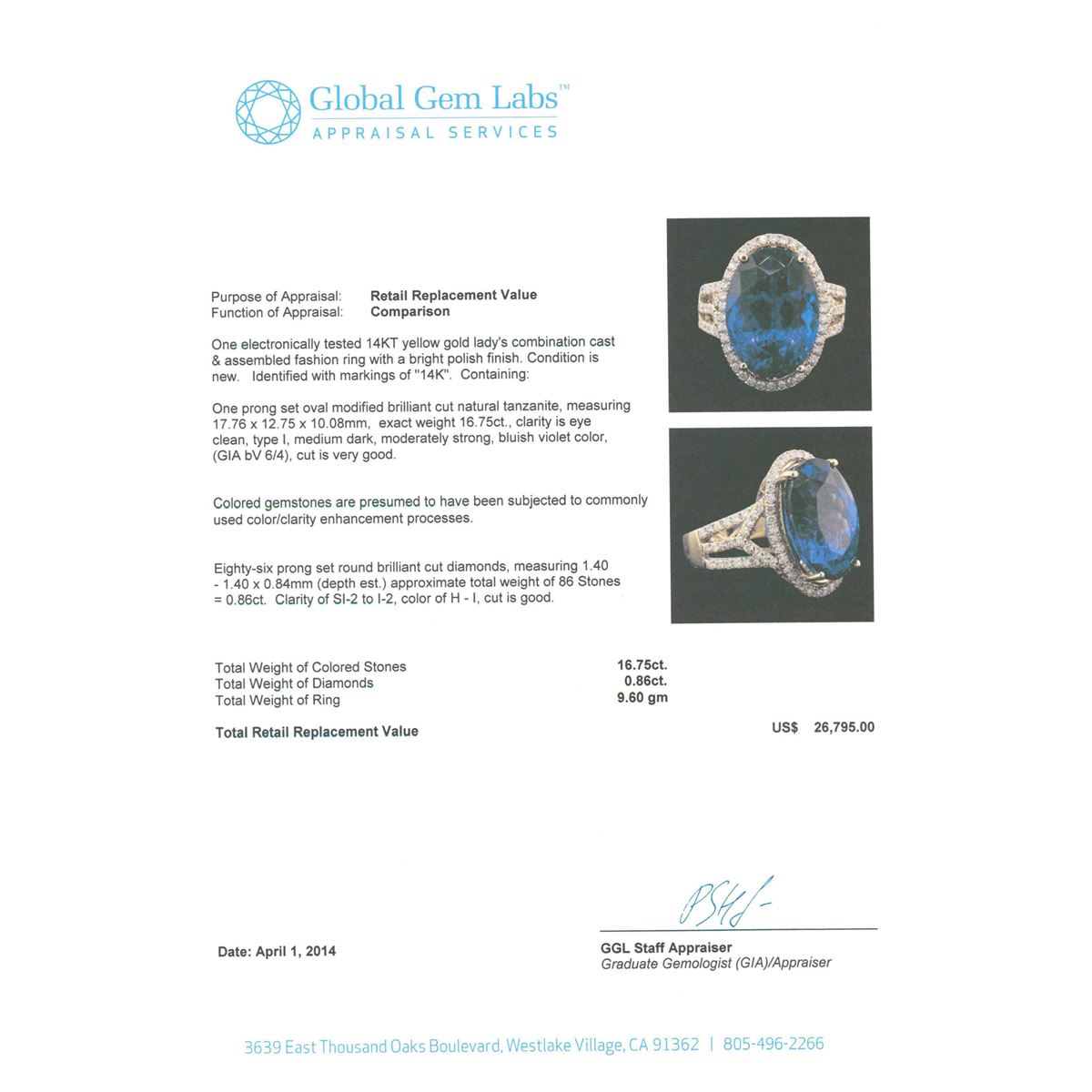 One electronically tested 14KT yellow gold Ladies combination cast & assembled fashion ring with a bright polish finish. Condition is new. Identified with markings of "14K". Containing: One prong set oval modified brilliant cut natural tanzanite, measuring 17.76 x 12.75 x 10.08mm, exact weight 16.75ct., clarity is eye clean, type I, medium dark, moderately strong, bluish violet color, (GIA bV 6/4), cut is very good. GIA Report: #2151952122.Colored gemstones are presumed to have been subjected to commonly used color/clarity enhancement processes. Eighty-Six prong set round brilliant cut diamonds, measuring 1.40 - 1.40 x 0.84mm (depth est.) approximate. Total Weight of 86 Stones = 0.86ct. Clarity: SI-2 to I-2. Color: H - I, Cut is Good. Total Weight of Colored Stones 16.75ct. Total Weight of Diamonds 0.86ct. Total Weight of Ring 9.60 grams. GGL Appraised at $26,795.00.