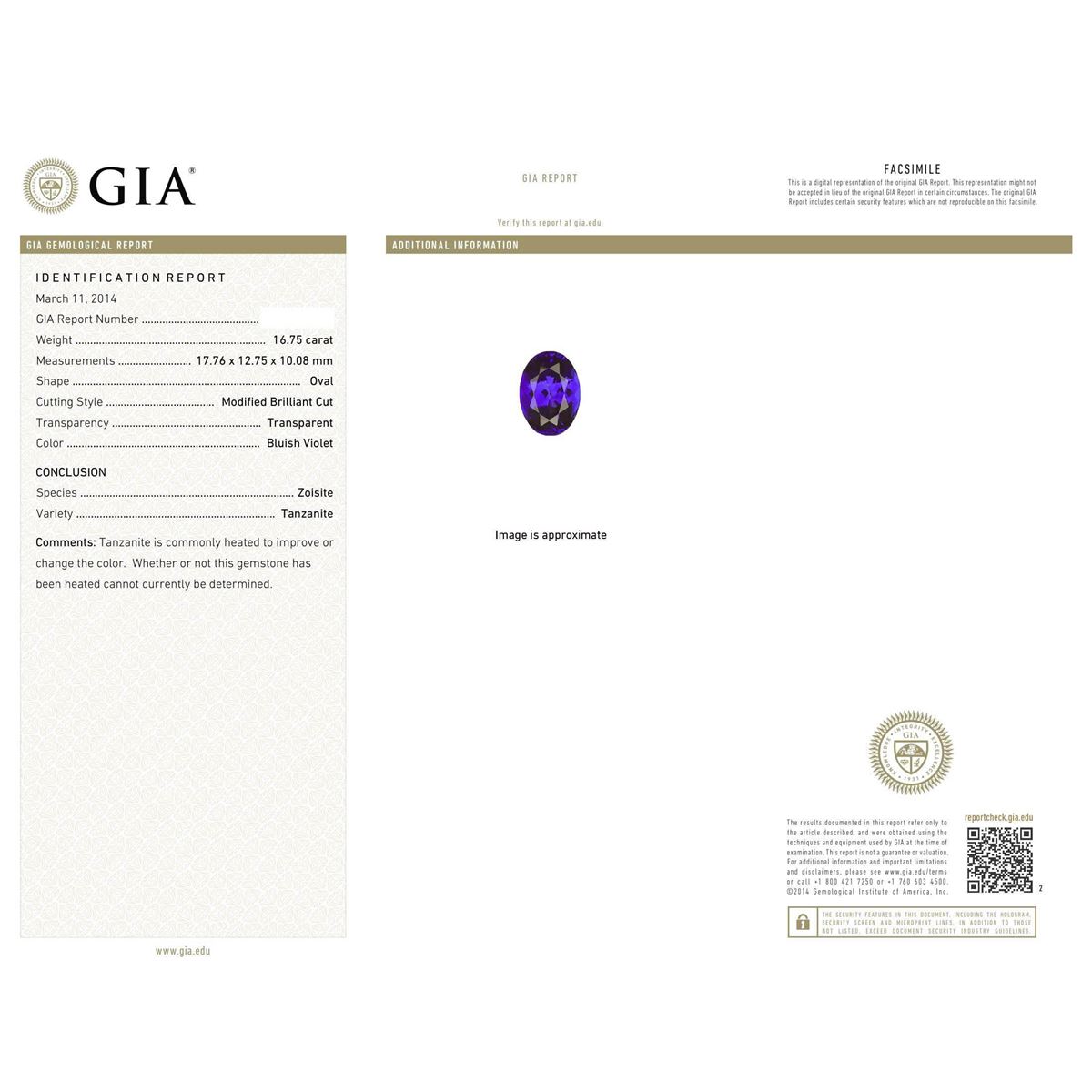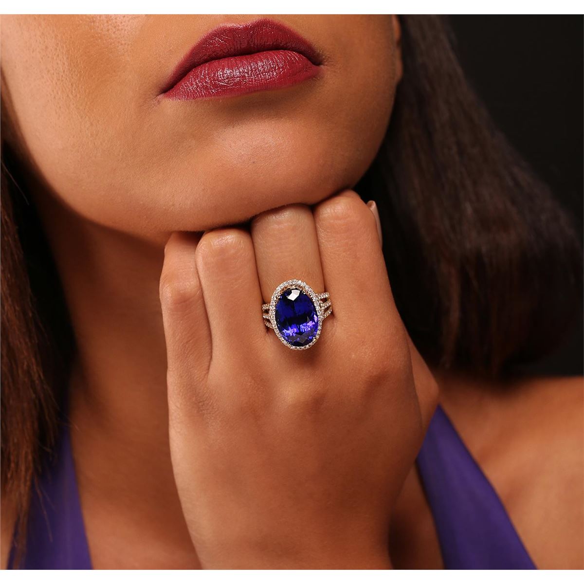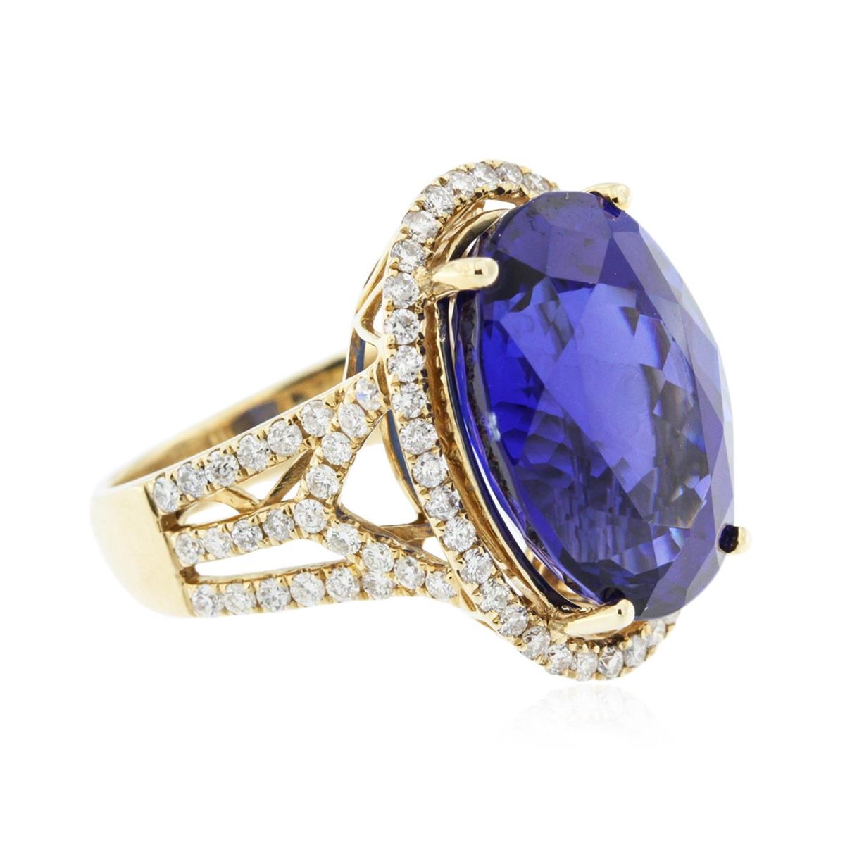 One electronically tested 14KT yellow gold Ladies combination cast & assembled fashion ring with a bright polish finish. Condition is new. Identified with markings of "14K". Containing: One prong set oval modified brilliant cut natural tanzanite, measuring 17.76 x 12.75 x 10.08mm, exact weight 16.75ct., clarity is eye clean, type I, medium dark, moderately strong, bluish violet color, (GIA bV 6/4), cut is very good. GIA Report: #2151952122.Colored gemstones are presumed to have been subjected to commonly used color/clarity enhancement processes. Eighty-Six prong set round brilliant cut diamonds, measuring 1.40 - 1.40 x 0.84mm (depth est.) approximate. Total Weight of 86 Stones = 0.86ct. Clarity: SI-2 to I-2. Color: H - I, Cut is Good. Total Weight of Colored Stones 16.75ct. Total Weight of Diamonds 0.86ct. Total Weight of Ring 9.60 grams. GGL Appraised at $26,795.00.