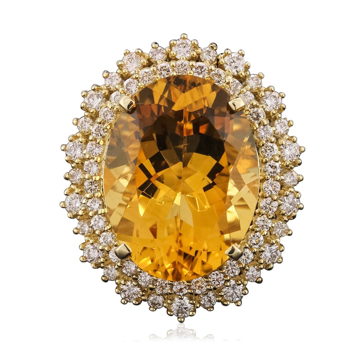 one electronically tested 14KT yellow gold ladies combination cast & assembled ring with a cathedral shank with a bright polish finish. Identified with markings of "K14". Condition is new. Containing: One prong set oval modified brilliant cut natural citrine quartz, measuring 20.06 x 14.93 x 10.41mm, approximate weight of 16.95ct., clarity is eye clean, type I, medium, brownish, orangy yellow color, (GIA oY 5/3), cut is good. Fourteen prong set round brilliant cut diamonds, measuring 2.10 - 2.10 x 1.26mm (depth est.) approximate total weight of 14 Stones = 0.48ct. Clarity: SI-1. Color: J - K, Cut is Good. Forty-Eight prong set round brilliant cut diamonds, measuring 1.50 - 1.50 x 0.90mm (depth est.) approximate total weight of 48 Stones = 0.59ct. Clarity: SI-1. Color: K - L, Cut is Good. Colored gemstones are presumed to have been subjected to commonly used enhancement processes. All diamonds and colored gemstones are graded in the mounting, unless otherwise stated. Total Weight of Colored Stones 16.95ct. Total Weight of Diamonds 1.07ct. Total Weight of Ring 13.10 grams. GGL Appraised at $6,875.00.