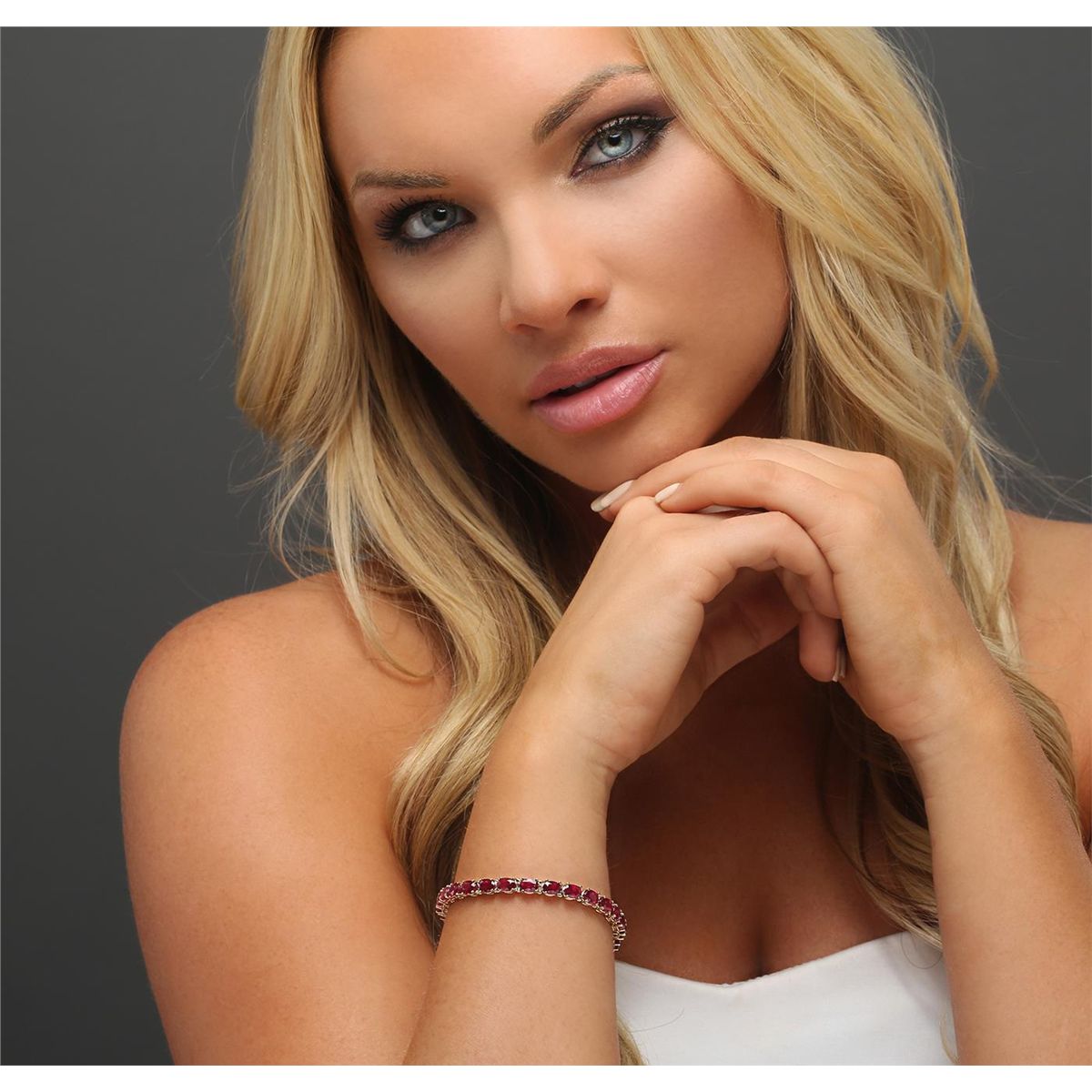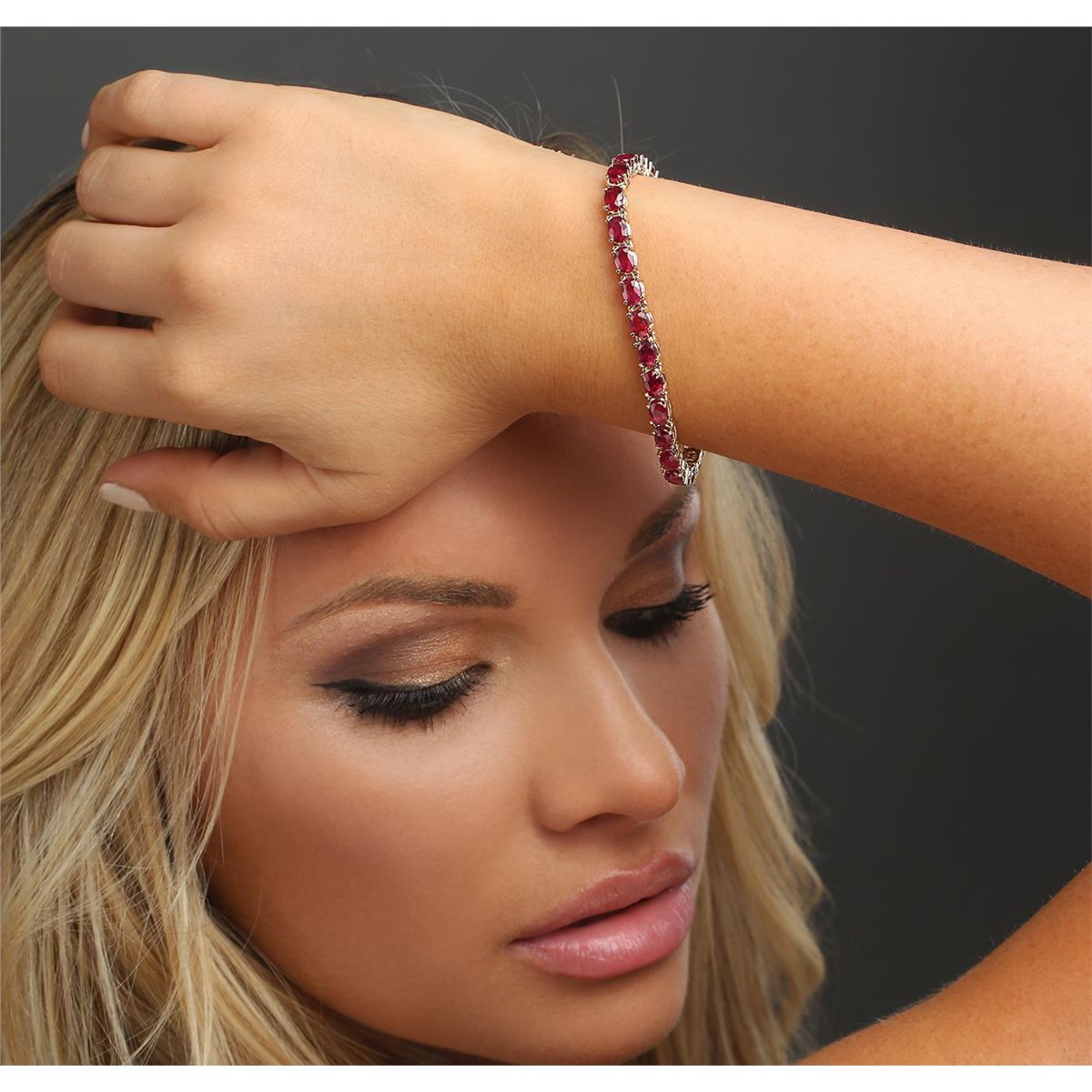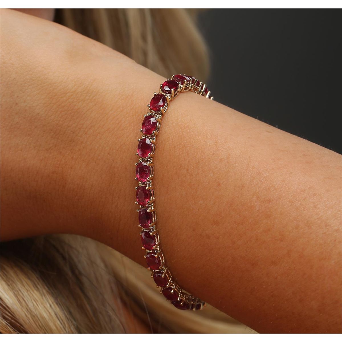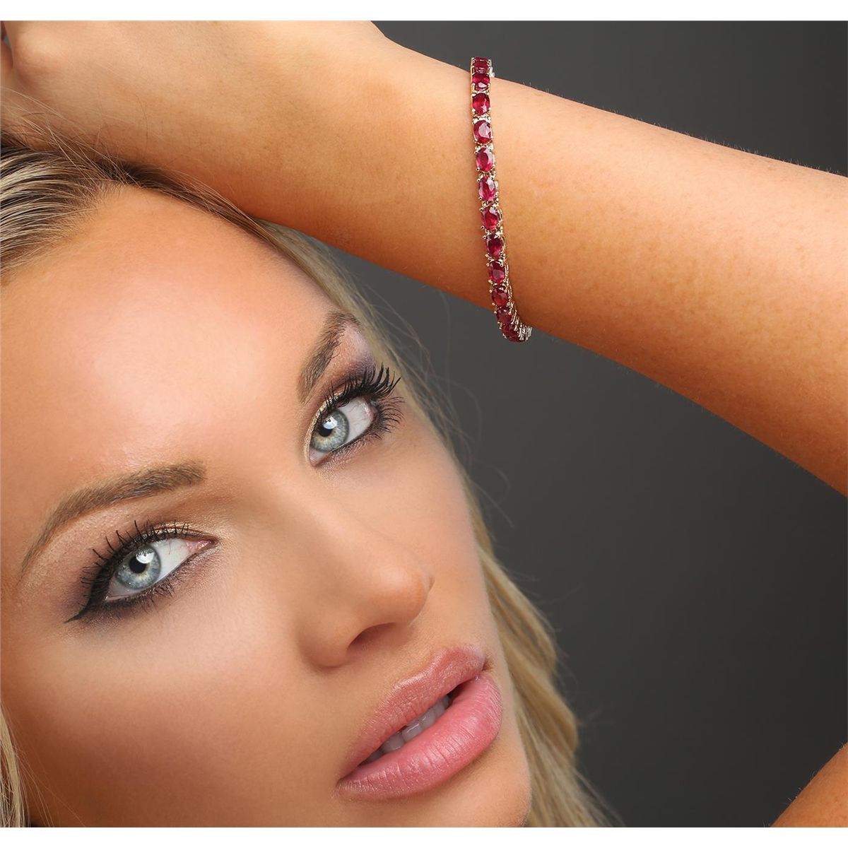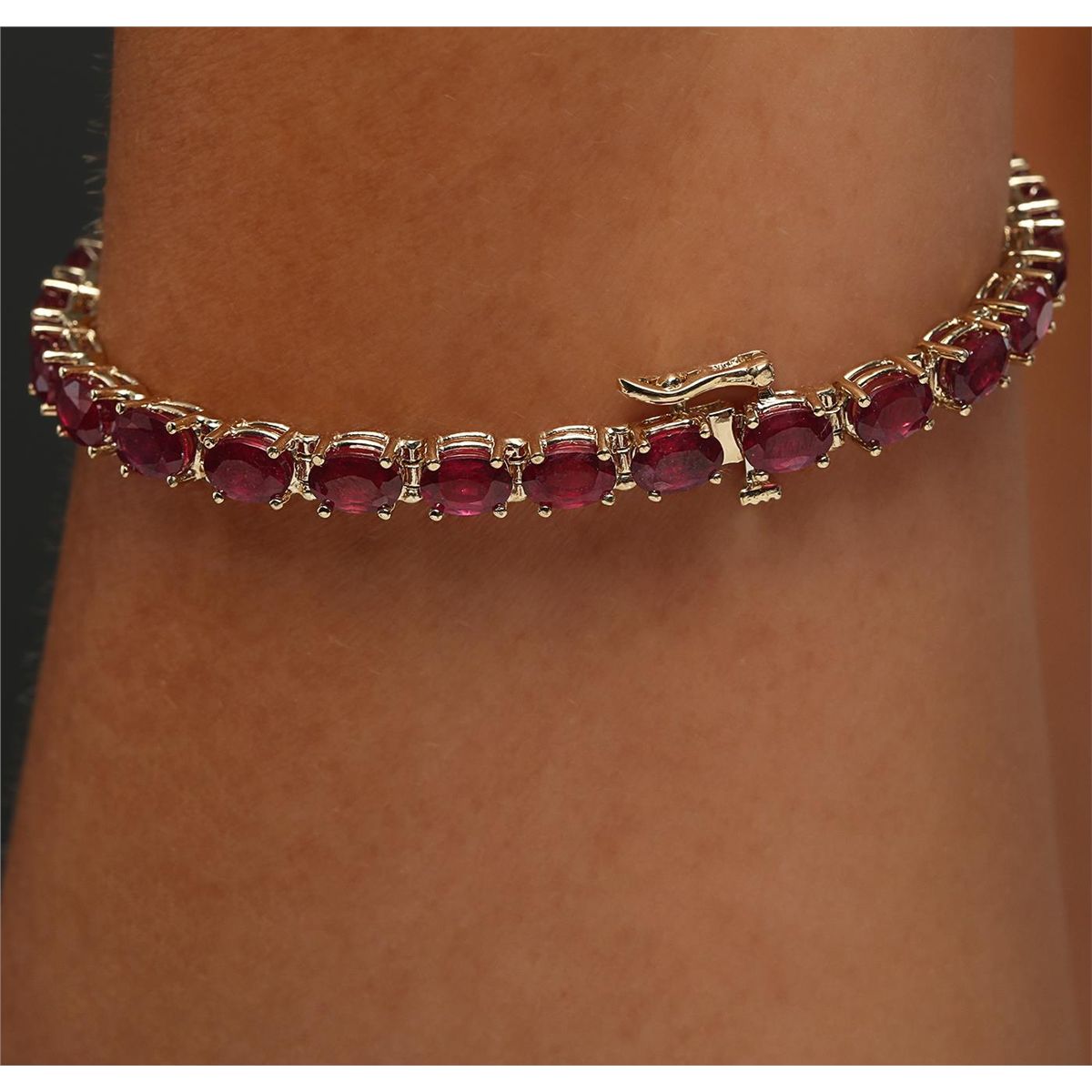 One electronically tested 14KT yellow gold ladies cast & assembled ruby bracelet with a bright polish finish. Seven inch length bracelet features a flexible ruby ribbon, terminating in a concealed clasp with safety. Identified with markings of 14K. Condition is new, good workmanship. Containing: Twenty-seven prong set oval mixed cut natural rubies, measuring 5.95 x 4.00 x 3.00mm, 6% bulge factor, approximate total weight of 17.01ct., clarity is heavily included, type II, dark, very slightly brownish, red color, (GIA R 7/3), cut is good. Transmitting light somewhat diffusely, transparent to translucent. Naturally occurring internal & external characteristics are present. Indications of laboratory high temperature heat treatment, with glass & flux additives. Measurements & the color grade are an average for the group. Graded in the setting. Ruby has a low tolerance to rhodium plating, repolishing the surface, & ultrasonic cleaning. Total Weight of Colored Stones 17.01ct. Total Weight of Bracelet 15.47 grams. AIG Appraised at $4,665.00.