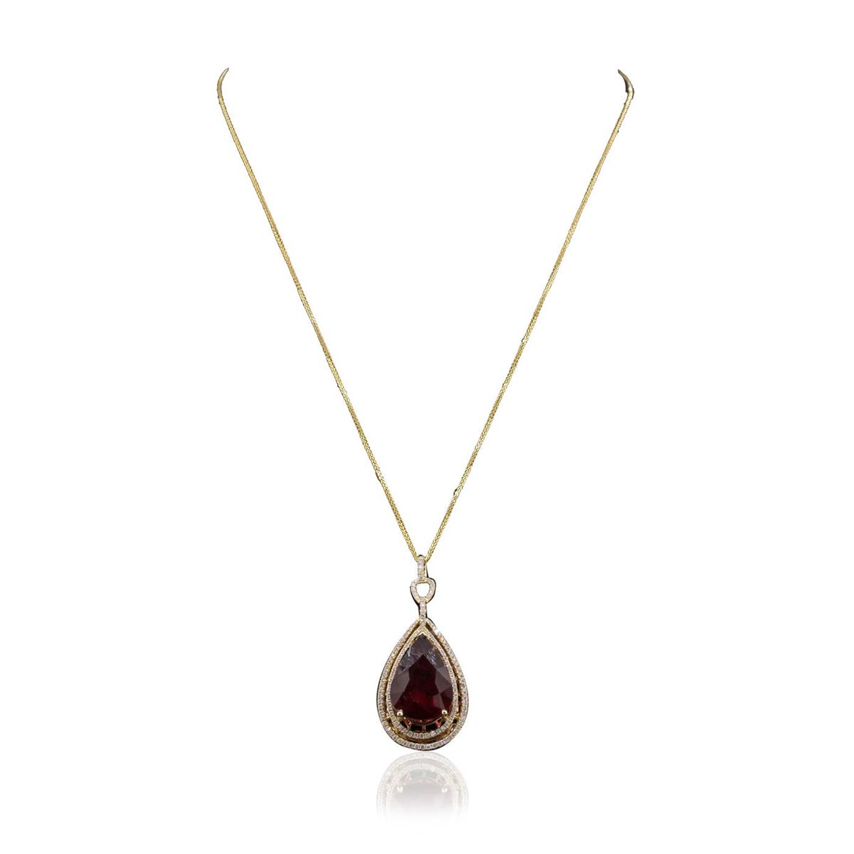 One electronically tested 14KT yellow gold Ladies combination cast & assembled pendant & chain 17.5" long, light fancy herringbone link with a lobster claw clasp with a high polish finish. Condition is new. Pendant measures: 1.25" x 0.75". Identified with markings of "14K". Containing: One prong set oval pear modified brilliant cut natural ruby, measuring 20.00 x 14.50 x 7.70mm, approximate weight of 17.06ct., clarity is heavily included, type II, medium dark, moderately strong, strongly purplish red color, (GIA stpR 6/4), cut is good. Colored gemstones are presumed to have been subjected to commonly used color/clarity enhancement processes. One Hundred Twenty-Nine bead set round brilliant cut diamonds, measuring 1.20 - 1.20 x 0.72mm (depth est.) approximate. Total Weight of 129 Stones = 0.88ct. Clarity: SI-2 to I-1. Color: G - H, Cut is Good. Total Weight of Colored Stones 17.06ct. Total Weight of Diamonds 0.88ct. Total Weight of Pendant & Chain 11.70 grams. GGL Appraised at $12,500.00.