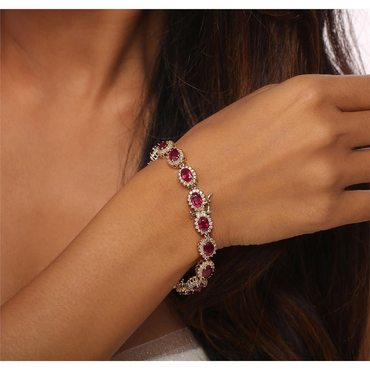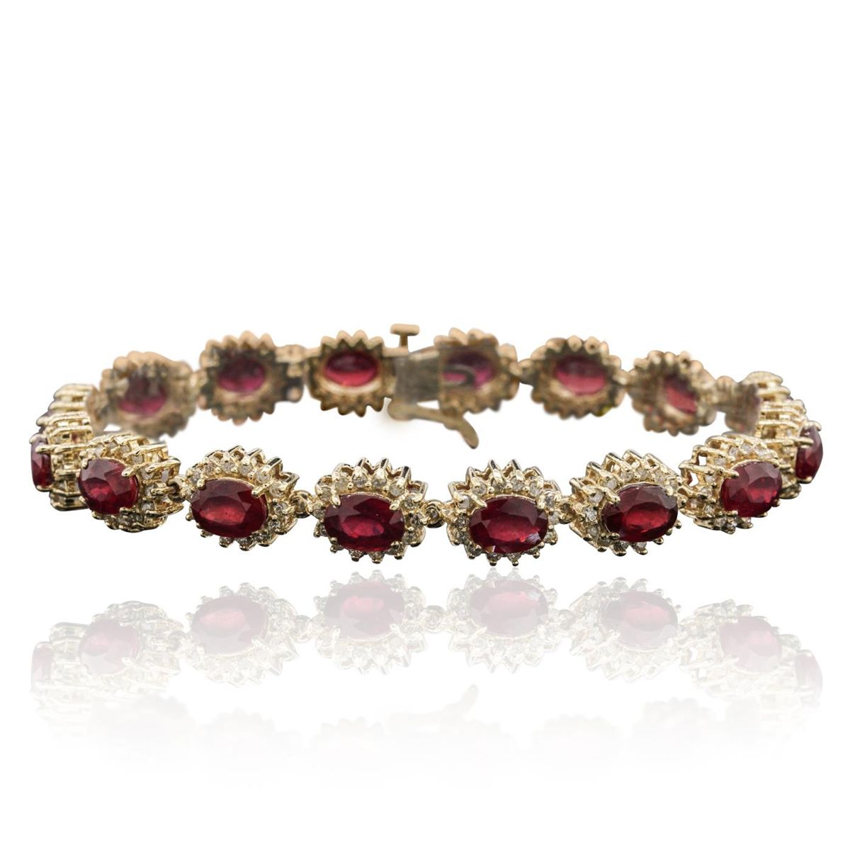 One electronically tested 14KT yellow gold ladies cast & assembled ruby and diamond bracelet with a bright polish finish. Condition is new, good workmanship. Seven and one-quarter inch length bracelet features a flexible ruby and diamond floret ribbon, terminating in a concealed clasp with safety. Identified with markings of "14K". Containing: Sixteen prong set oval mixed cut natural rubies, measuring 7.00 x 5.10 x 3.40mm, 8%. bulge factor, approximate. Total Weight of 17.28ct., clarity is heavily included, type II, medium dark, very slightly brownish, slightly purplish red color, (GIA slpR 6/3), cut is good. Transmitting light somewhat diffusely, transparent to translucent. Naturally occurring internal & external characteristics are present. Indications of laboratory high temperature heat treatment, with glass & flux additives. Measurements & the color grade are an average for the group. Graded in the setting. Ruby has a low tolerance to rhodium plating, repolishing the surface, & ultrasonic cleaning. Two Hundred Twenty-Four prong set round brilliant cut diamonds, measuring 1.40 - 1.30 x 0.81mm (depth est.) approximate. Total Weight of 224 Stones = 2.11ct. Graded in the setting. Clarity: I-1 to I-2. Color: H - J. Total Weight of Colored Stones 17.28ct. Total Weight of Diamonds 2.11ct. Total Weight of Bracelet 21.64 grams. AIG Appraised at $11,415.00.