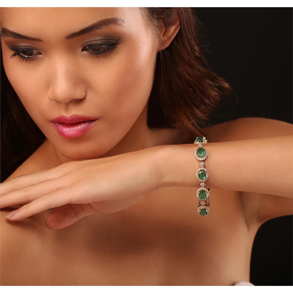 One electronically tested 14KT yellow gold Ladies combination cast & assembled bracelet with a hidden box clasp with a bright polish finish. Condition is new. Measurements: 7" in length. Identified with markings of "14K". Containing: Ten prong set oval modified brilliant cut natural emeralds, measuring 9.00 x 7.00 x 5.00mm, approximate. Total Weight of 17.40ct., clarity is heavily included, type III, medium light, very slightly grayish, green color, (GIA G 4/3), cut is good. Colored gemstones are presumed to have been subjected to commonly used color/clarity enhancement processes. Two Hundred Ninety prong set round brilliant cut diamonds, measuring 1.40 - 1.40 x 0.84mm (depth est.) approximate. Total Weight of 290 Stones = 2.90ct. Clarity: I-1 to I-2. Color: I - J, Cut is Good. Total Weight of Colored Stones 17.40ct. Total Weight of Diamonds 2.90ct. Total Weight of Bracelet 23.90 Grams. GGL Appraised at $48,180.00.