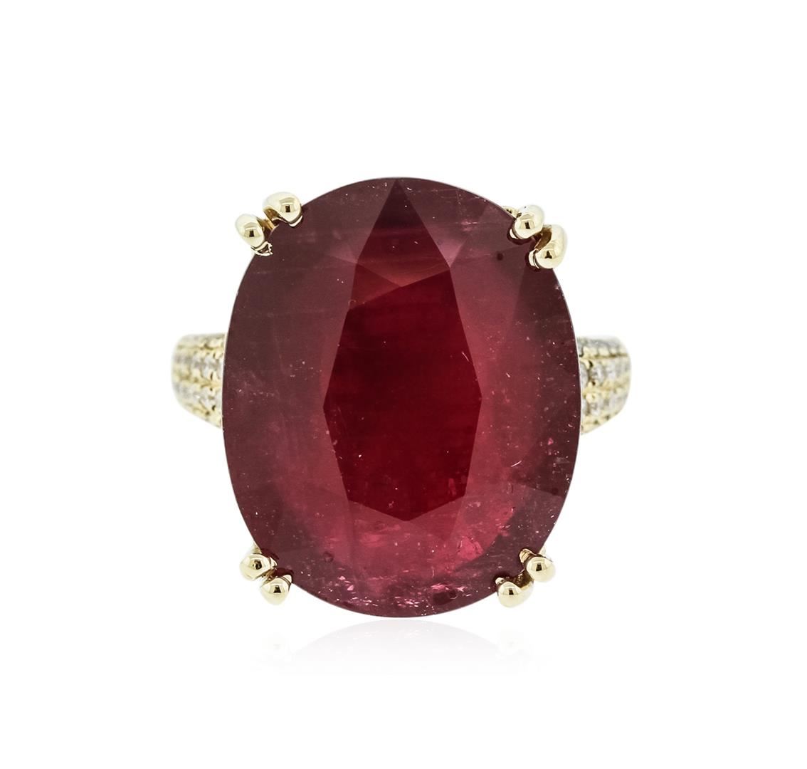 One electronically tested 14KT yellow gold ladies cast ruby and diamond ring with a bright polish finish. Identified with markings of "14K". Condition is new. Containing: One prong set oval modified brilliant cut natural ruby, measuring 20.00 x 16.00 x 6.42mm, approximate weight of 17.47ct., clarity is heavily included, type II, medium dark, moderately strong, strongly purplish red color, (GIA stpR 6/4), cut is good. Forty-Six prong set round brilliant cut diamonds, measuring 1.30 - 1.20 x 0.75mm (depth est.) approximate total weight of 46 Stones = 0.33ct. Clarity: I-1 to I-2. Color: K - L, Cut is Good. Colored gemstones are presumed to have been subjected to commonly used enhancement processes. All diamonds and colored gemstones are graded in the mounting, unless otherwise stated. Total Weight of Colored Stones 17.47ct. Total Weight of Diamonds 0.33ct. Total Weight of Ring 11.90 grams. GGL Appraised at $4,925.00.