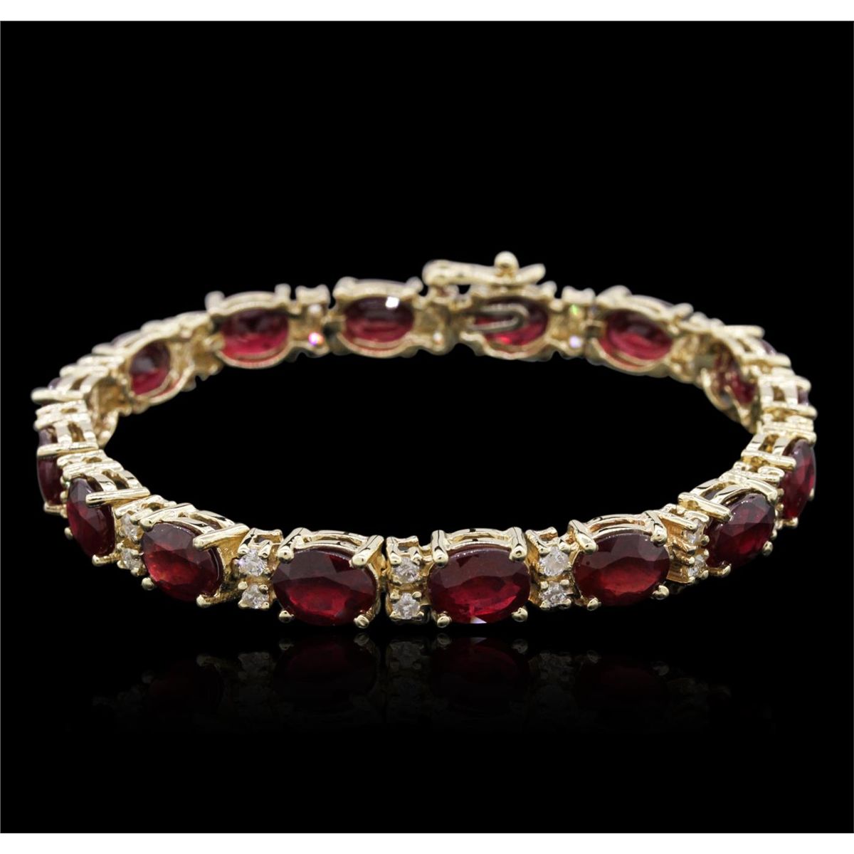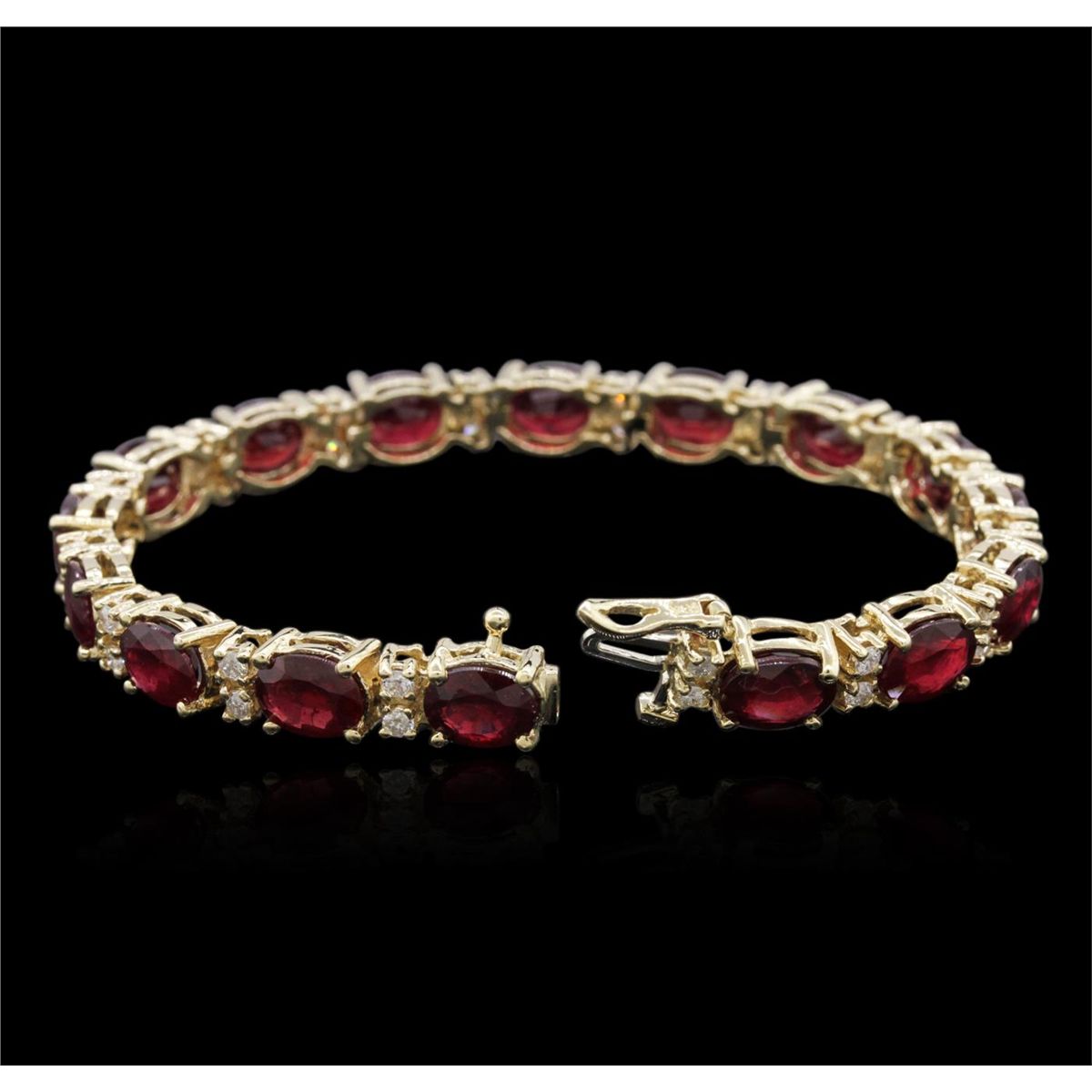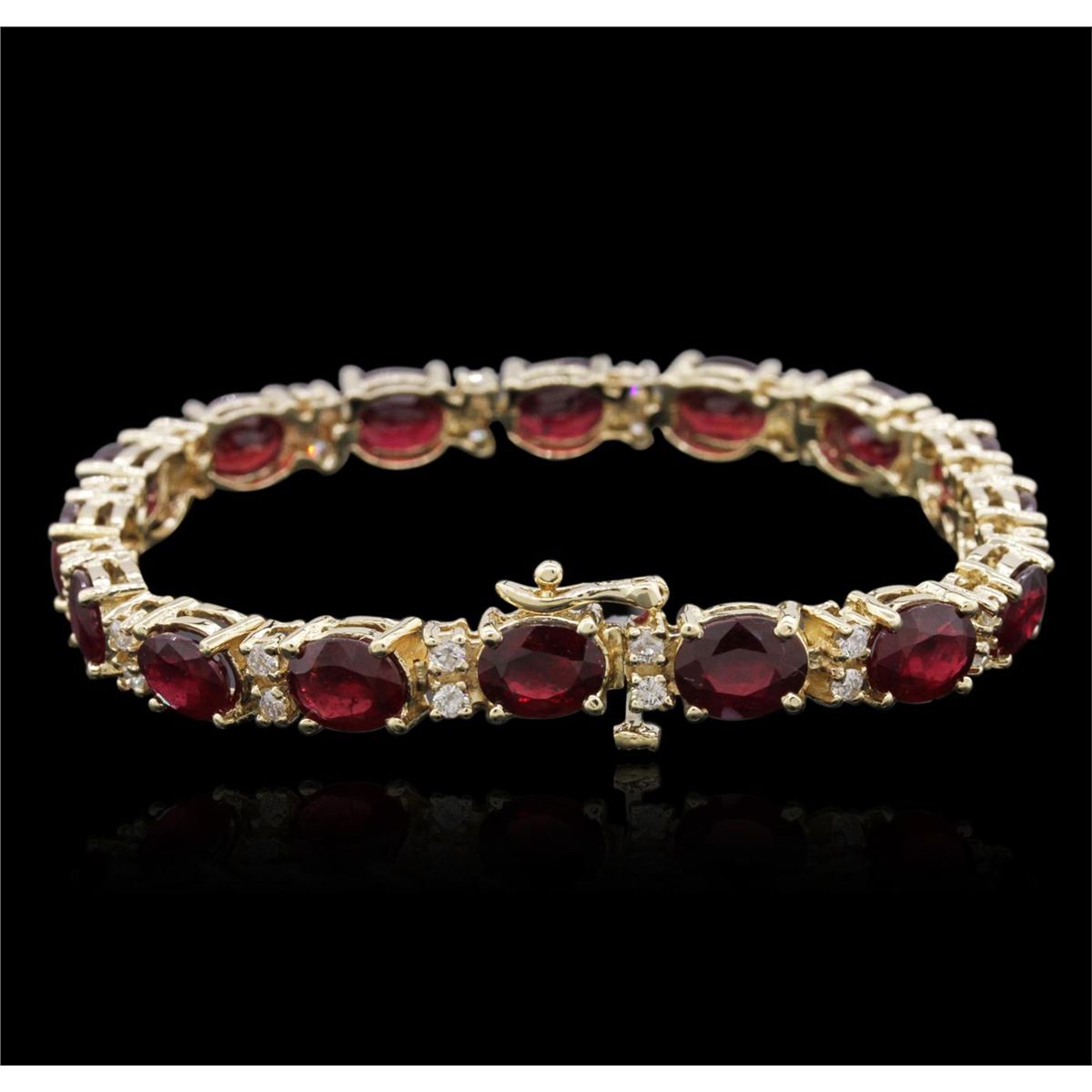 One electronically tested 14KT yellow gold ladies combination cast & assembled ruby and diamond bracelet with a hidden box clasp with a bright polish finish. Measurements: 7.25" in length. Identified with markings of "14K". Condition is new. Containing: Eighteen prong set oval modified brilliant cut natural rubies, measuring 7.50 x 4.90 x 3.19mm, approximate total weight of 17.64ct., clarity is heavily included, type II, medium dark, very slightly brownish, strongly purplish red color, (GIA stpR 6/3), cut is good. Thirty-Two prong set round brilliant cut diamonds, measuring 1.60 - 1.60 x 0.96mm (depth est.) approximate total weight of 32 Stones = 0.48ct. Clarity: I-1 to I-2. Color: J - K, Cut is Good. Colored gemstones are presumed to have been subjected to commonly used enhancement processes. All diamonds and colored gemstones are graded in the mounting, unless otherwise stated. Total Weight of Colored Stones 17.64ct. Total Weight of Diamonds 0.48ct. Total Weight of Bracelet 21.20 grams. GGL Appraised at $9,605.00.