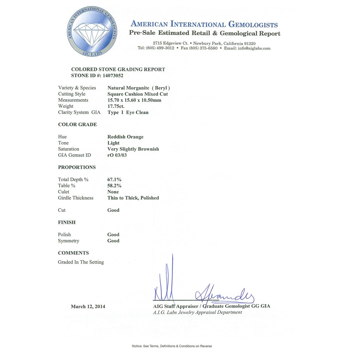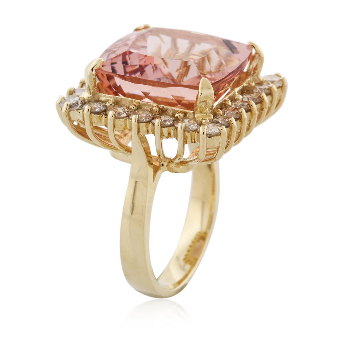 One electronically tested 14KT yellow gold ladies cast morganite and diamond ring with a bright polish finish. Condition is new, good workmanship. The featured morganite is set within a diamond bezel, completed by a three and one-half millimeter wide band. Identified with markings of "K14". Containing: One prong set square cushion mixed cut natural morganite, measuring 15.70 x 15.60 x 10.50mm, 8%. bulge factor, approximate weight of 17.75ct., clarity is eye clean, type I, light, very slightly brownish, reddish orange color, (GIA rO 3/3), cut is good. Transmitting light with no distortion, transparent. Colored Stone Grading Report attached. Graded in the setting. Twenty-Four prong set round brilliant cut diamonds, measuring 2.80 - 2.70 x 1.65mm (depth est.) approximate. Total Weight of 24 Stones = 1.92ct. Faint secondary color throughout. Graded in the setting. Clarity: SI-2 to I-1. Color: K - M. Total Weight of Colored Stones 17.75ct. Total Weight of Diamonds 1.92ct. Total Weight of Ring 12.90 grams. AIG Appraised at $18,380.00.