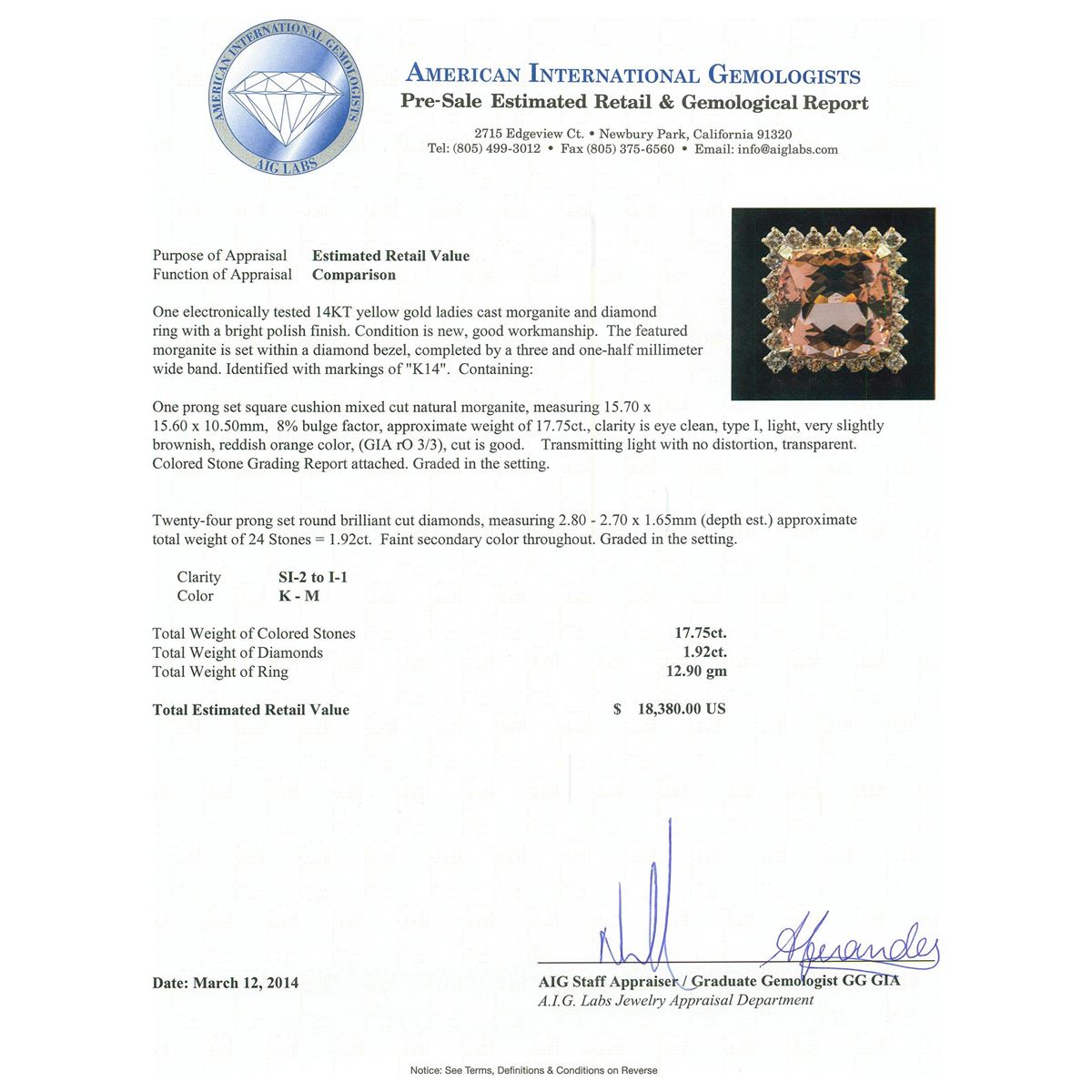 One electronically tested 14KT yellow gold ladies cast morganite and diamond ring with a bright polish finish. Condition is new, good workmanship. The featured morganite is set within a diamond bezel, completed by a three and one-half millimeter wide band. Identified with markings of "K14". Containing: One prong set square cushion mixed cut natural morganite, measuring 15.70 x 15.60 x 10.50mm, 8%. bulge factor, approximate weight of 17.75ct., clarity is eye clean, type I, light, very slightly brownish, reddish orange color, (GIA rO 3/3), cut is good. Transmitting light with no distortion, transparent. Colored Stone Grading Report attached. Graded in the setting. Twenty-Four prong set round brilliant cut diamonds, measuring 2.80 - 2.70 x 1.65mm (depth est.) approximate. Total Weight of 24 Stones = 1.92ct. Faint secondary color throughout. Graded in the setting. Clarity: SI-2 to I-1. Color: K - M. Total Weight of Colored Stones 17.75ct. Total Weight of Diamonds 1.92ct. Total Weight of Ring 12.90 grams. AIG Appraised at $18,380.00.