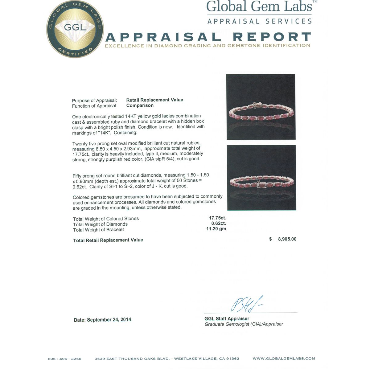 One electronically tested 14KT yellow gold ladies combination cast & assembled ruby and diamond bracelet with a hidden box clasp with a bright polish finish. Identified with markings of "14K". Condition is new. Containing: Twenty-five prong set oval modified brilliant cut natural rubies, measuring 6.50 x 4.50 x 2.93mm, approximate total weight of 17.75ct., clarity is heavily included, type II, medium, moderately strong, strongly purplish red color, (GIA stpR 5/4), cut is good. Fifty prong set round brilliant cut diamonds, measuring 1.50 - 1.50 x 0.90mm (depth est.) approximate total weight of 50 Stones = 0.62ct. Clarity: SI-1 to SI-2. Color: J - K, Cut is Good. Colored gemstones are presumed to have been subjected to commonly used enhancement processes. All diamonds and colored gemstones are graded in the mounting, unless otherwise stated. Total Weight of Colored Stones 17.75ct. Total Weight of Diamonds 0.62ct. Total Weight of Bracelet 11.20 grams. GGL Appraised at $8,905.00.