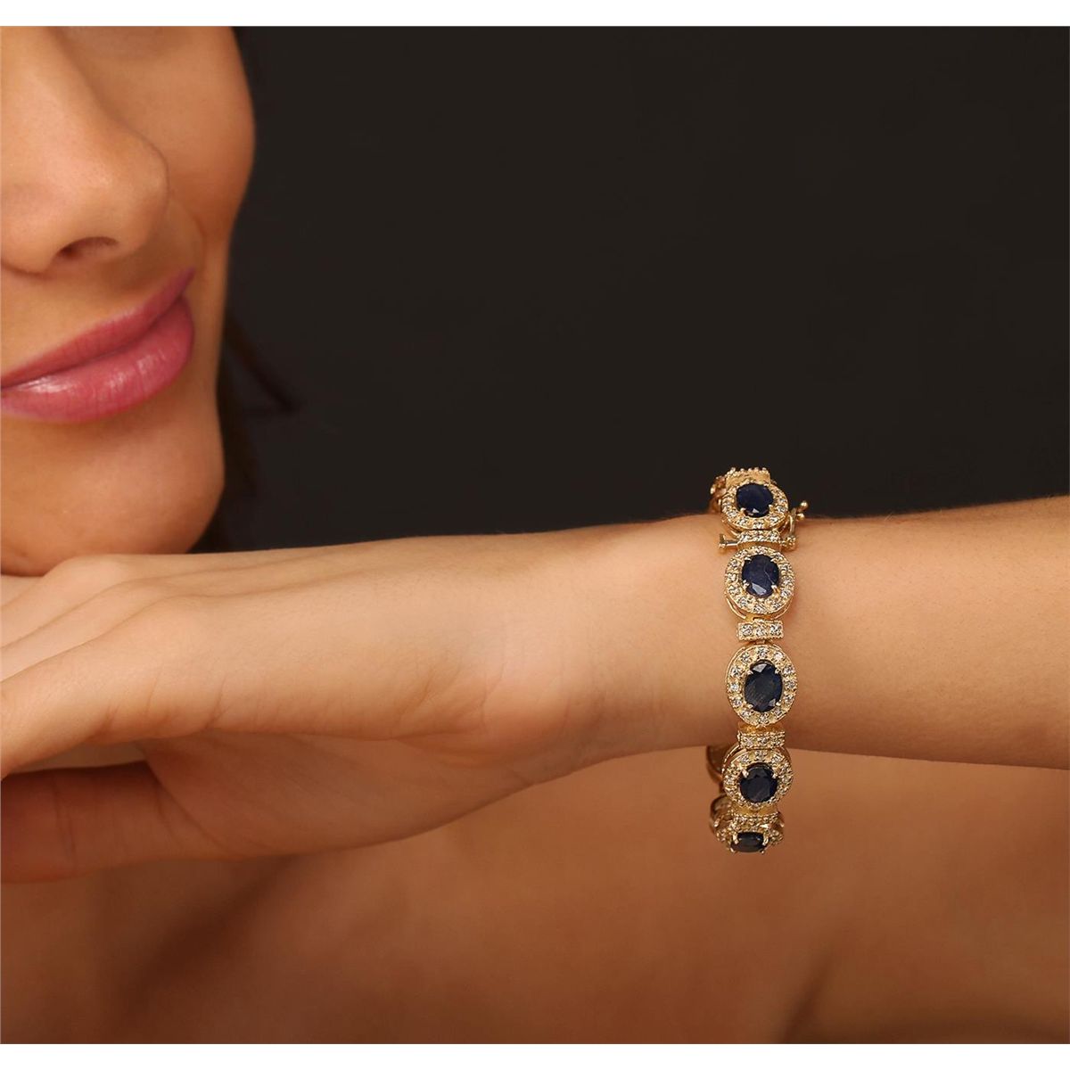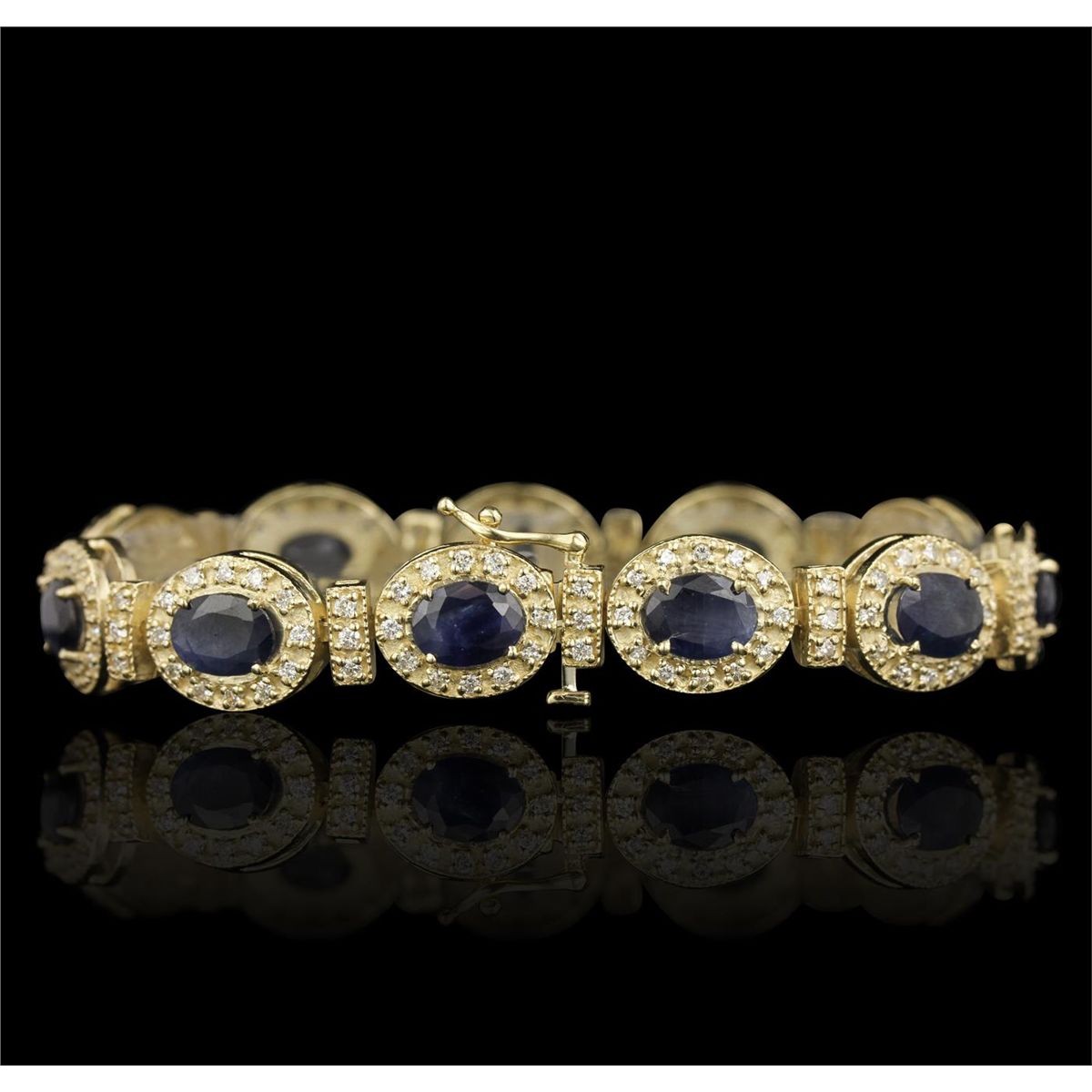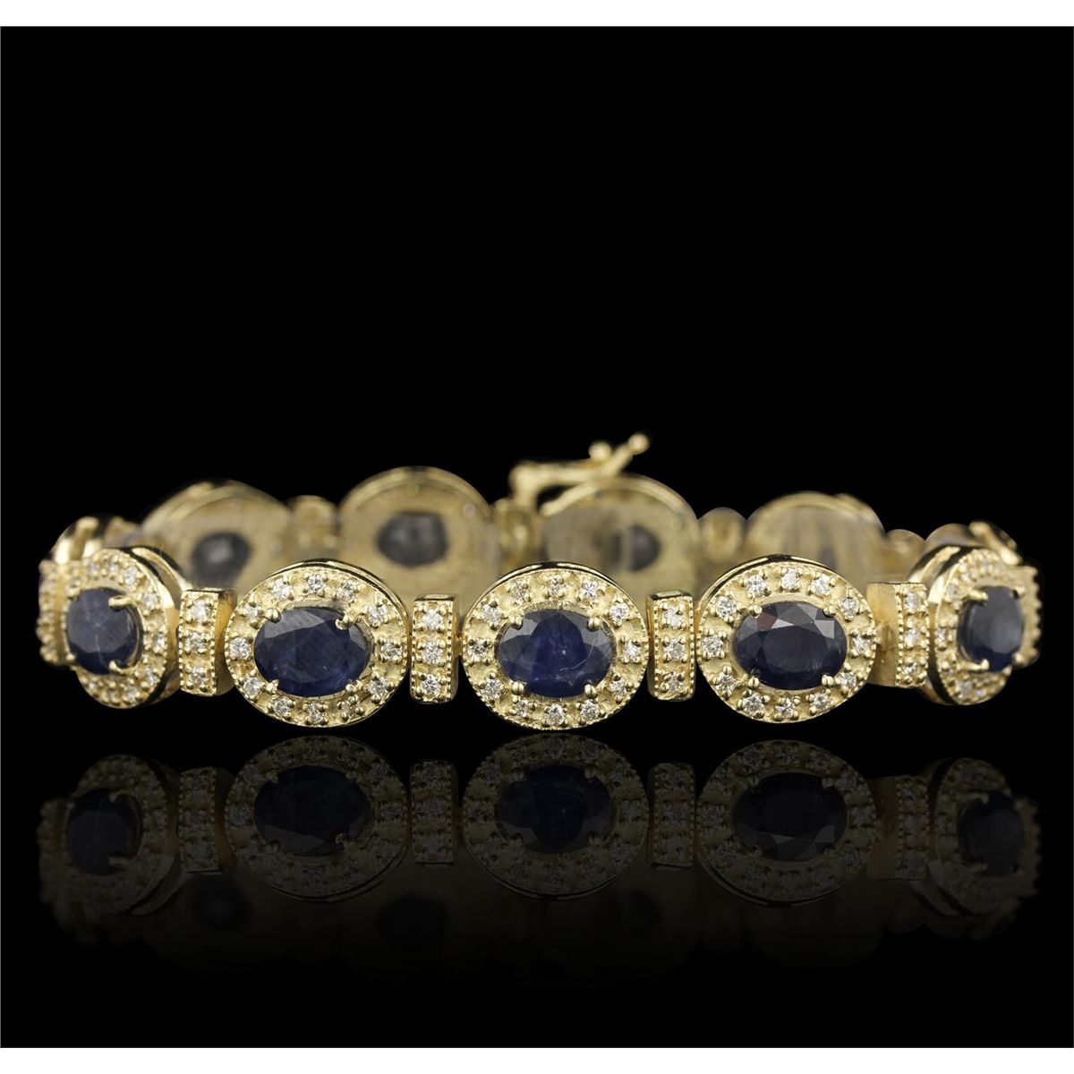 One electronically tested 14KT yellow gold ladies cast & assemble sapphire and diamond bracelet. Condition is new, good workmanship. Seven inch length bracelet features a ribbon of sapphire and diamond bezels, alternated by vertically placed diamond set bar links, terminating in a concealed clasp with safety. Bright polish finish with milgrain detailing throughout. Identified with markings of "14KT". Containing: Eleven prong set oval mixed cut natural blue sapphires, measuring 8.00 x 6.00 x 3.90 mm, 6% bulge factor, approximate total weight of 17.82ct, clarity is heavily included, type II, medium dark, very slightly grayish, violetish blue color, (GIA vB 6/3), cut is good. Transmitting light somewhat diffusely, translucent. Naturally occurring internal & external characteristics are present, including partial color zoning. Measurements & the color grade are an average for the group. Graded in the setting. One hundred sixty-five prong set round brilliant cut diamonds, measuring 1.50 - 1.40 x 0.87mm (depth est.) approximate total weight of 165 Stones = 1.93ct. The clarity grade reflects the entire range of clarity for this group. Graded in the setting. Clarity VS-2 to I-1. Color G-I. Total Weight of Colored Stones 17.92ct. Total Weight of Diamonds 1.93ct. Total Weight of Bracelet 29.50 grams. AIG Appraised at $17,145.00.