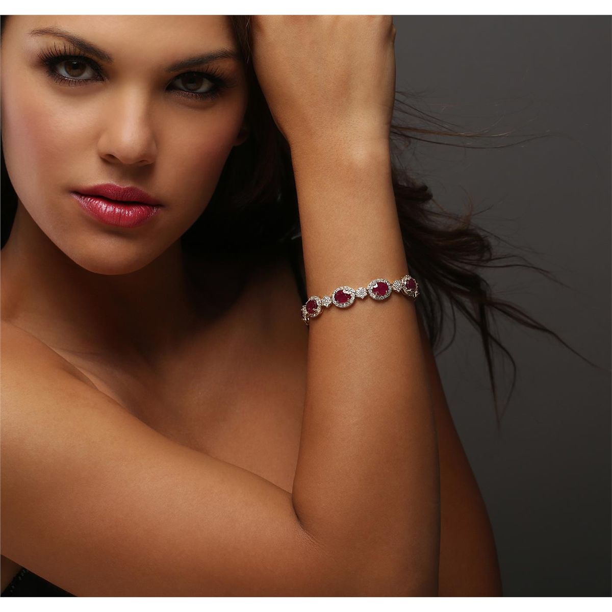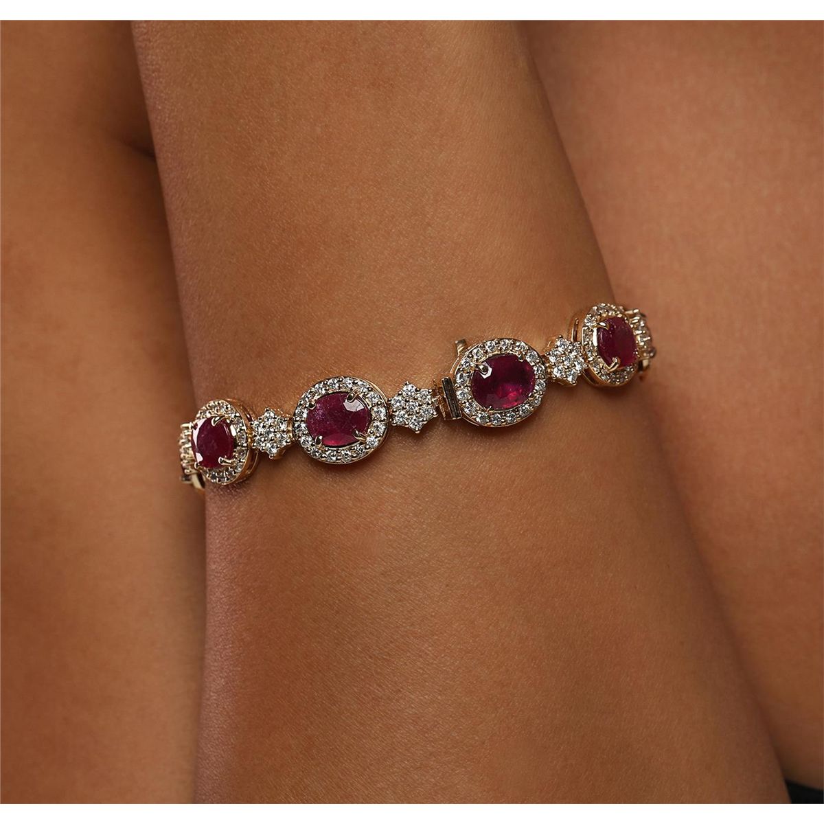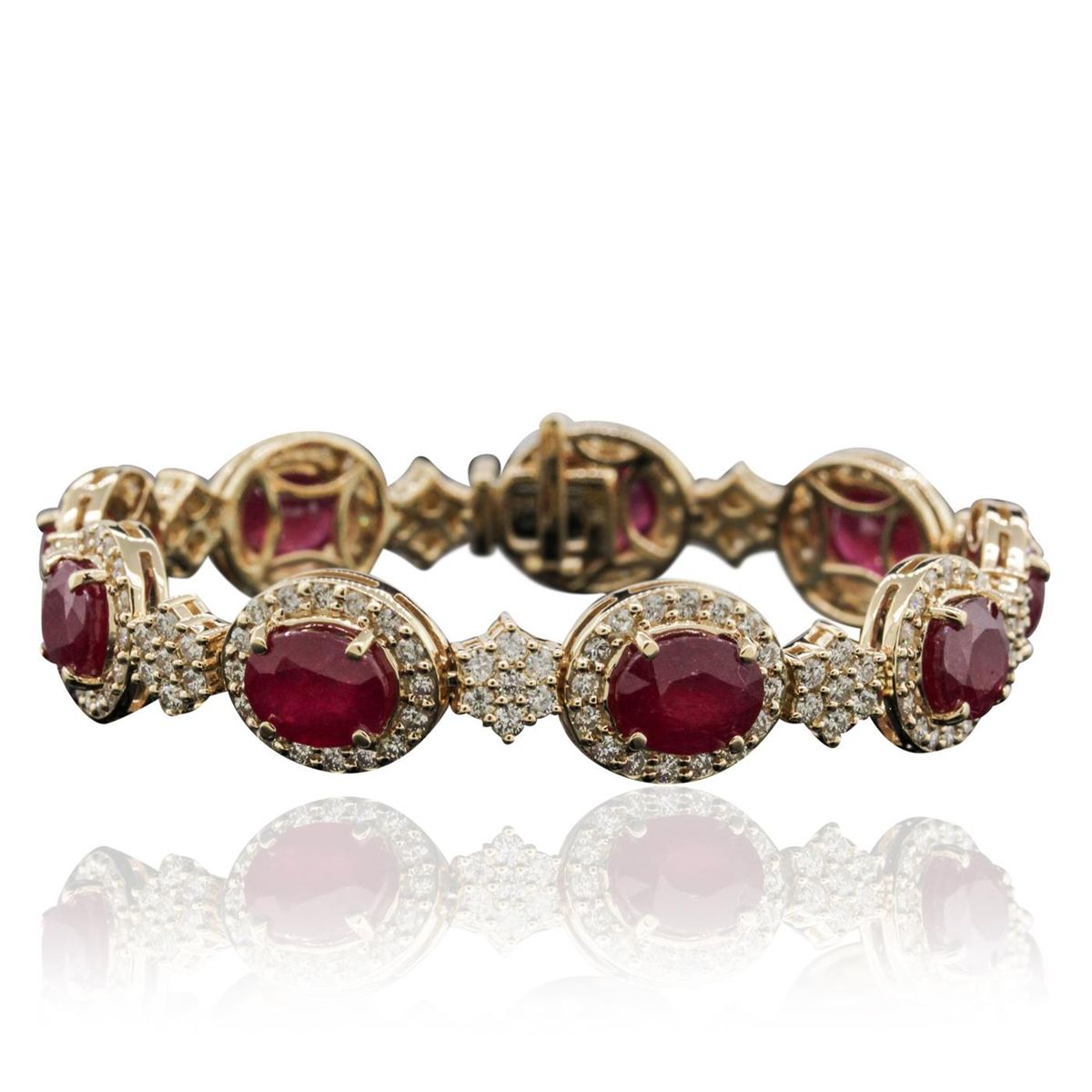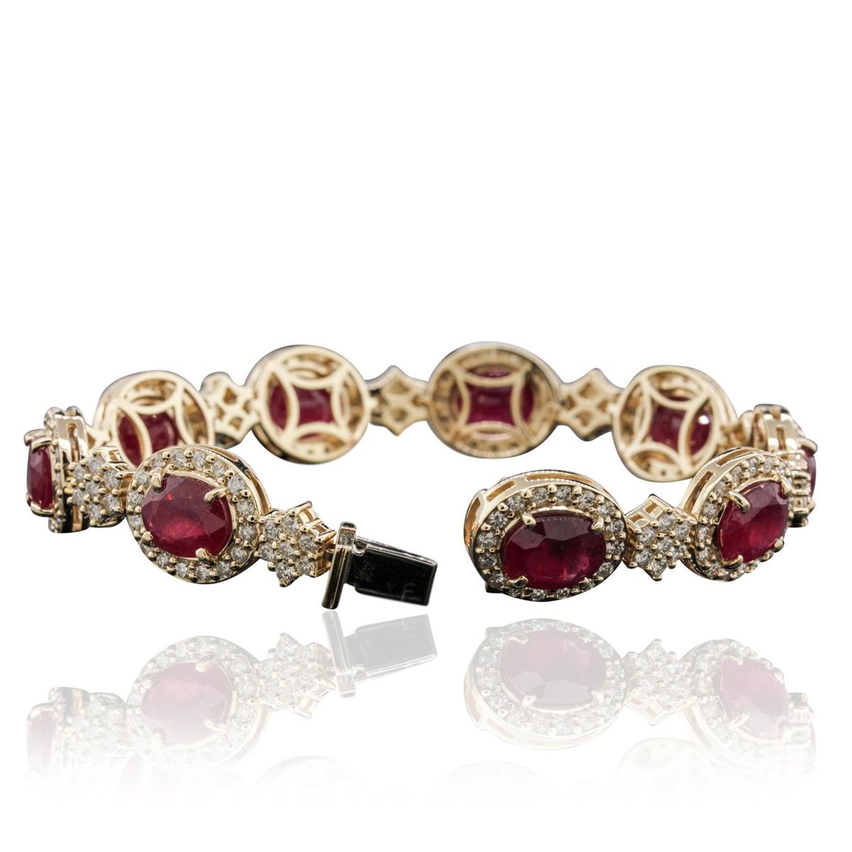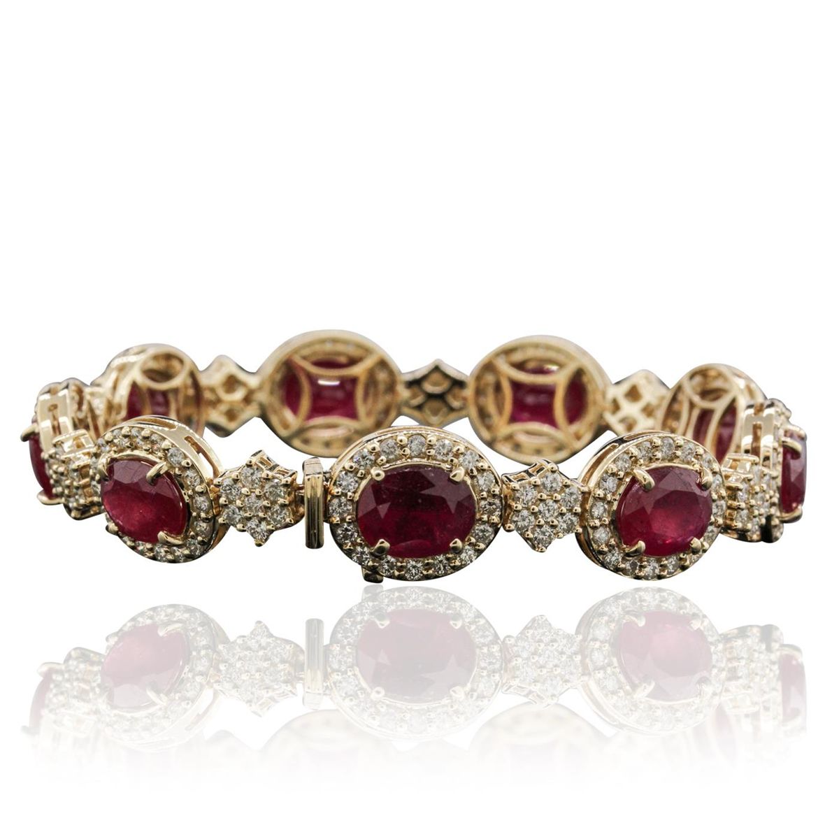 One electronically tested 14KT yellow gold ladies combination cast & assembled ruby and diamond bracelet with a hidden box clasp with safety closer with a bright polish finish. Measurements: 7.25" in length. Identified with markings of "14K". Condition is new. Containing: Nine prong set oval modified brilliant cut natural rubies, measuring 9.11 x 7.15 x 3.77mm, approximate total weight of 17.91ct., clarity is heavily included, type II, medium dark, moderately strong, strongly purplish red color, (GIA stpR 6/4), cut is very good. Two Hundred Seven prong set round brilliant cut diamonds, measuring 1.60 - 1.30 x 0.87mm (depth est.) approximate total weight of 207 Stones = 2.30ct. Clarity: SI-2 to I-2. Color: H - I, Cut is Good. Colored gemstones are presumed to have been subjected to commonly used enhancement processes. All diamonds and colored gemstones are graded in the mounting, unless otherwise stated. Total Weight of Colored Stones 17.91ct. Total Weight of Diamonds 2.30ct. Total Weight of Bracelet 29.00 grams. GGL Appraised at $20,760.00. AIG Appraised at $4,105.00.