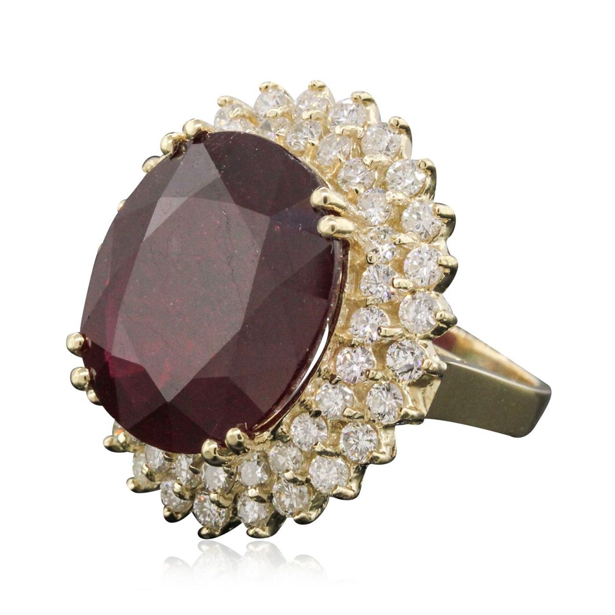 One electronically tested 14KT yellow gold ladies combination cast & assembled ring with a bright polish finish. Condition is new. Identified with markings of "K14". Containing: One prong set oval modified brilliant cut natural ruby, measuring 18.37 x 15.71 x 7.73mm, approximate weight of 17.96ct., clarity is heavily included, type II, dark, moderately strong, strongly purplish red color, (GIA stpR 7/4), cut is good. Twenty-Six prong set round brilliant cut diamonds, measuring 2.20 - 2.20 x 1.32mm (depth est.) approximate. Total Weight of 26 Stones = 1.01ct. Clarity: SI-2 to I-1. Color: K - L, Cut is Good. Twenty-Six prong set round brilliant cut diamonds, measuring 2.00 - 2.00 x 1.20mm (depth est.) approximate. Total Weight of 26 Stones = 0.76ct. Clarity: SI-2 to I-1. Color: K - L, Cut is Good. Colored gemstones are presumed to have been subjected to commonly used enhancement processes. All diamonds and colored gemstones are graded in the mounting, unless otherwise stated. Total Weight of Colored Stones 17.96ct. Total Weight of Diamonds 1.77ct. Total Weight of Ring 14.80 grams. GGL Appraised at $13,735.00.
