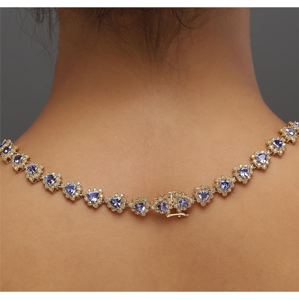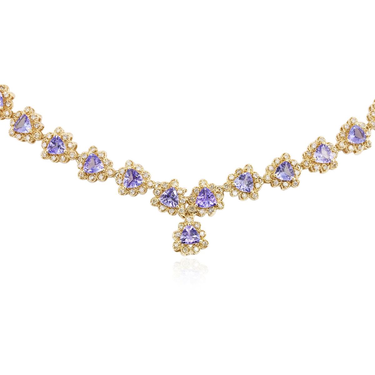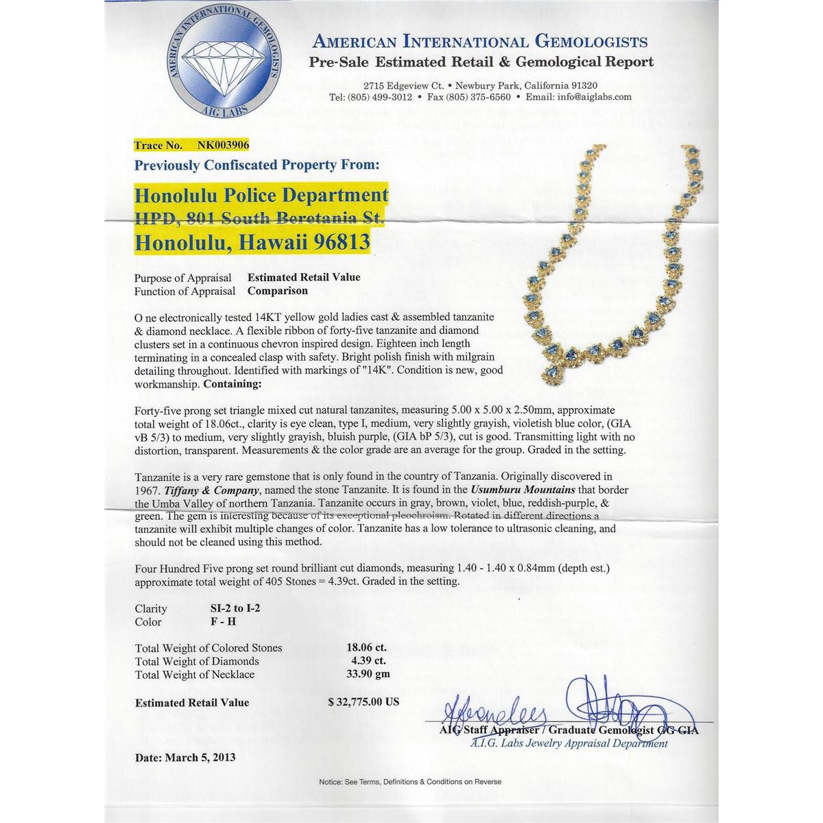 One electronically tested 14KT yellow gold ladies cast & assembled tanzanite & diamond necklace. A flexible ribbon of forty-five tanzanite and diamond clusters set in a continuous chevron inspired design. Eighteen inch length terminating in a concealed clasp with safety. Bright polish finish with milgrain detailing throughout. Identified with markings of 14K. Condition is new, good workmanship. Containing: Forty-five prong set triangle mixed cut natural tanzanites, measuring 5.00 x 5.00 x 2.50mm, approximate total weight of 18.06ct., clarity is eye clean, type I, medium, very slightly grayish, violetish blue color, (GIA vB 5/3) to medium, very slightly grayish, bluish purple, (GIA bP 5/3), cut is good. Transmitting light with no distortion, transparent. Measurements & the color grade are an average for the group. Graded in the setting. Tanzanite is a very rare gemstone that is only found in the country of Tanzania. Originally discovered in 1967. Tiffany & Company, named the stone Tanzanite. It is found in the Usumburu Mountains that border the Umba Valley of northern Tanzania. Tanzanite occurs in gray, brown, violet, blue, reddish-purple, & green. The gem is interesting because of its exceptional pleochroism. Rotated in different directions a tanzanite will exhibit multiple changes of color. Tanzanite has a low tolerance to ultrasonic cleaning, and should not be cleaned using this method. Four hundred five prong set round brilliant cut diamonds, measuring 1.40 - 1.40 x 0.84mm (depth est.) approximate total weight of 405 stones = 4.39ct. Graded in the setting. Clarity: SI-2 to I-2. Color: F-H. Total weight of colored stones 18.06ct. Total weight of diamonds 4.39ct. Total weight of necklace 33.90 grams. AIG Appraised at $32,775.00.