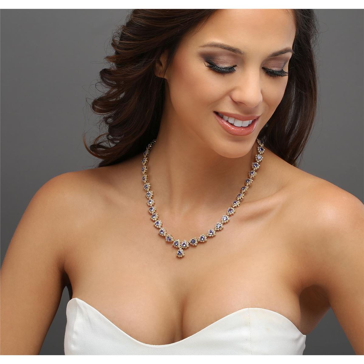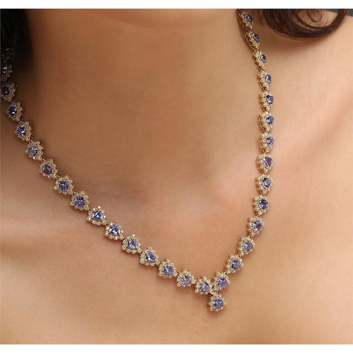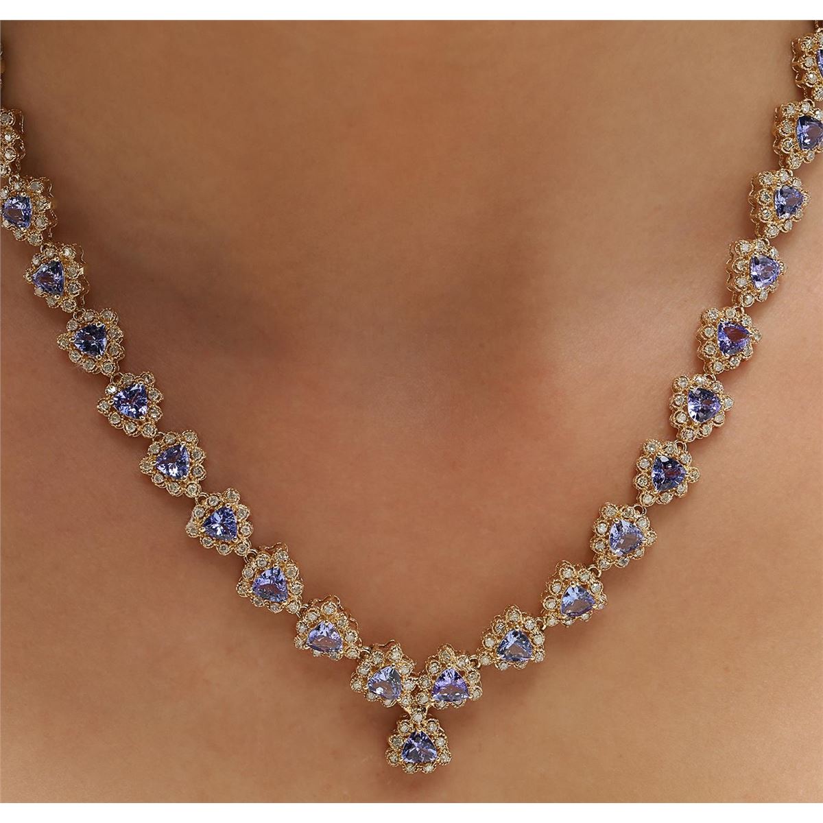 One electronically tested 14KT yellow gold ladies cast & assembled tanzanite & diamond necklace. A flexible ribbon of forty-five tanzanite and diamond clusters set in a continuous chevron inspired design. Eighteen inch length terminating in a concealed clasp with safety. Bright polish finish with milgrain detailing throughout. Identified with markings of 14K. Condition is new, good workmanship. Containing: Forty-five prong set triangle mixed cut natural tanzanites, measuring 5.00 x 5.00 x 2.50mm, approximate total weight of 18.06ct., clarity is eye clean, type I, medium, very slightly grayish, violetish blue color, (GIA vB 5/3) to medium, very slightly grayish, bluish purple, (GIA bP 5/3), cut is good. Transmitting light with no distortion, transparent. Measurements & the color grade are an average for the group. Graded in the setting. Tanzanite is a very rare gemstone that is only found in the country of Tanzania. Originally discovered in 1967. Tiffany & Company, named the stone Tanzanite. It is found in the Usumburu Mountains that border the Umba Valley of northern Tanzania. Tanzanite occurs in gray, brown, violet, blue, reddish-purple, & green. The gem is interesting because of its exceptional pleochroism. Rotated in different directions a tanzanite will exhibit multiple changes of color. Tanzanite has a low tolerance to ultrasonic cleaning, and should not be cleaned using this method. Four hundred five prong set round brilliant cut diamonds, measuring 1.40 - 1.40 x 0.84mm (depth est.) approximate total weight of 405 stones = 4.39ct. Graded in the setting. Clarity: SI-2 to I-2. Color: F-H. Total weight of colored stones 18.06ct. Total weight of diamonds 4.39ct. Total weight of necklace 33.90 grams. AIG Appraised at $32,775.00.