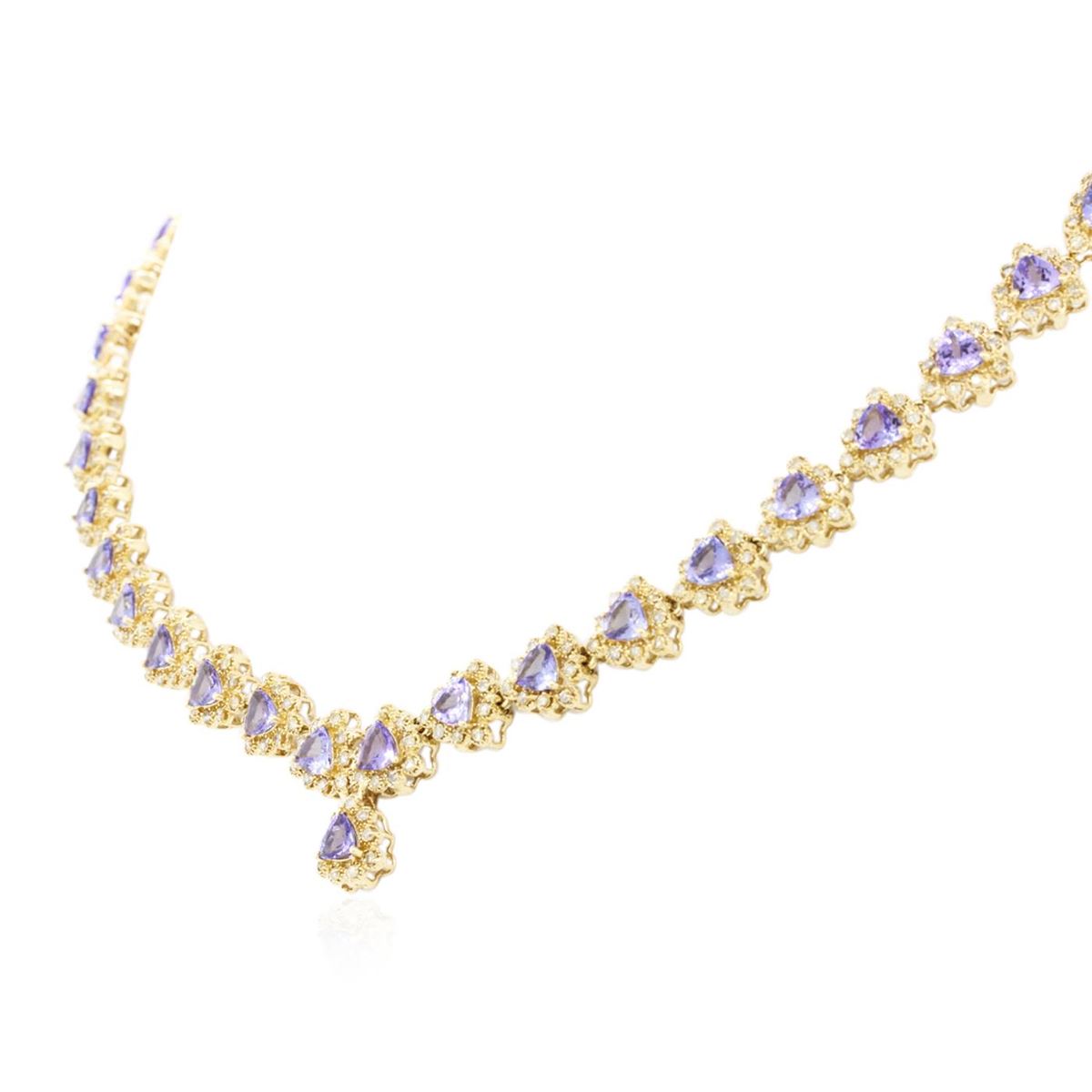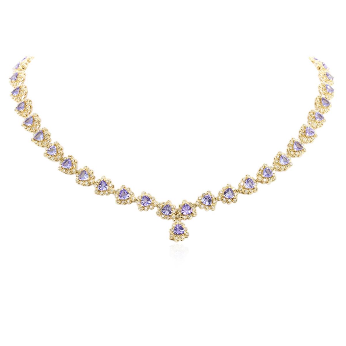 One electronically tested 14KT yellow gold ladies cast & assembled tanzanite & diamond necklace. A flexible ribbon of forty-five tanzanite and diamond clusters set in a continuous chevron inspired design. Eighteen inch length terminating in a concealed clasp with safety. Bright polish finish with milgrain detailing throughout. Identified with markings of 14K. Condition is new, good workmanship. Containing: Forty-five prong set triangle mixed cut natural tanzanites, measuring 5.00 x 5.00 x 2.50mm, approximate total weight of 18.06ct., clarity is eye clean, type I, medium, very slightly grayish, violetish blue color, (GIA vB 5/3) to medium, very slightly grayish, bluish purple, (GIA bP 5/3), cut is good. Transmitting light with no distortion, transparent. Measurements & the color grade are an average for the group. Graded in the setting. Tanzanite is a very rare gemstone that is only found in the country of Tanzania. Originally discovered in 1967. Tiffany & Company, named the stone Tanzanite. It is found in the Usumburu Mountains that border the Umba Valley of northern Tanzania. Tanzanite occurs in gray, brown, violet, blue, reddish-purple, & green. The gem is interesting because of its exceptional pleochroism. Rotated in different directions a tanzanite will exhibit multiple changes of color. Tanzanite has a low tolerance to ultrasonic cleaning, and should not be cleaned using this method. Four hundred five prong set round brilliant cut diamonds, measuring 1.40 - 1.40 x 0.84mm (depth est.) approximate total weight of 405 stones = 4.39ct. Graded in the setting. Clarity: SI-2 to I-2. Color: F-H. Total weight of colored stones 18.06ct. Total weight of diamonds 4.39ct. Total weight of necklace 33.90 grams. AIG Appraised at $32,775.00.