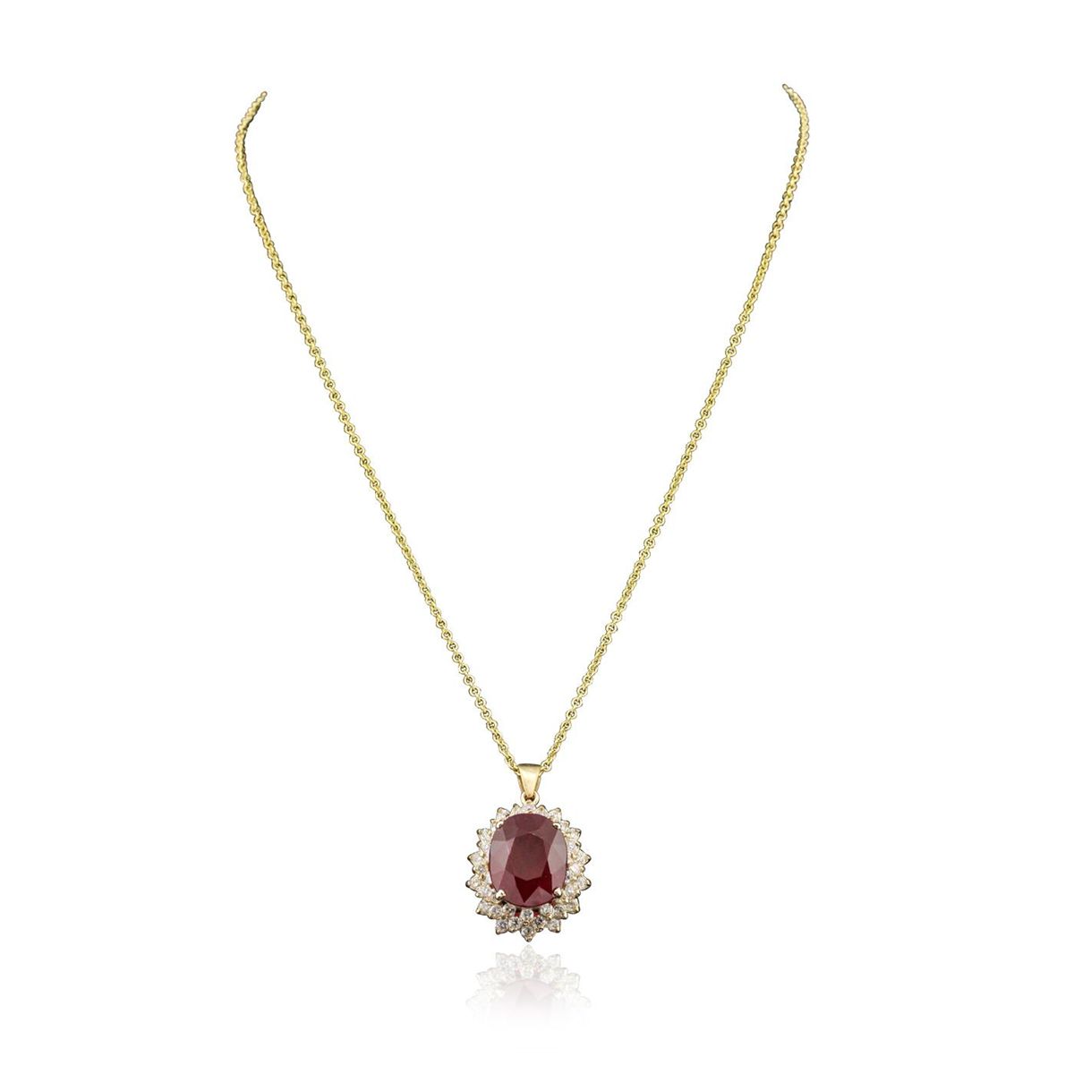 One electronically tested 14KT yellow gold ladies cast & assembled ruby and diamond pendant with chain. The pendant features a ruby set within a stylized diamond floret bezel, completed by a yellow gold bail. The pendant is supported by an eighteen inch length 14KT yellow gold designer style chain, terminating in a lobster claw clasp. Bright and satin finish. Identified with markings of "K14". Condition is new, good workmanship. Containing: One prong set oval mixed cut natural ruby, measuring 16.50 x 13.30 x 9.45mm, 10%. bulge factor, approximate weight of 18.46ct., clarity is heavily included, type II, dark, very slightly brownish, slightly purplish red color, (GIA slpR 7/3), cut is good. Transmitting light somewhat diffusely, transparent to translucent. Naturally occurring internal & external characteristics are present. Indications of laboratory high temperature heat treatment, with glass & flux additives. Graded in the setting. Ruby has a low tolerance to rhodium plating, repolishing the surface, & ultrasonic cleaning. Forty-Two prong set round brilliant cut diamonds, measuring 2.50 - 2.30 x 1.44mm (depth est.) approximate total weight of 42 Stones = 2.22ct. Graded in the setting. Clarity: SI-1 to I-1. Color: G - I. Total Weight of Colored Stones 18.46ct. Total Weight of Diamonds 2.22ct. Total Weight of Pendant With Chain 12.60 grams. AIG Appraised at $11,705.00.