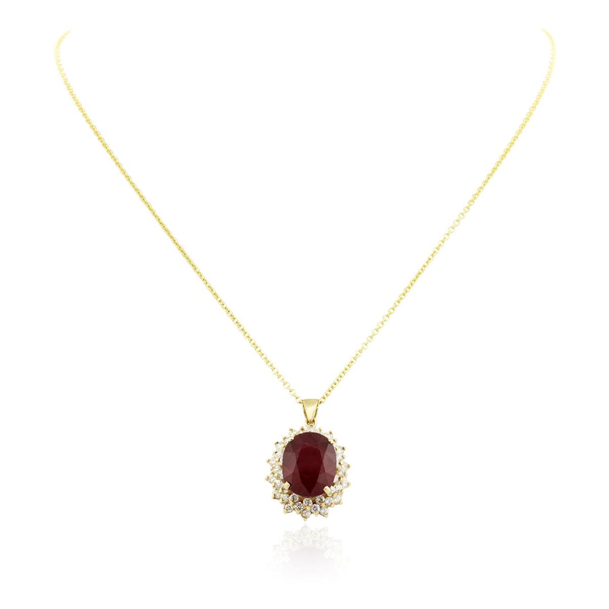 One electronically tested 14KT yellow gold ladies cast & assembled ruby and diamond pendant with chain. The pendant features a ruby set within a stylized diamond floret bezel, completed by a yellow gold bail. The pendant is supported by an eighteen inch length 14KT yellow gold designer style chain, terminating in a lobster claw clasp. Bright and satin finish. Identified with markings of "K14". Condition is new, good workmanship. Containing: One prong set oval mixed cut natural ruby, measuring 16.50 x 13.30 x 9.45mm, 10%. bulge factor, approximate weight of 18.46ct., clarity is heavily included, type II, dark, very slightly brownish, slightly purplish red color, (GIA slpR 7/3), cut is good. Transmitting light somewhat diffusely, transparent to translucent. Naturally occurring internal & external characteristics are present. Indications of laboratory high temperature heat treatment, with glass & flux additives. Graded in the setting. Ruby has a low tolerance to rhodium plating, repolishing the surface, & ultrasonic cleaning. Forty-Two prong set round brilliant cut diamonds, measuring 2.50 - 2.30 x 1.44mm (depth est.) approximate total weight of 42 Stones = 2.22ct. Graded in the setting. Clarity: SI-1 to I-1. Color: G - I. Total Weight of Colored Stones 18.46ct. Total Weight of Diamonds 2.22ct. Total Weight of Pendant With Chain 12.60 grams. AIG Appraised at $11,705.00.