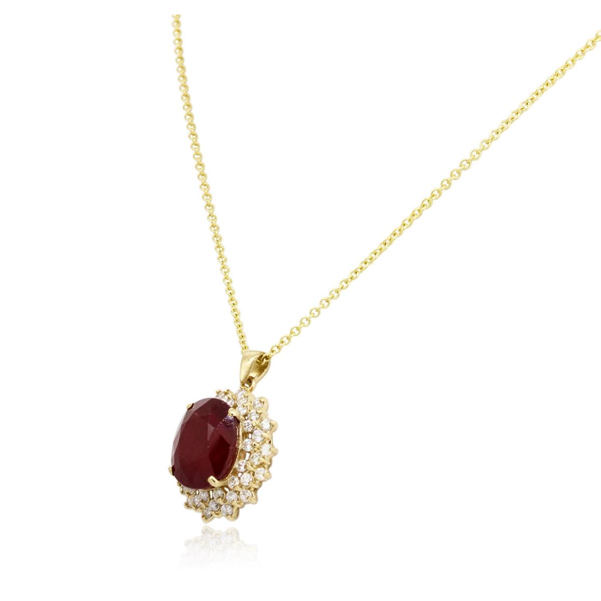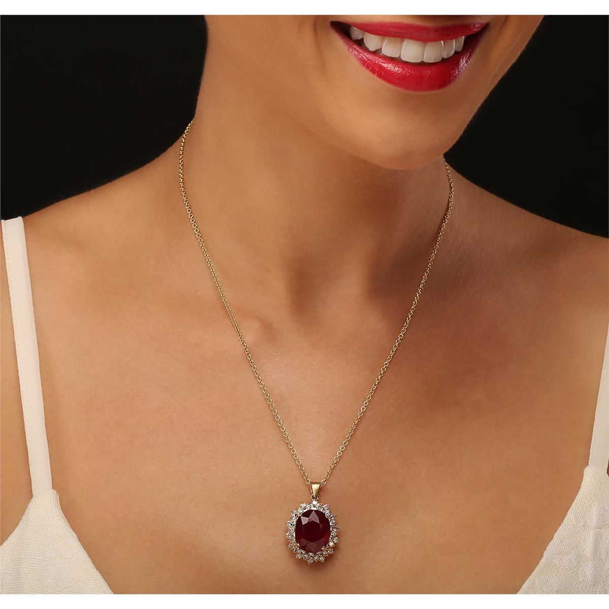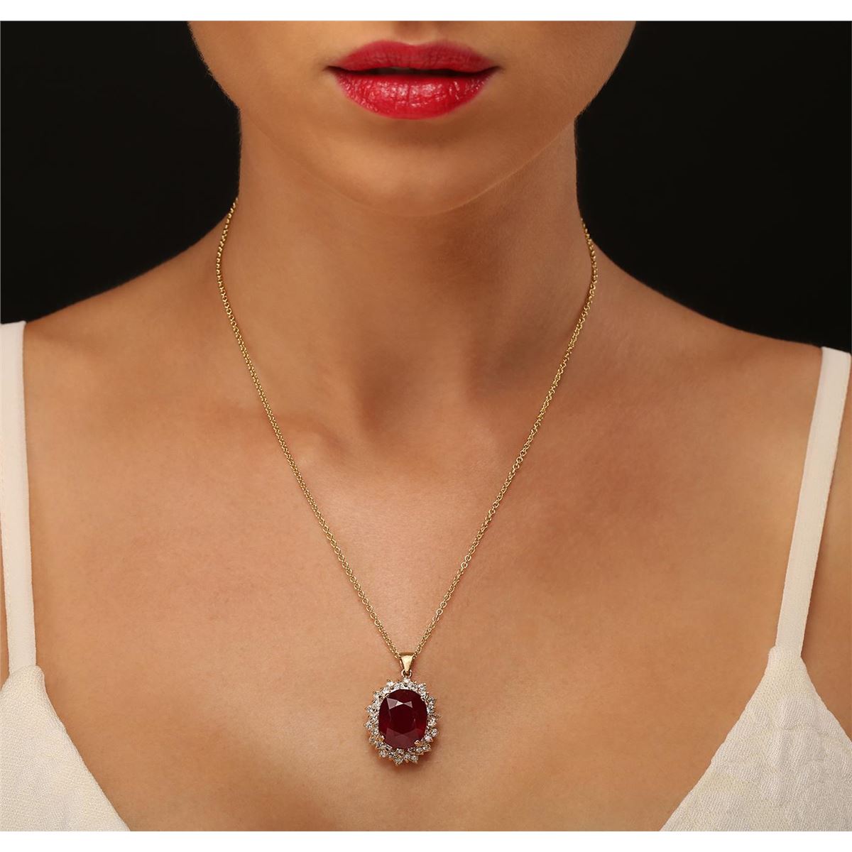 One electronically tested 14KT yellow gold ladies cast & assembled ruby and diamond pendant with chain. The pendant features a ruby set within a stylized diamond floret bezel, completed by a yellow gold bail. The pendant is supported by an eighteen inch length 14KT yellow gold designer style chain, terminating in a lobster claw clasp. Bright and satin finish. Identified with markings of "K14". Condition is new, good workmanship. Containing: One prong set oval mixed cut natural ruby, measuring 16.50 x 13.30 x 9.45mm, 10%. bulge factor, approximate weight of 18.46ct., clarity is heavily included, type II, dark, very slightly brownish, slightly purplish red color, (GIA slpR 7/3), cut is good. Transmitting light somewhat diffusely, transparent to translucent. Naturally occurring internal & external characteristics are present. Indications of laboratory high temperature heat treatment, with glass & flux additives. Graded in the setting. Ruby has a low tolerance to rhodium plating, repolishing the surface, & ultrasonic cleaning. Forty-Two prong set round brilliant cut diamonds, measuring 2.50 - 2.30 x 1.44mm (depth est.) approximate total weight of 42 Stones = 2.22ct. Graded in the setting. Clarity: SI-1 to I-1. Color: G - I. Total Weight of Colored Stones 18.46ct. Total Weight of Diamonds 2.22ct. Total Weight of Pendant With Chain 12.60 grams. AIG Appraised at $11,705.00.
