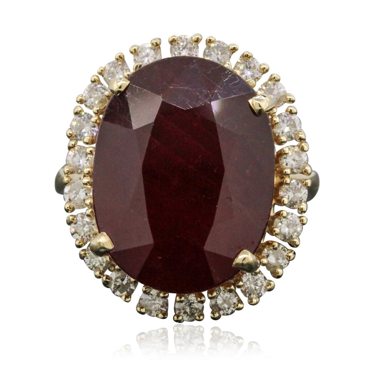 One electronically tested 14KT yellow gold ladies cast ruby and diamond ring with a bright polish finish. Condition is new, good workmanship. The featured ruby is set within a diamond bezel, completed by a two and one-half millimeter wide band. Identified with markings of "K14". Containing: One prong set oval mixed cut natural ruby, measuring 17.50 x 13.50 x 9.00mm, 8%. bulge factor, approximate weight of 18.68ct., clarity is heavily included, type II, dark, very slightly brownish, slightly purplish red color, (GIA slpR 7/3), cut is good. Transmitting light somewhat diffusely, transparent to translucent. Naturally occurring internal & external characteristics are present. Indications of laboratory high temperature heat treatment, with glass & flux additives. Graded in the setting. Ruby has a low tolerance to rhodium plating, repolishing the surface, & ultrasonic cleaning. Twenty-Two prong set round brilliant cut diamonds, measuring 2.25 - 2.20 x 1.34mm (depth est.) approximate. Total Weight of 22 Stones = 0.98ct. Graded in the setting. Clarity: SI-1 to I-1. Color: G - I. Total Weight of Colored Stones 18.68ct. Total Weight of Diamonds 0.98ct. Total Weight of Ring 12.61gm. AIG Appraised at $8,335.00.