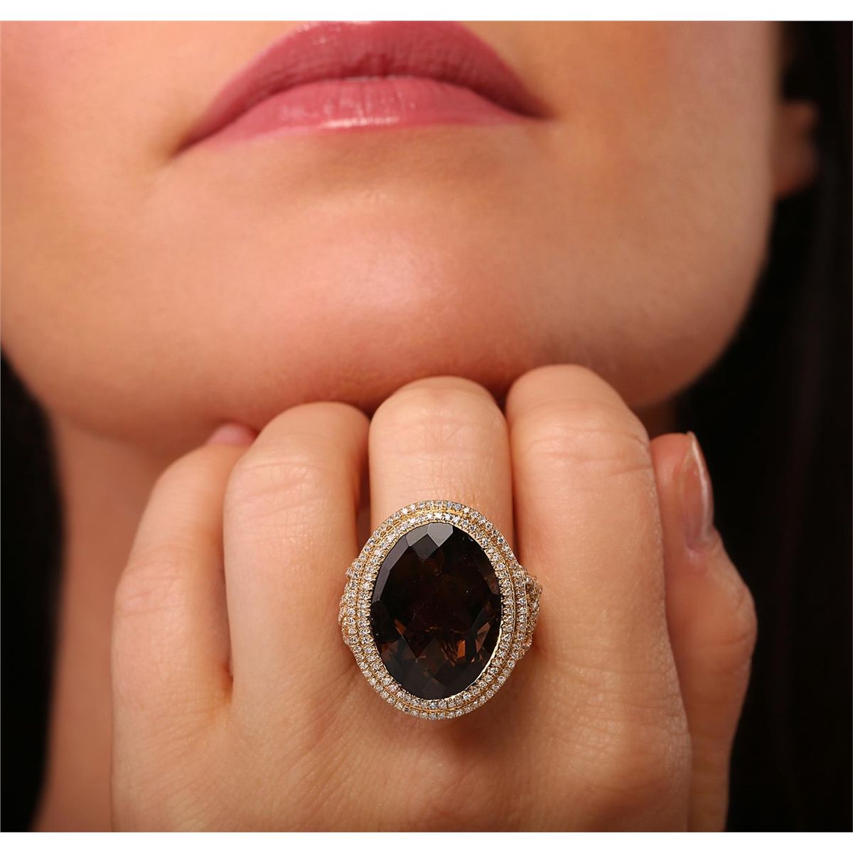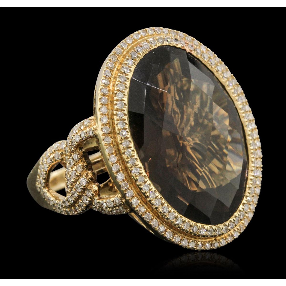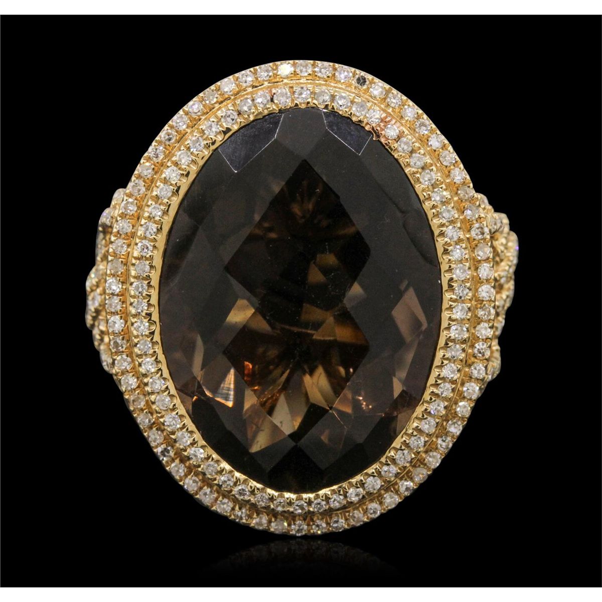 One electronically tested 14KT yellow gold ladies combination cast & assembled ring with a bright polish finish. Identified with markings of "14K". Condition is new. Containing: One prong set oval modified brilliant cut natural smoky quartz, measuring 22.00 x 16.00 x 10.00mm, approximate weight of 18.72ct., clarity is eye clean, medium light, moderately strong, brown color, (GIA Br 4/4), cut is good. One Hundred Twenty-Four prong set single cut diamonds, measuring 1.00 - 1.00 x 0.60mm (depth est.) approximate total weight of 124 Stones = 0.45ct. Clarity: SI-2. Color: J, Cut is Good. Colored gemstones are presumed to have been subjected to commonly used enhancement processes. All diamonds and colored gemstones are graded in the mounting, unless otherwise stated. Total Weight of Colored Stones 18.72ct. Total Weight of Diamonds 0.45ct. Total Weight of Ring 12.50 grams. GGL Appraised at $6,395.00.