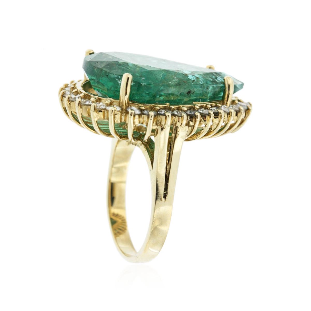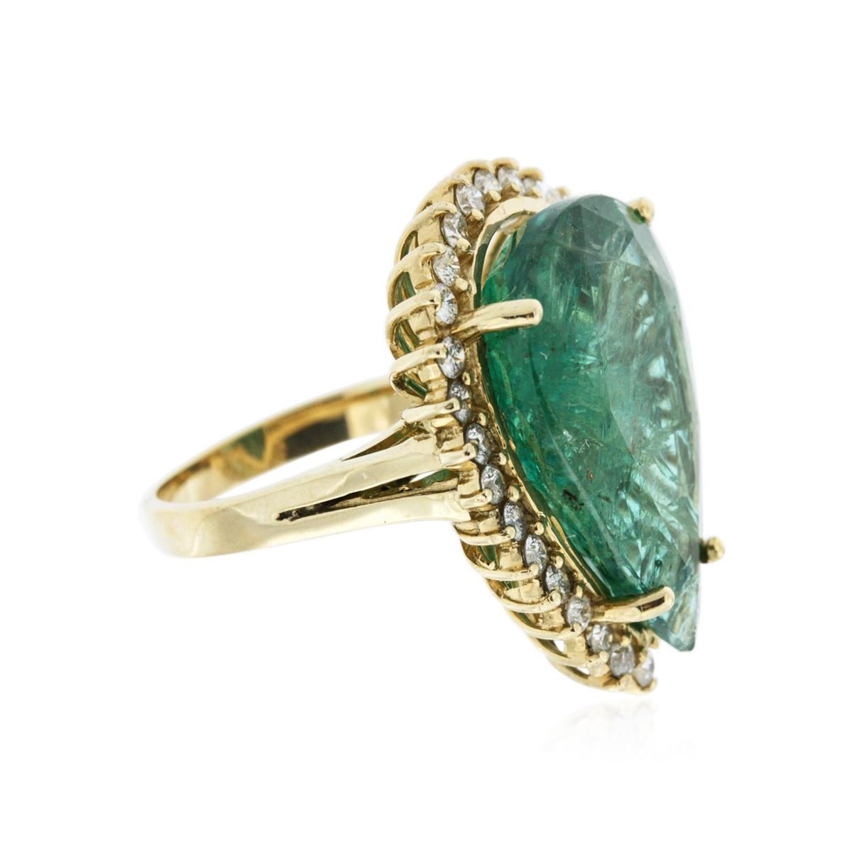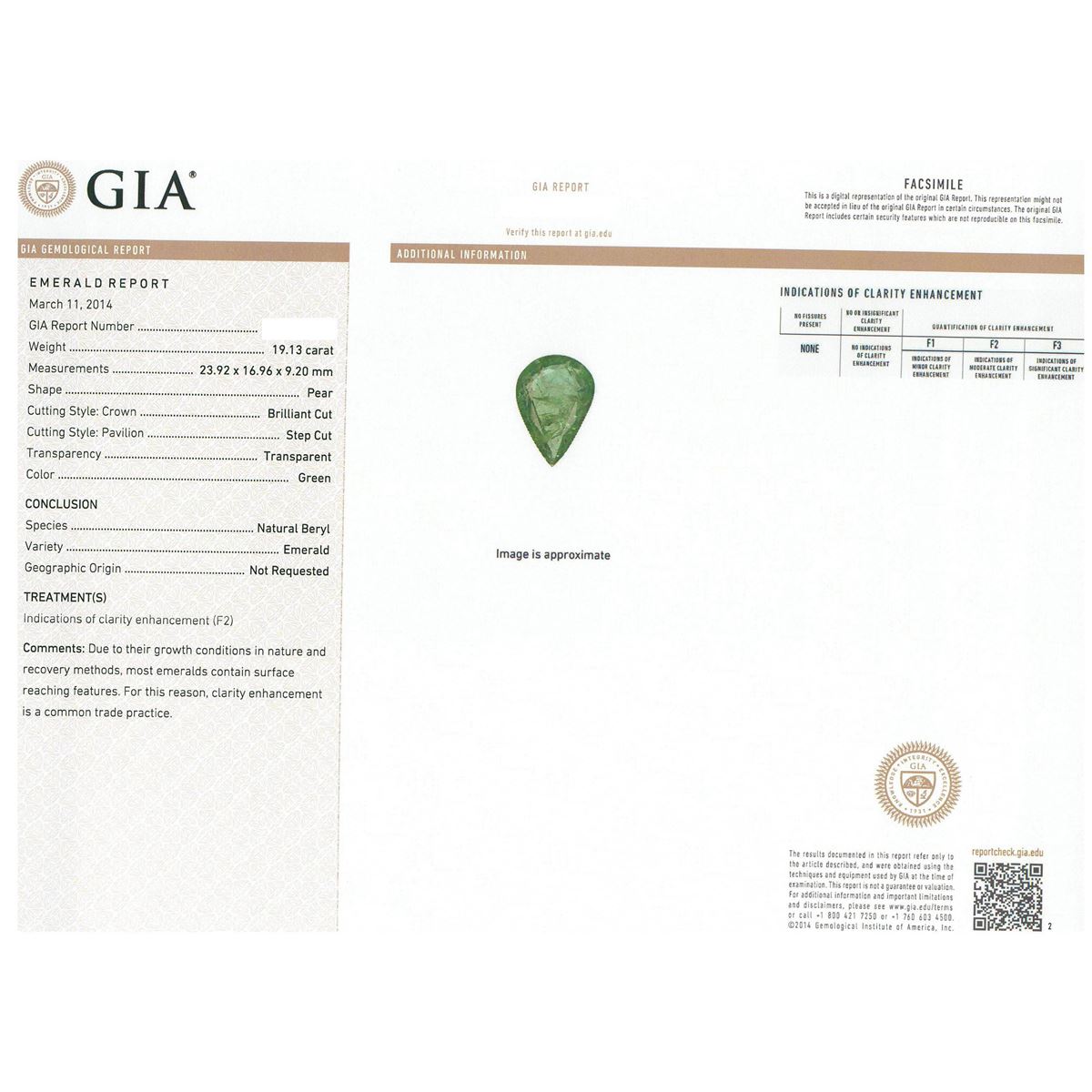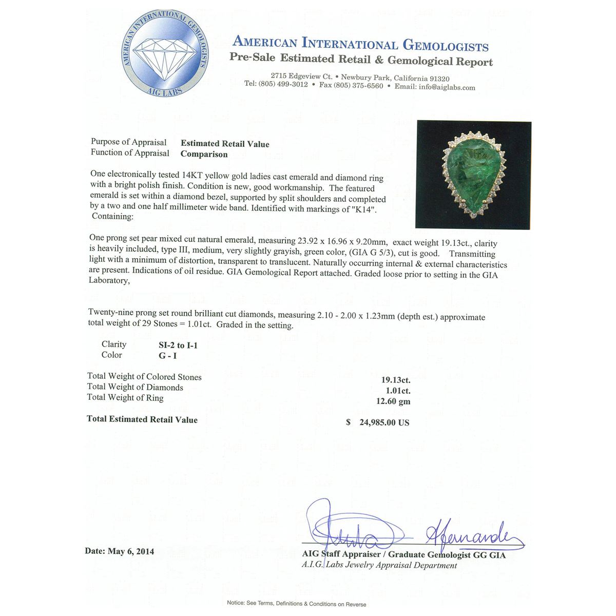 One electronically tested 14KT yellow gold ladies cast emerald and diamond ring with a bright polish finish. Condition is new, good workmanship. The featured emerald is set within a diamond bezel, supported by split shoulders and completed by a two and one half millimeter wide band. Identified with markings of "K14". Containing: One prong set pear mixed cut natural emerald, measuring 23.92 x 16.96 x 9.20mm, exact weight 19.13ct., clarity is heavily included, type III, medium, very slightly grayish, green color, (GIA G 5/3), cut is good. Transmitting light with a minimum of distortion, transparent to translucent. Naturally occurring internal & external characteristics are present. Indications of oil residue. GIA Gemological Report attached. Graded loose prior to setting in the GIA Laboratory, Report #2151952110.Twenty-Nine prong set round brilliant cut diamonds, measuring 2.10 - 2.00 x 1.23mm (depth est.) approximate. Total Weight of 29 Stones = 1.01ct. Graded in the setting. Clarity: SI-2 to I-1. Color: G - I. Total Weight of Colored Stones 19.13ct. Total Weight of Diamonds 1.01ct. Total Weight of Ring 12.60 grams. AIG Appraised at $24,985.00.